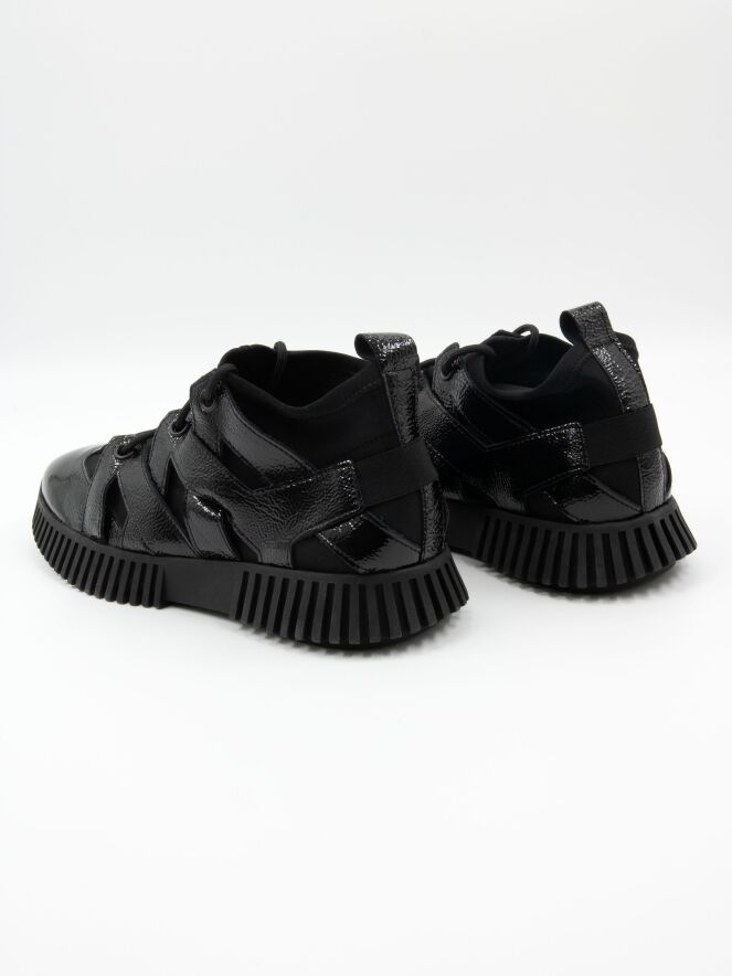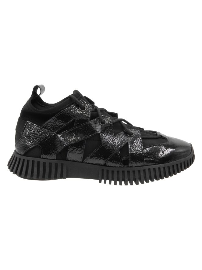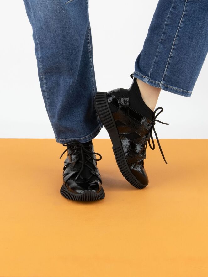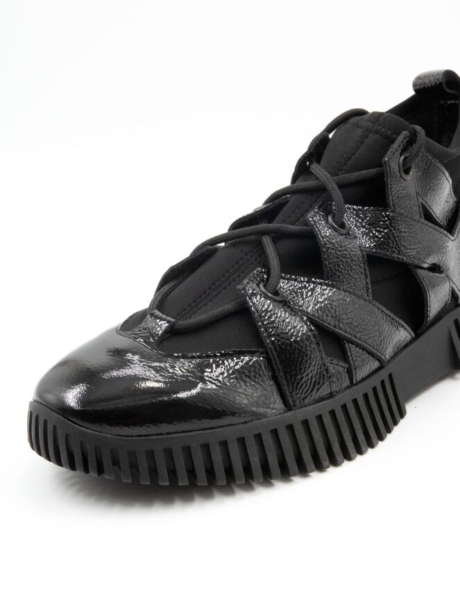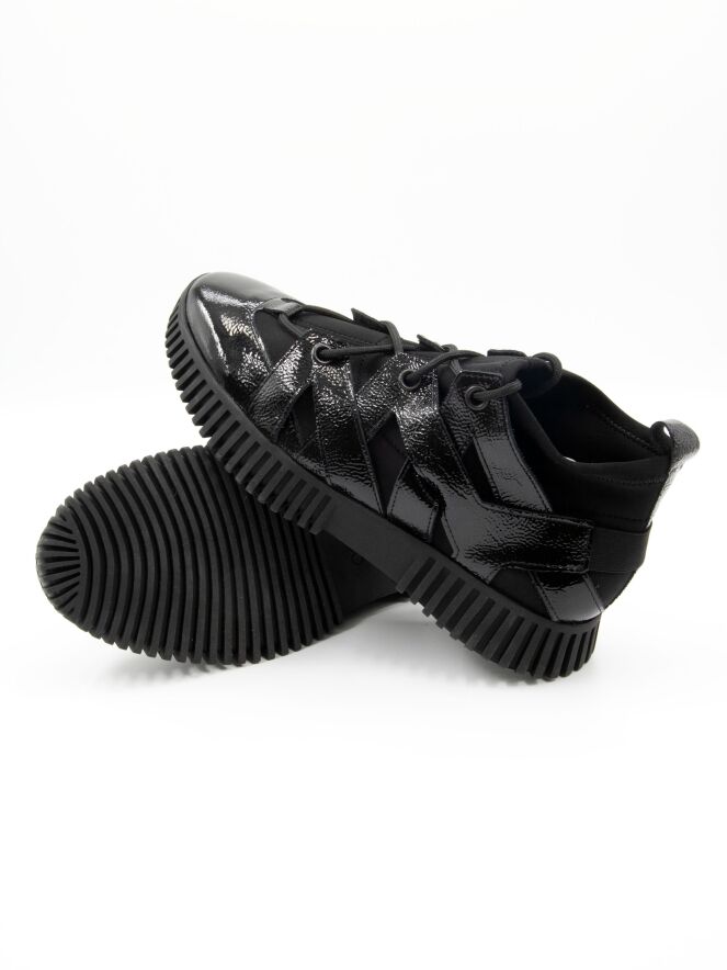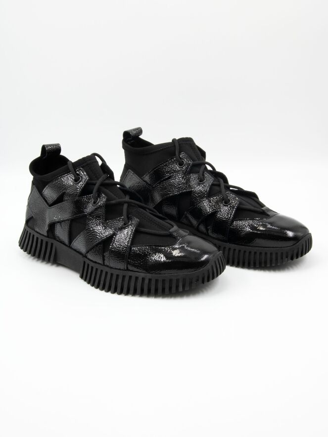Ein Designer-Sneaker von Arche aus Lackleder mit einer wasserdichten schwarzen Socke. Das Lackleder ist in diagonalen Bahnen an den Seiten verarbeitet und hat eine runde Zehenkappe. Hinten ist das Leder mit einem elastischen Band verbunden. Die schwarze Sohle ist geriffelt.