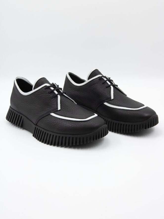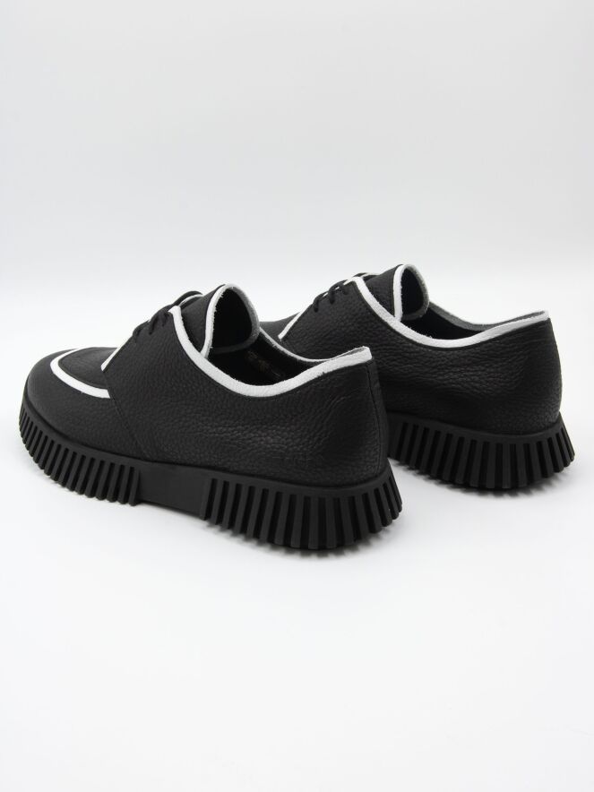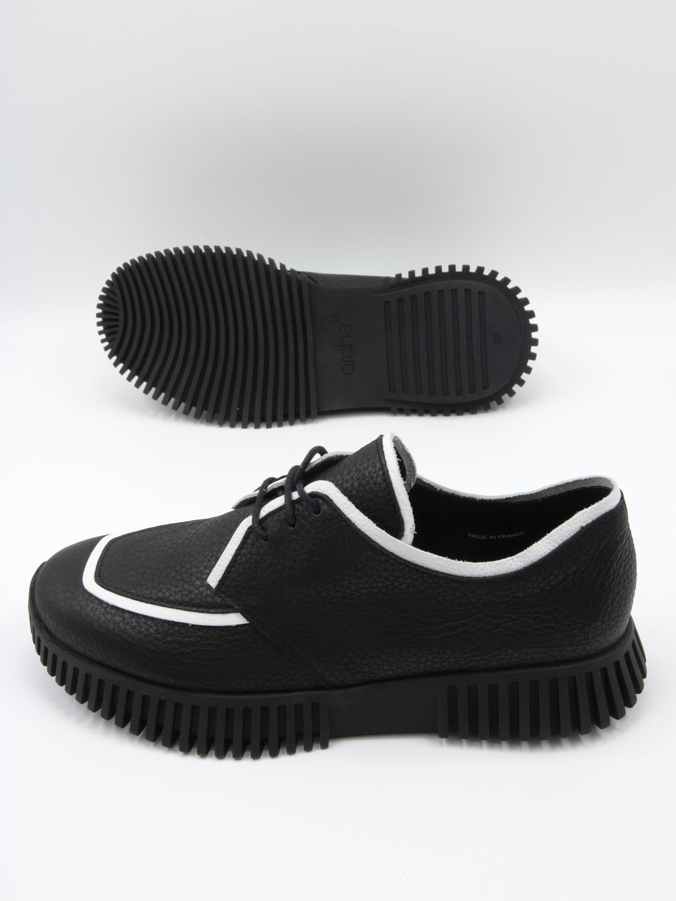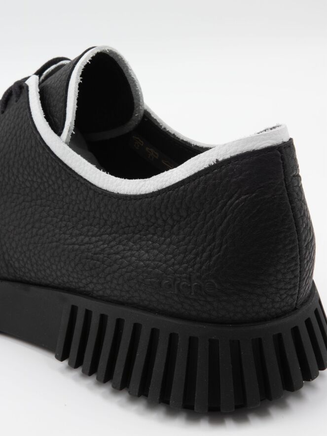 Ein Schnürschuh von Arche auf einer Plateausohle mit gezackten Seiten. Der Schuh ist in Schwarz. Entlang des Randes des Vorderfußes und des Schaftes bis zu den Schnürsenkeln befindet sich eine weiße Biese. Der Schuh ist ungefüttert.