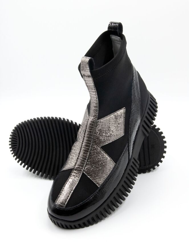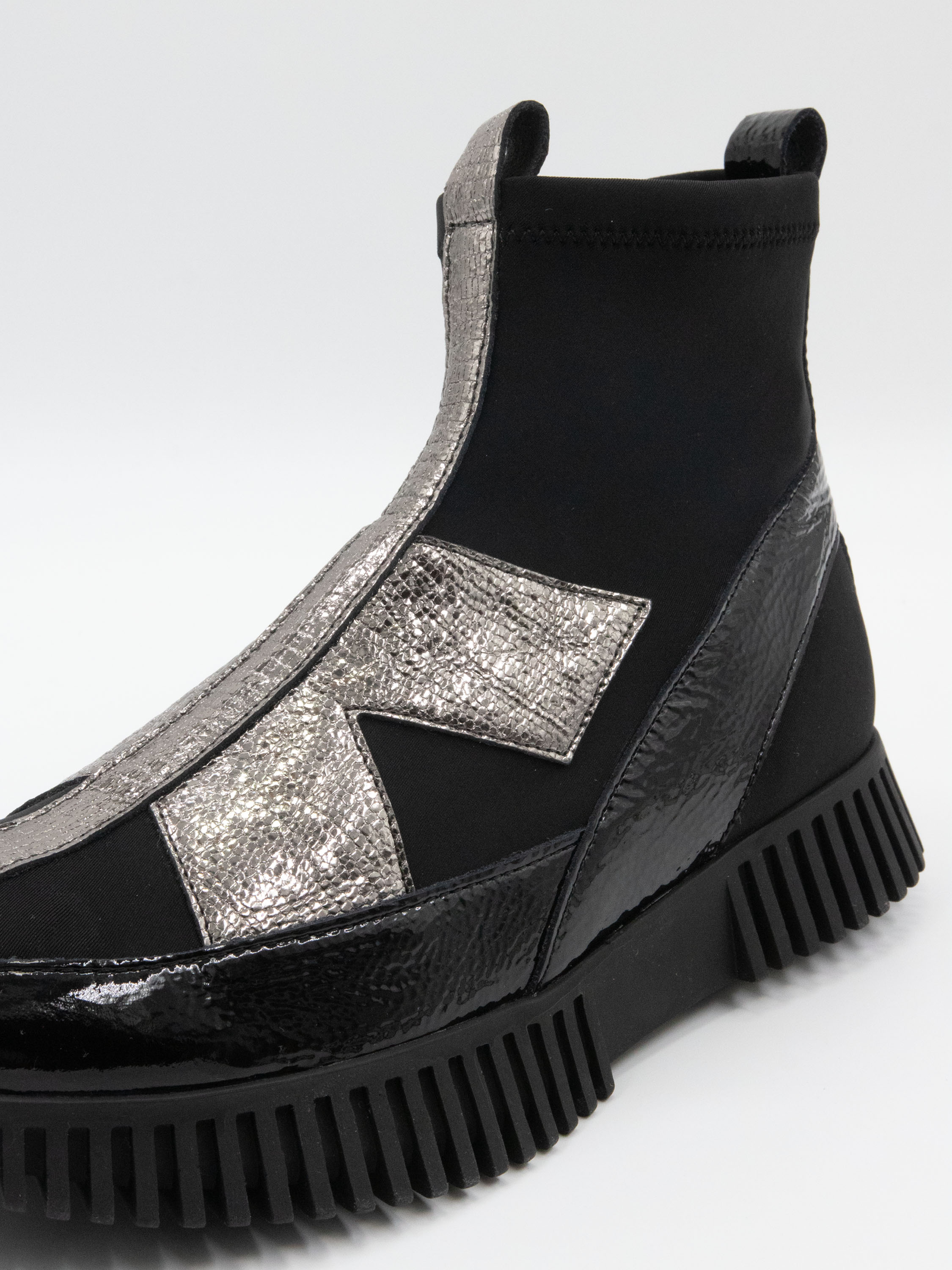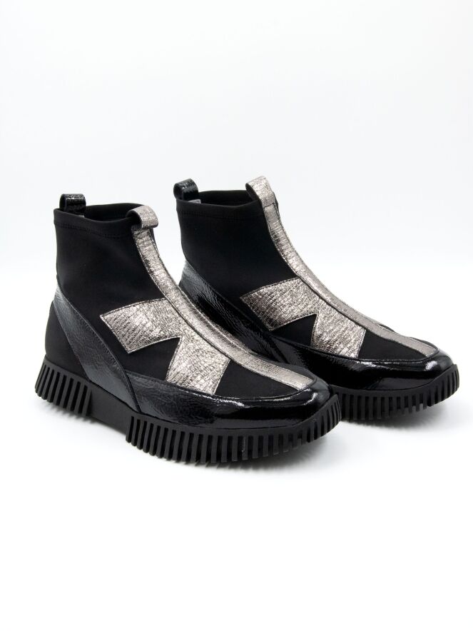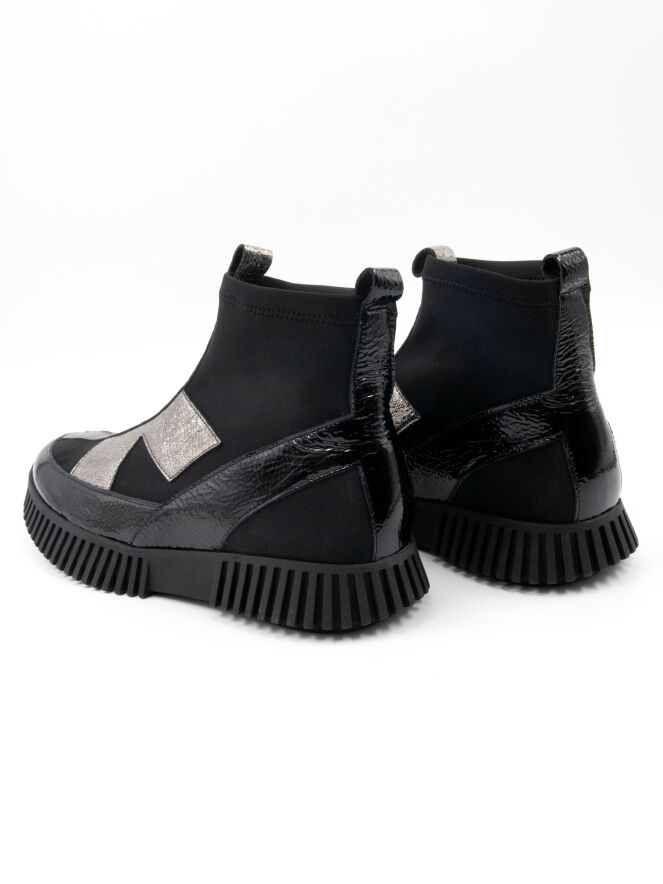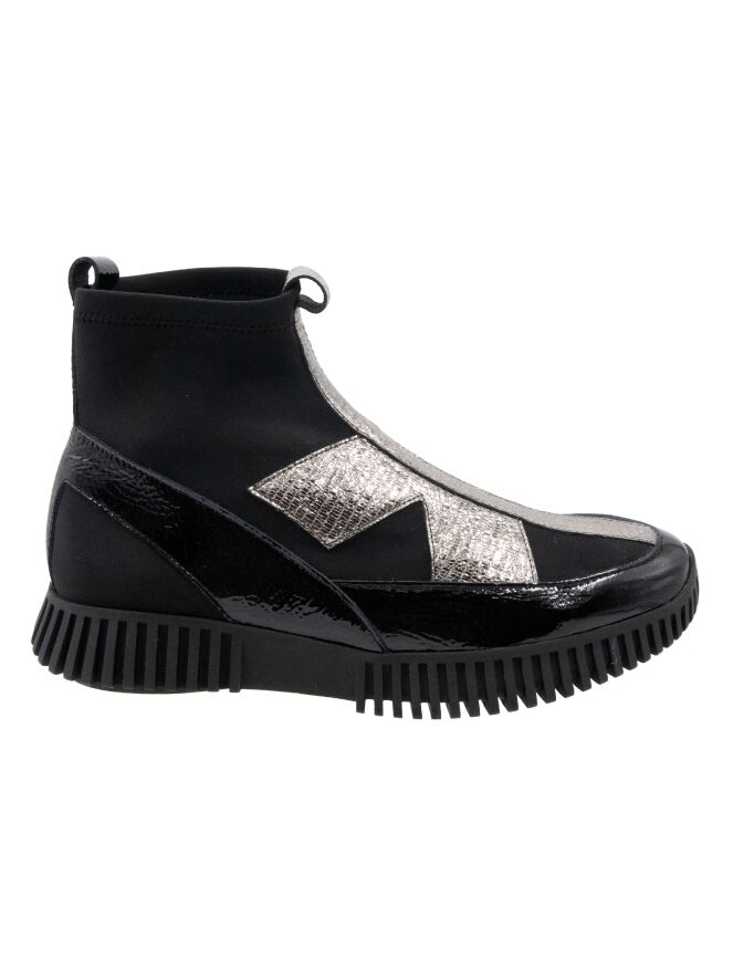 Ein hoher Design-Sneaker von Arche in Silber mit schwarzem Gummiband und schwarzem Lackleder. Der Sneaker ist aus weichem Timberleder und einem elastischen Stoff gefertigt. Die schwarze Sohle hat ein gerades Profil.