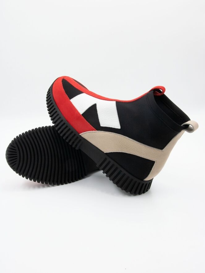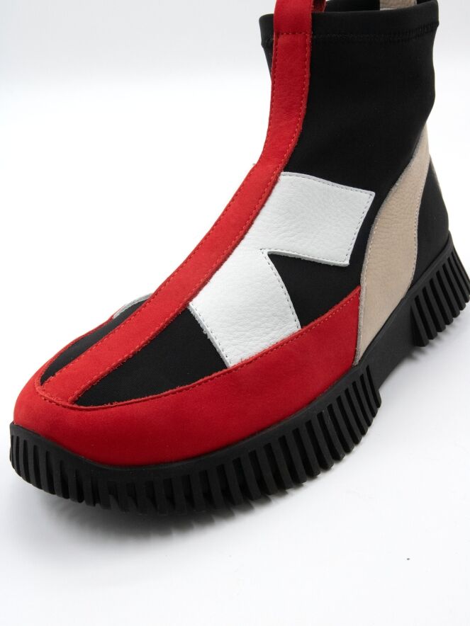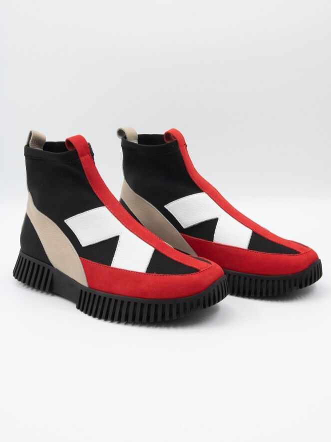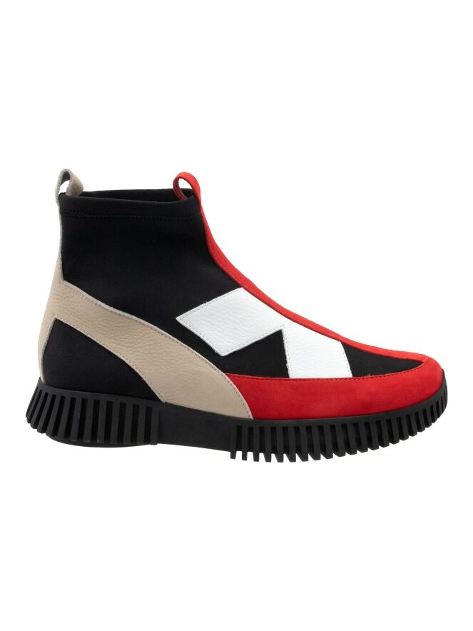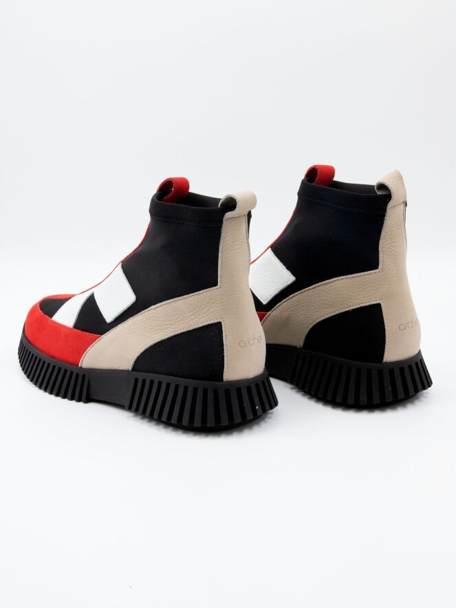 Ein hoher Design-Sneaker von Arche aus Leder in den Farben Rot, Cremeweiß und Weiß auf schwarzem Hintergrund. Der Sneaker besteht aus weichem Timberleder und elastischem Stoff. Die schwarze Sohle hat ein gerades Profil.