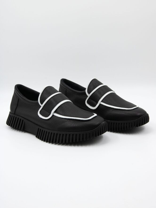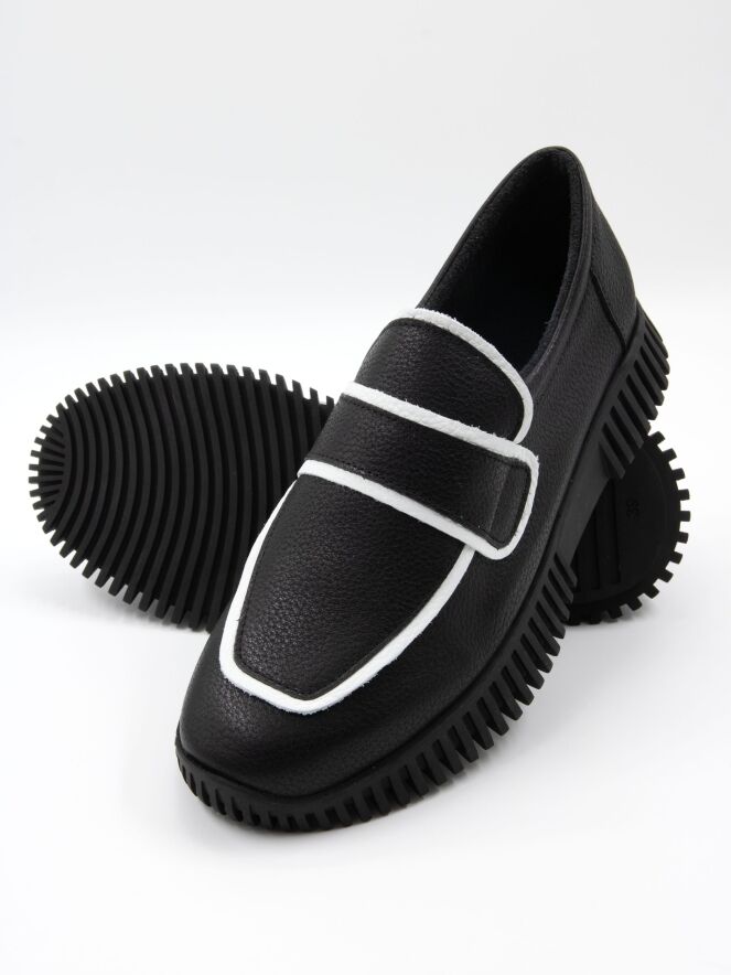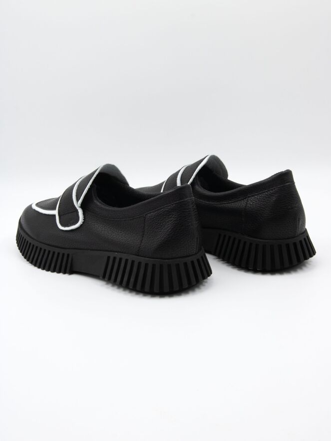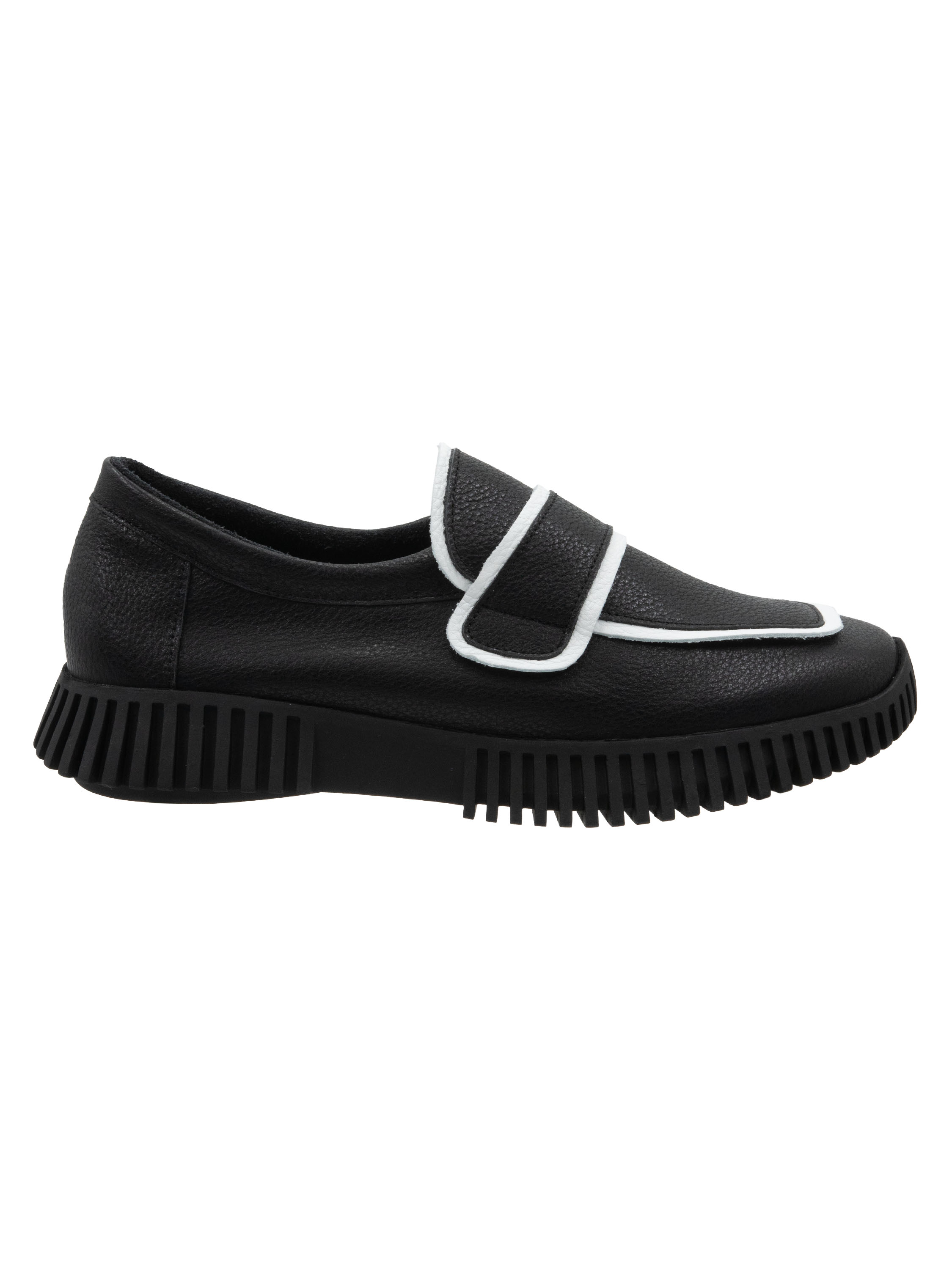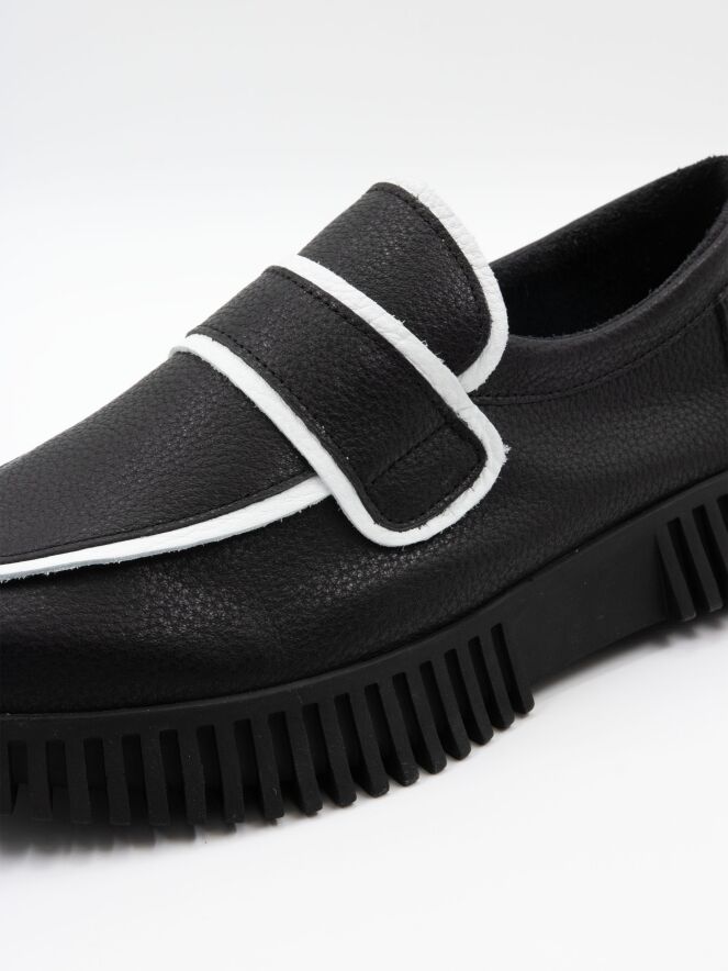 Ein Slipper von Arche auf einer Plateausohle mit gezackten Seiten. Der Schuh ist schwarz mit einem weißen Besatz am Rand des Vorfußes. Der Schuh ist ungefüttert.