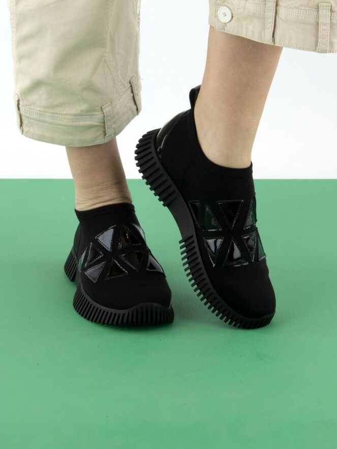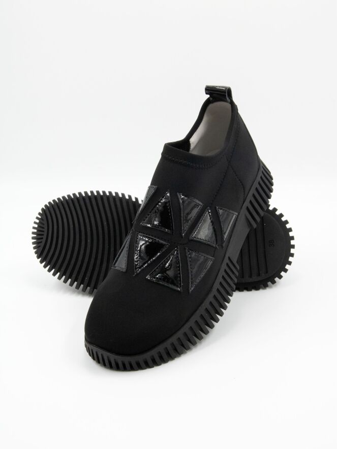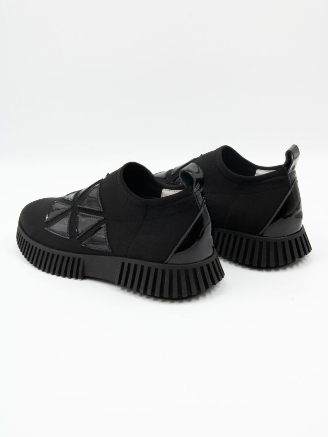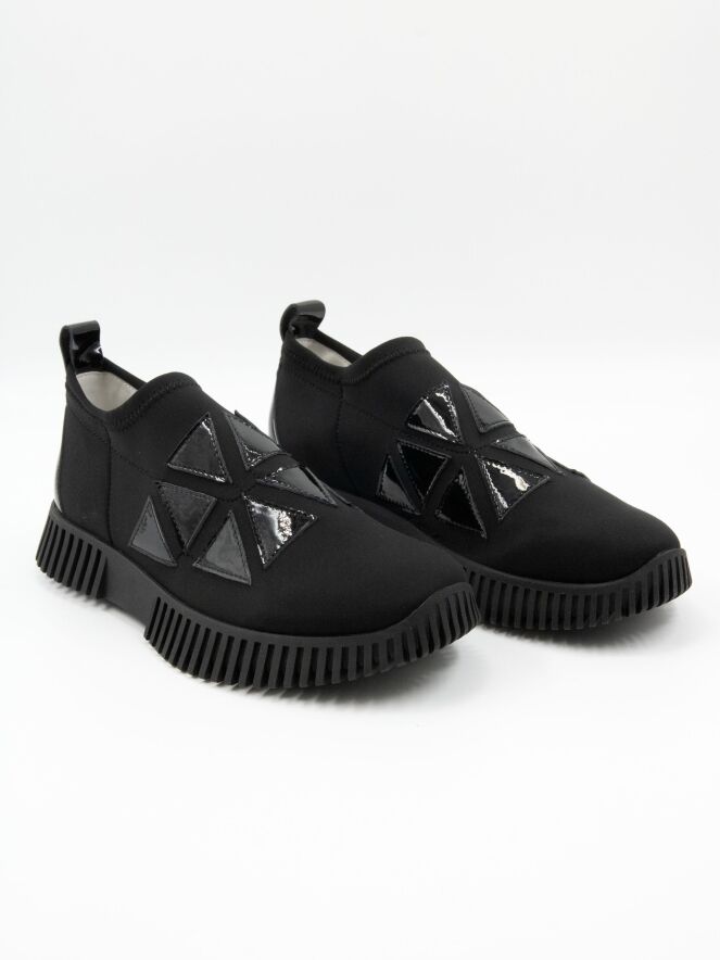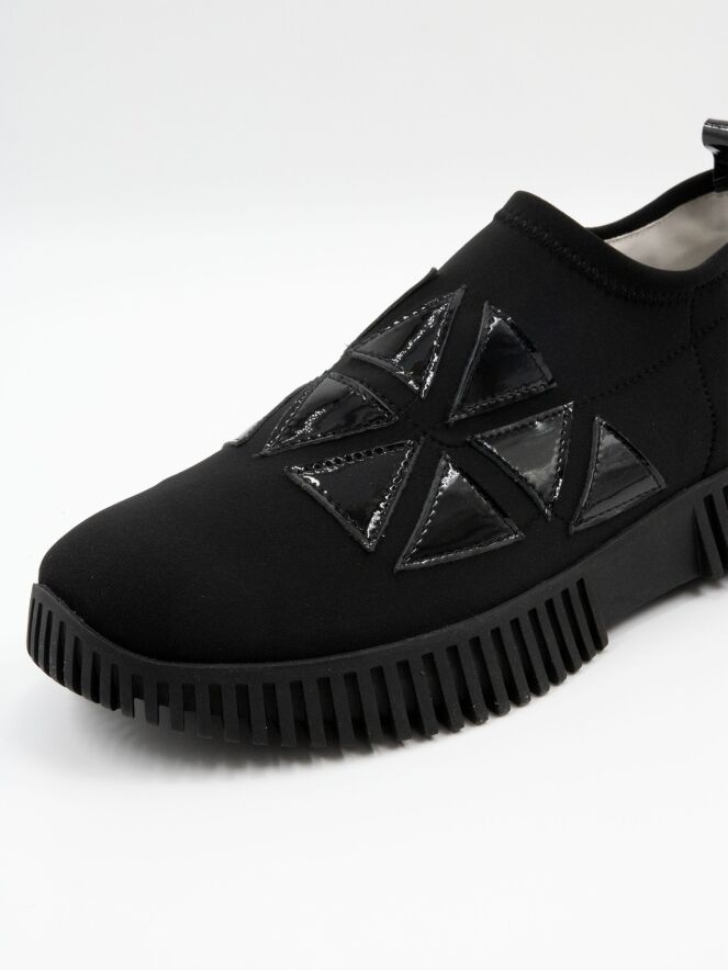 Ein Slipper von Arche aus schwarzem Stoff, verziert mit einem Dreiecksmuster aus schwarzem Lackleder. Die Ferse ist ebenfalls in schwarzem Lackleder ausgeführt. Die schwarze Sohle ist geriffelt.