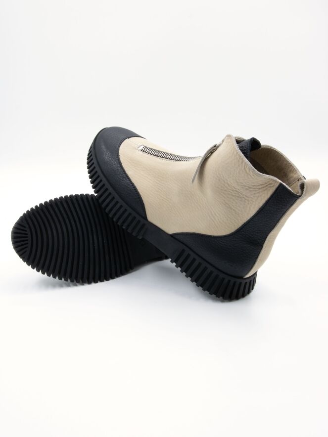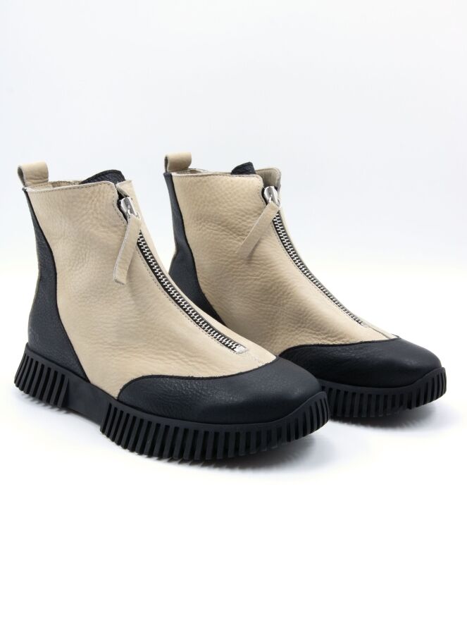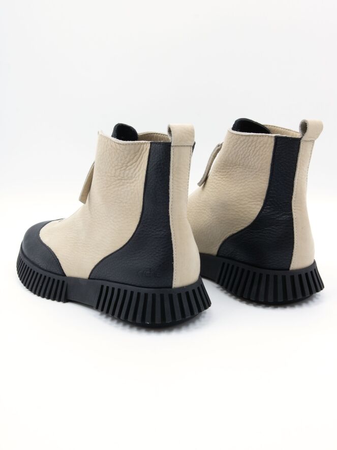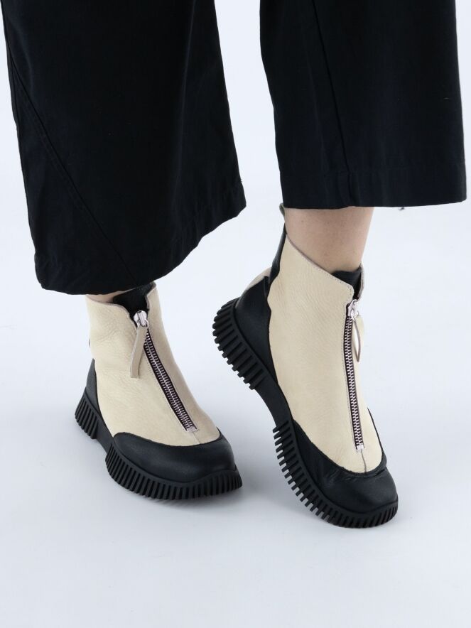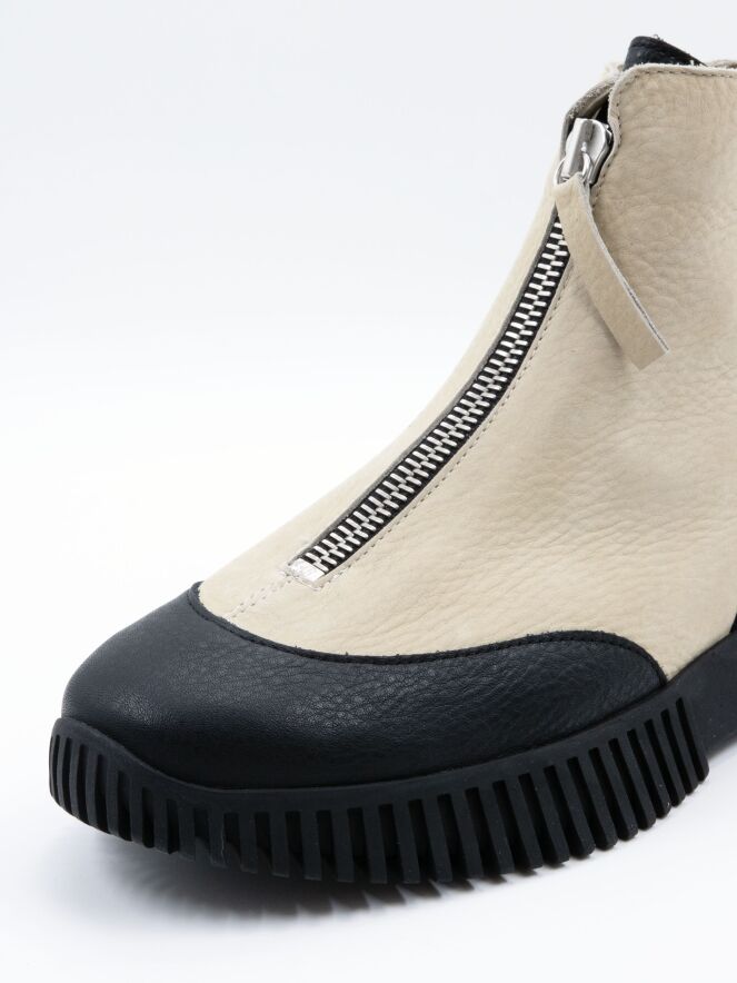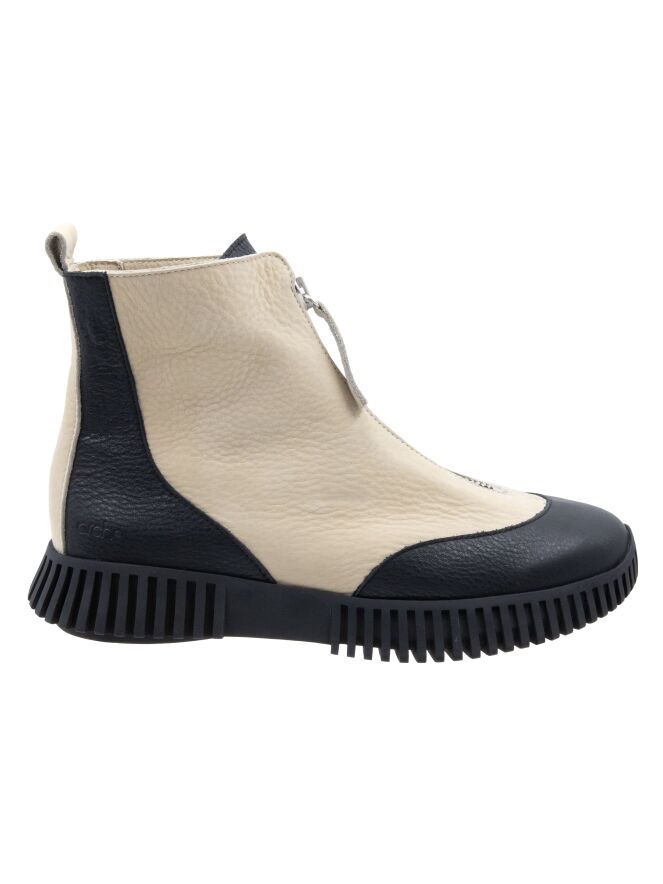 Kurzes Stiefelettenmodell von Arche in Cremeweiß und Schwarz. Die Spitze und die Ferse sind aus schwarzem Leder gefertigt. Über dem Spann verläuft ein silberfarbener Reißverschluss. An der Ferse befindet sich eine cremeweiße Blende. Innen ungefüttert.