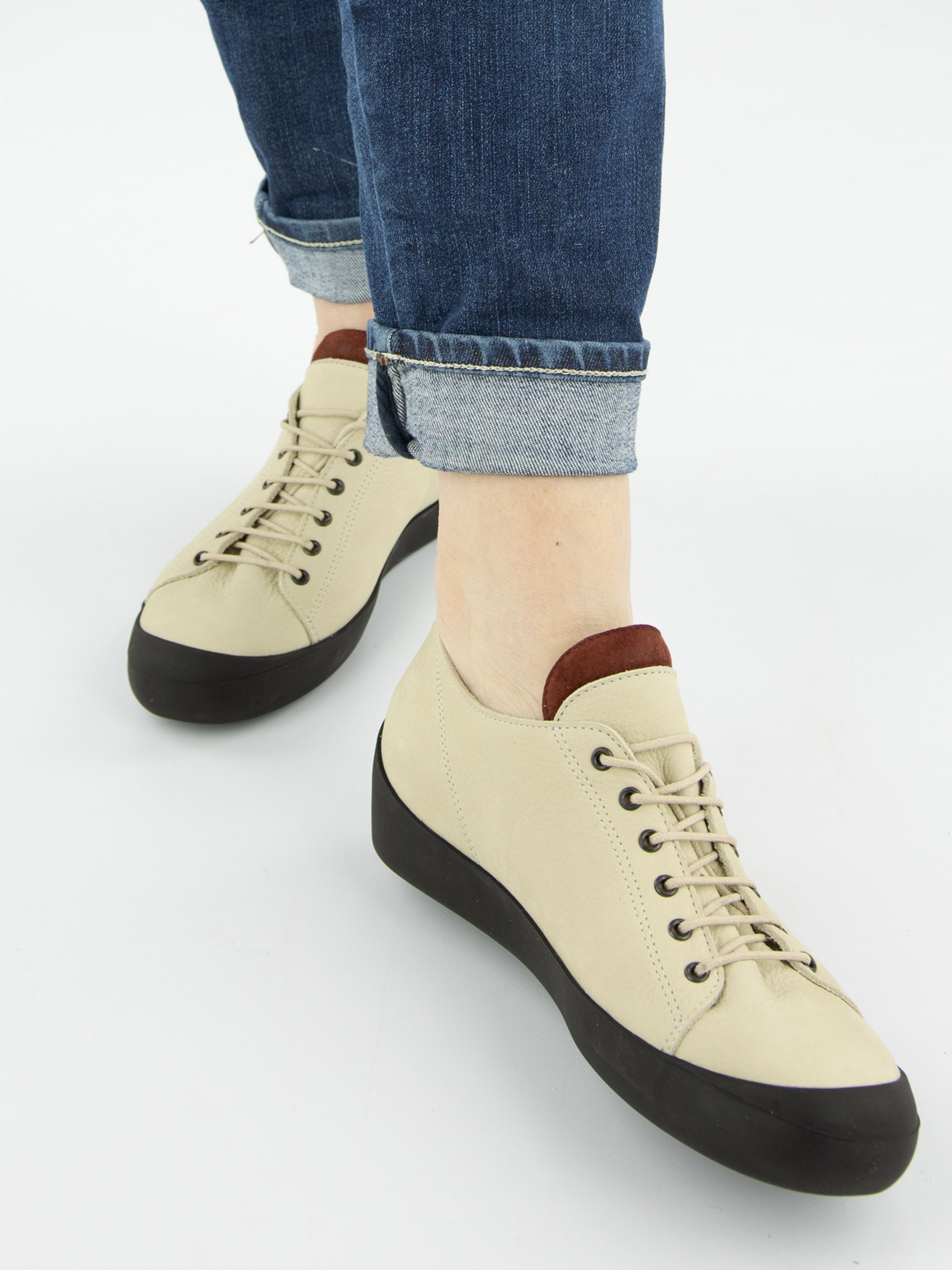 Ein Schnürschuh von Arche in der Farbe Cremeweiß. Die Latexsohle ist schwarz. Das Innere ist ungefüttert.