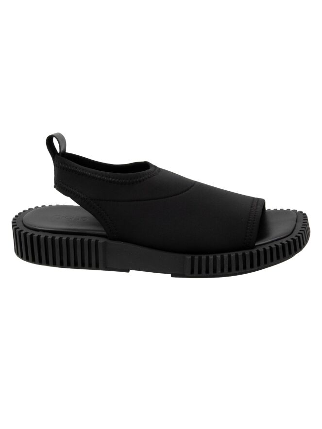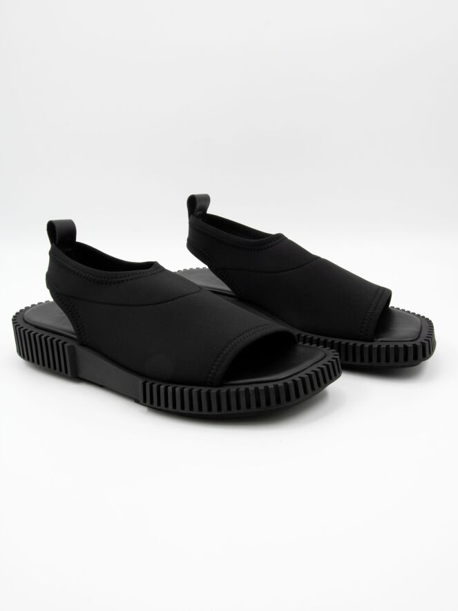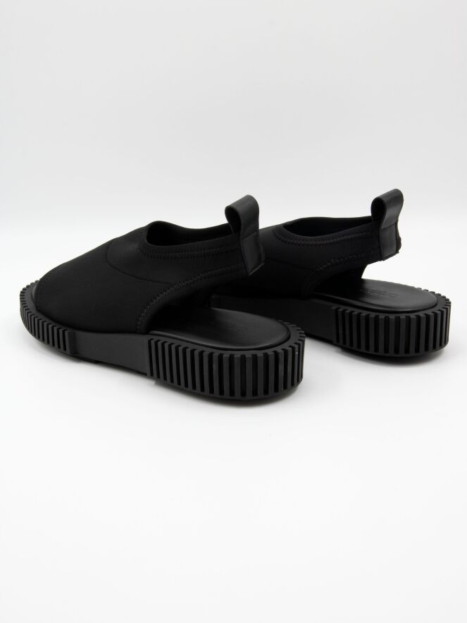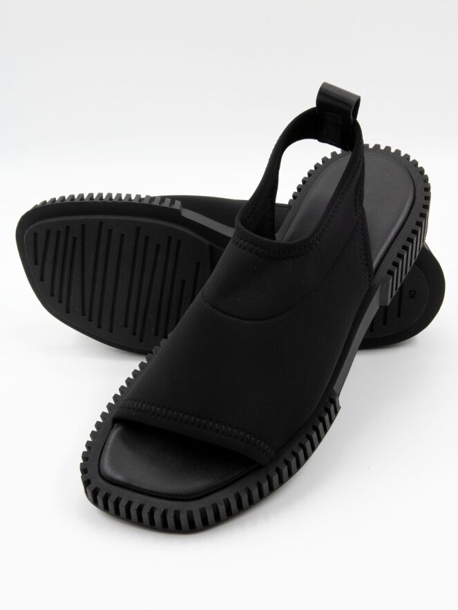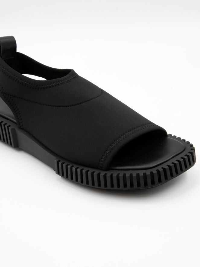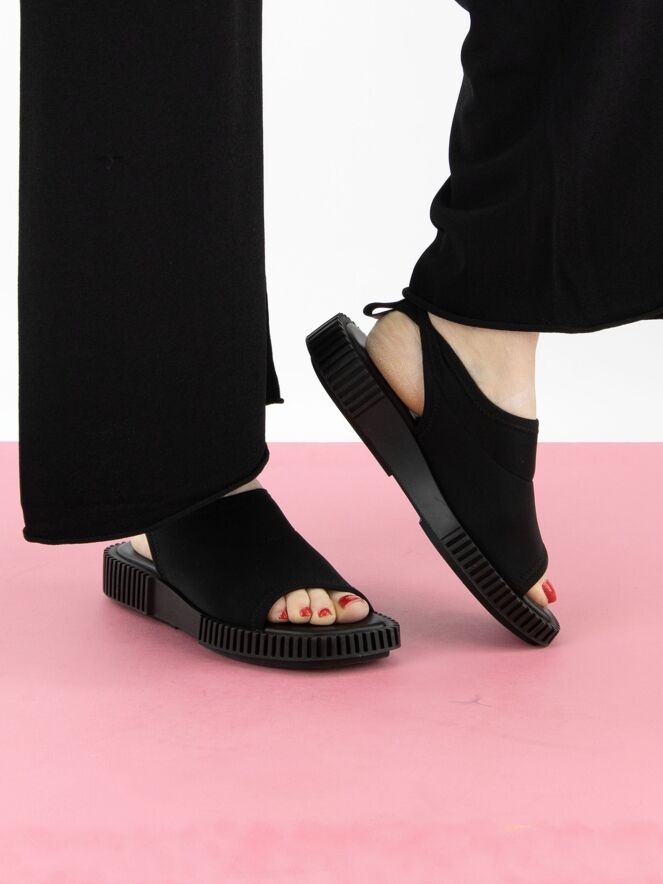 Eine Sandale von Arche in Schwarz. Die Sandale besteht aus einem leicht elastischen Stoff, und das Fußbett ist aus Leder. Die Sohle ist entlang der Ränder geriffelt.
