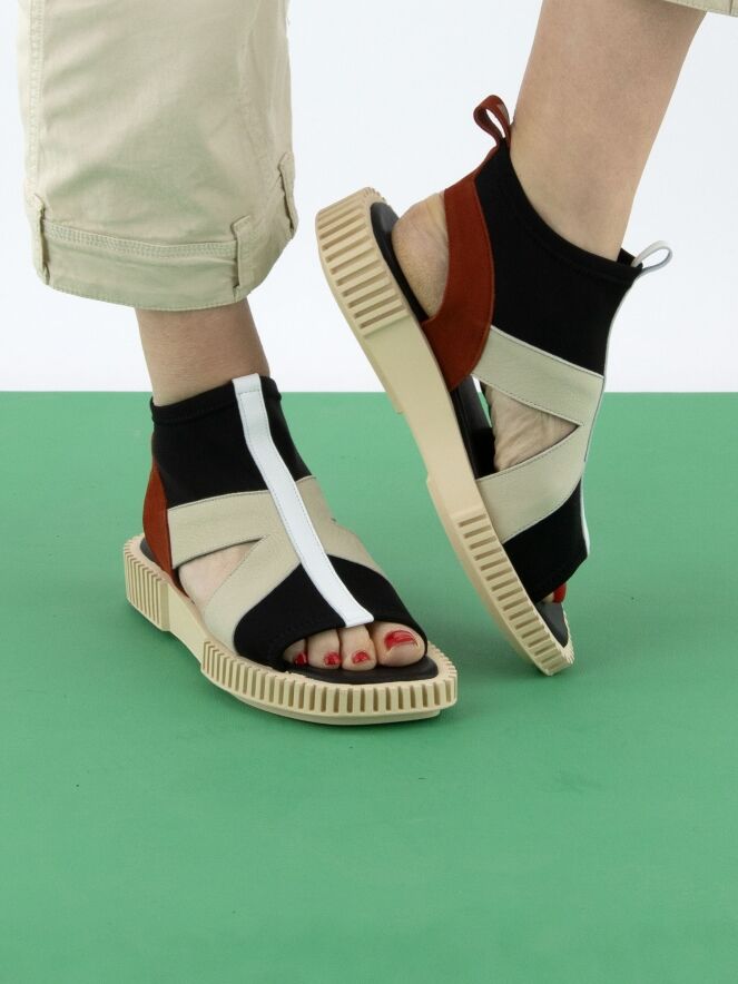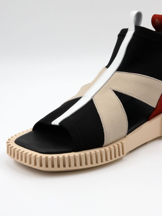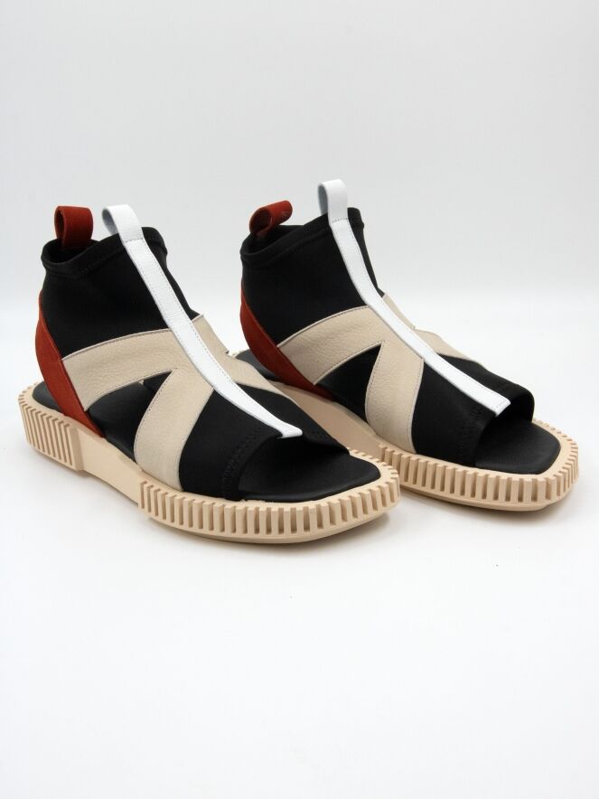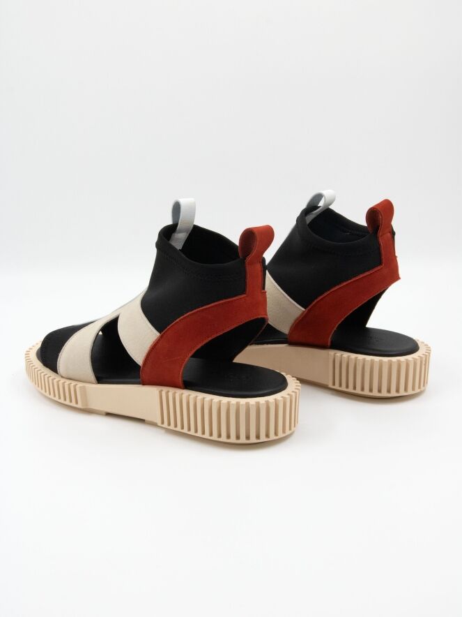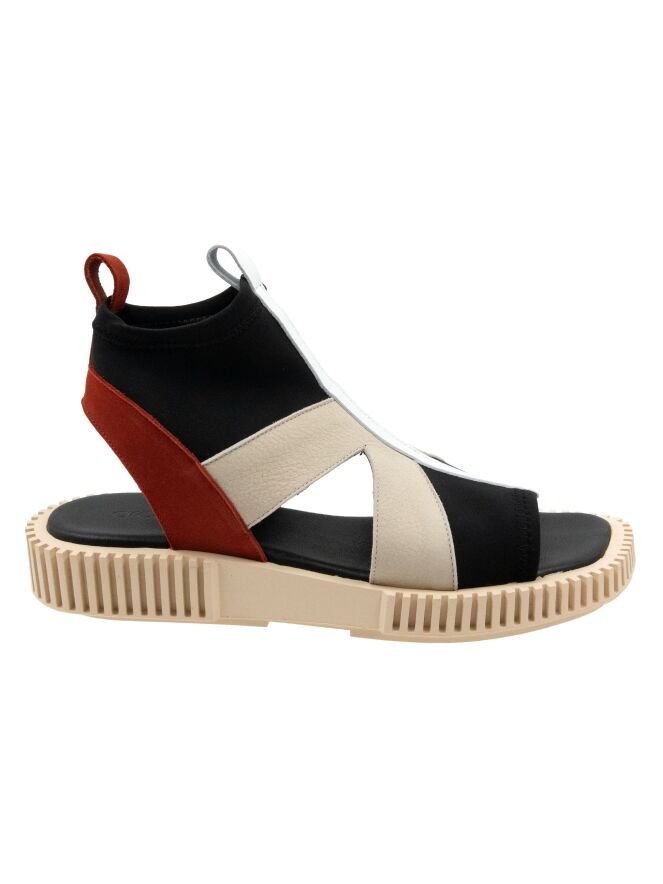 Eine Sandale von Arche mit offener Ferse, aus einer Kombination von elastischem Stoff, Leder und Nubukleder in Schwarz, Rot und Cremeweiß. Die cremeweiße Sohle ist fein gezackt. Das Lederfußbett ist in Schwarz gehalten.