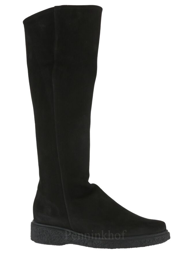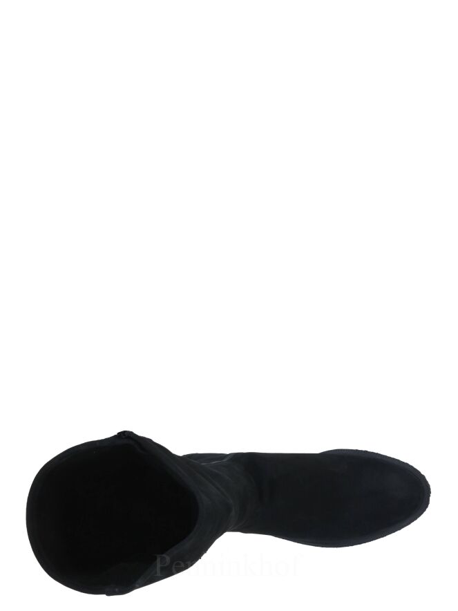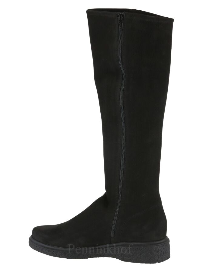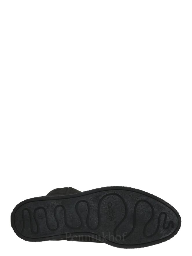 Ein hoher Stiefel der Schuhmarke Arche in Schwarz. Der Stiefel hat eine sportliche schwarze Sohle. Auf der Innenseite befindet sich ein schwarzer Reißverschluss. Die Innenseite des Schaftes ist ungefüttert.