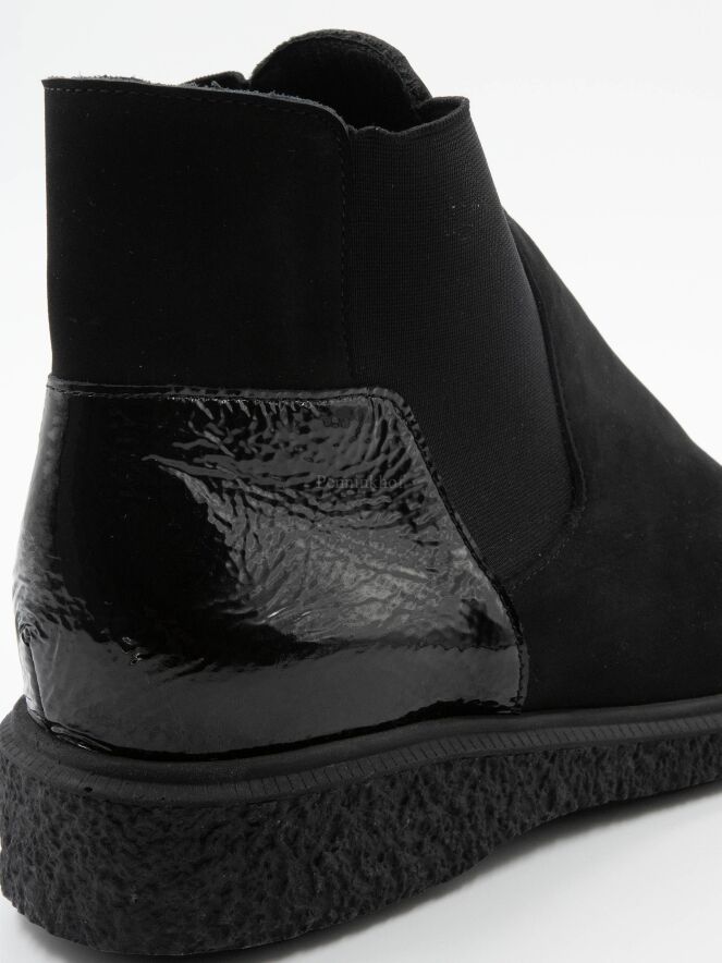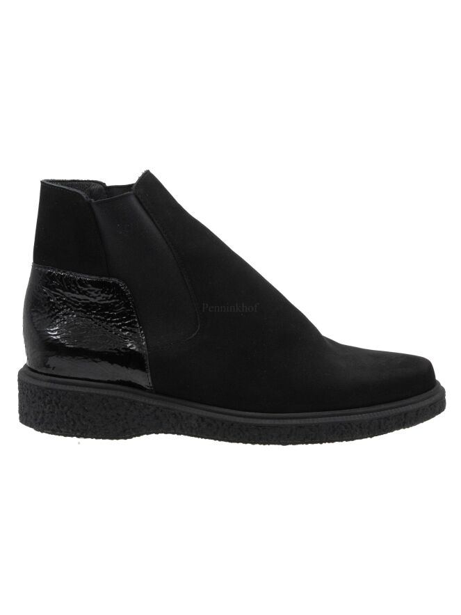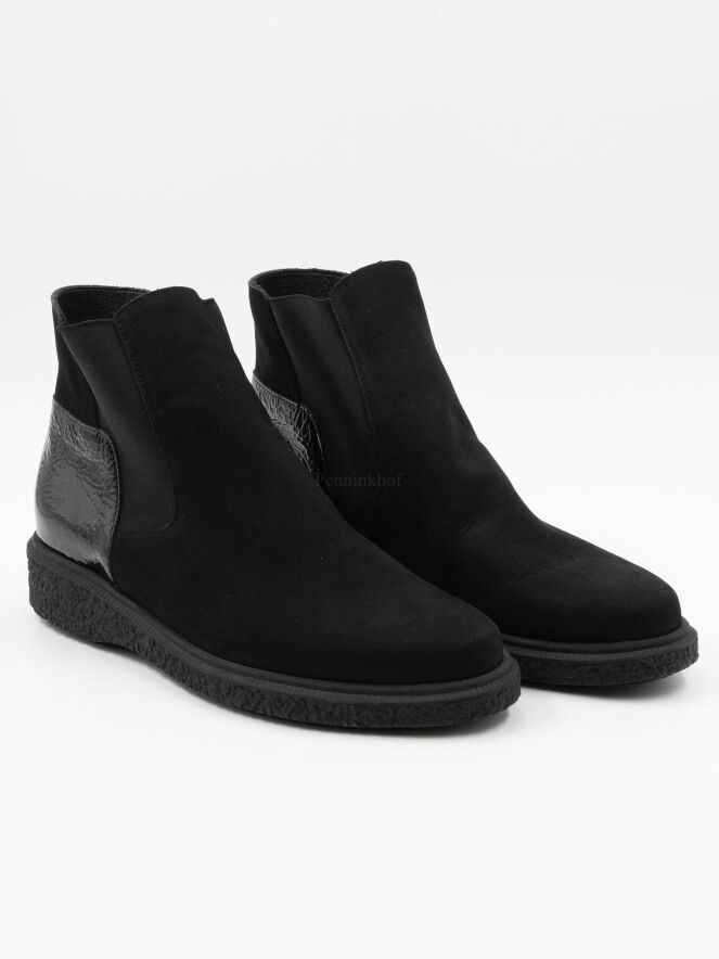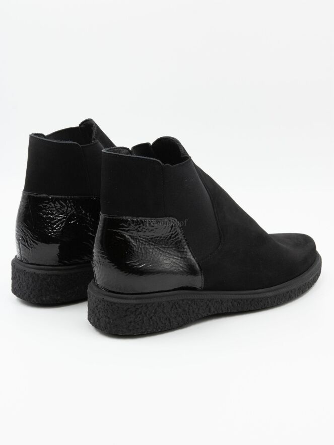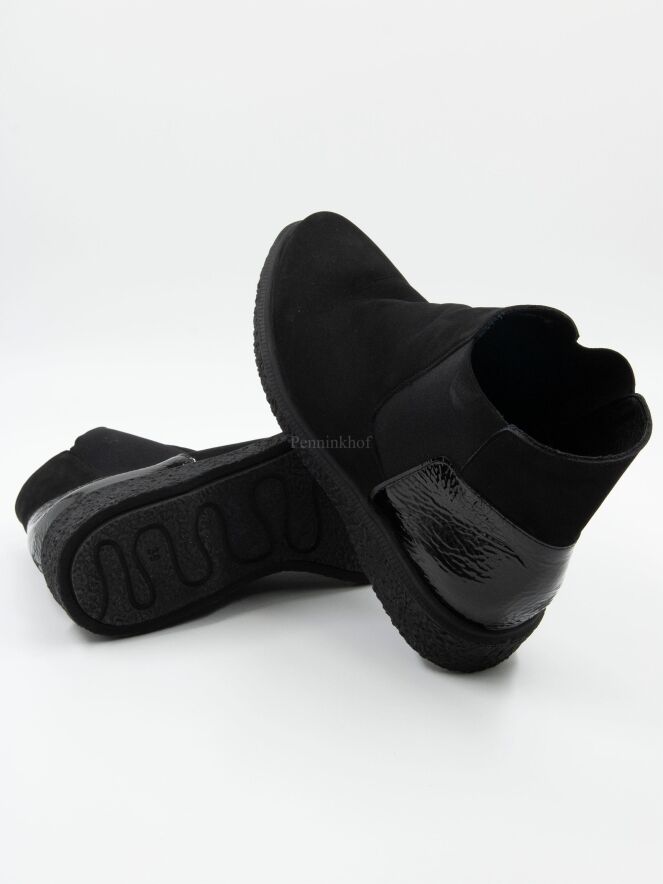 Eine kurze Stiefelette von Arche in der Farbe schwarz. An beiden Seiten des kurzen Schafts ist ein elastisches Stück Stoff eingesetzt. An der Ferse befindet sich ein Lacklederknitter. Der Stiefel ist ungefüttert.
