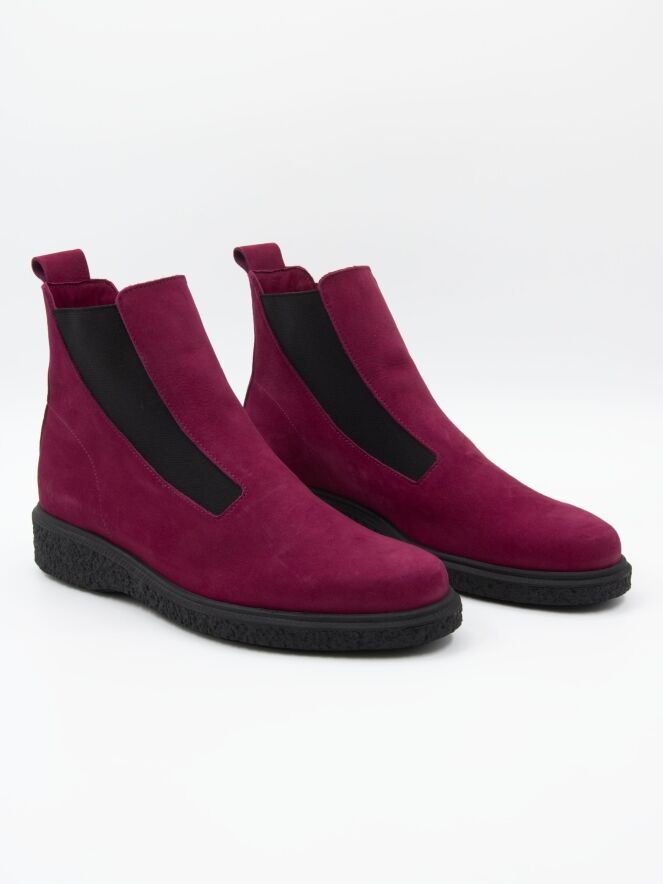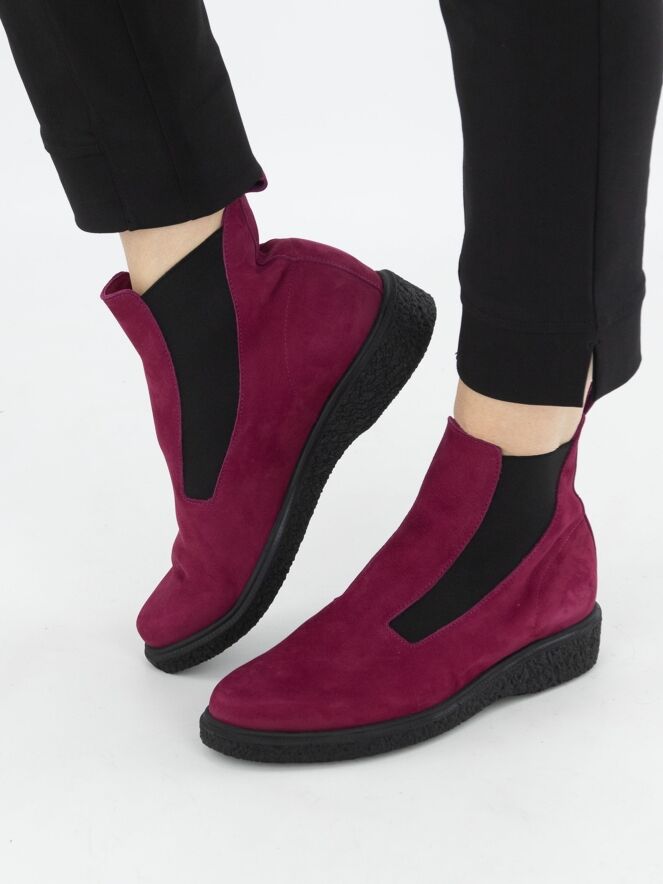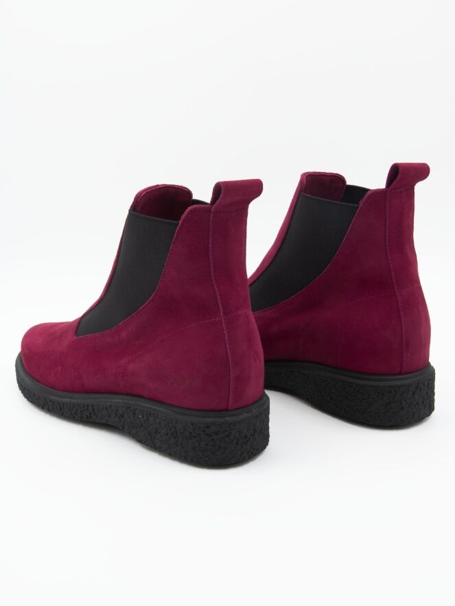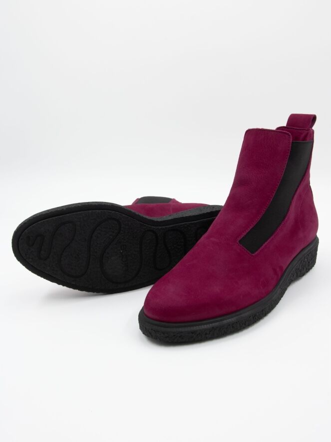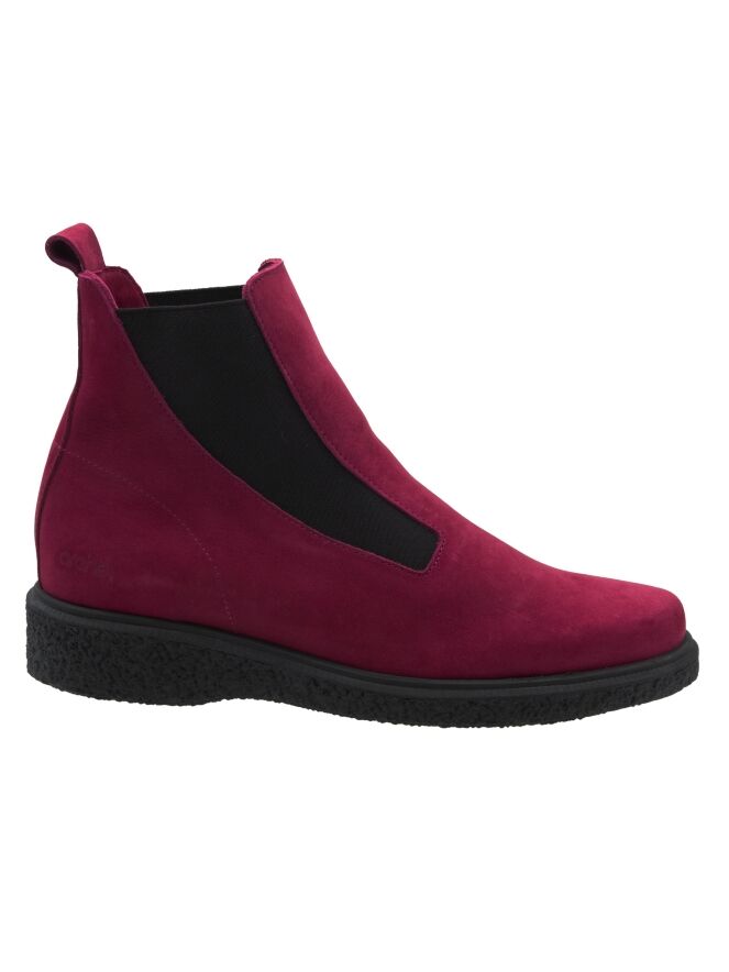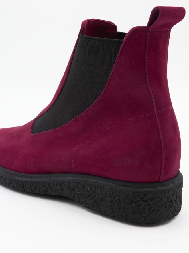 Ein Stiefelette von Arche in weicher Bordeauxfarbe. An beiden Seiten des Vorderfußes befindet sich ein elastisches Gewebe, das sich der Form des Vorderfußes bis zum Schaft anpasst. Das Innere ist ungefüttert.