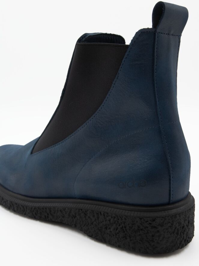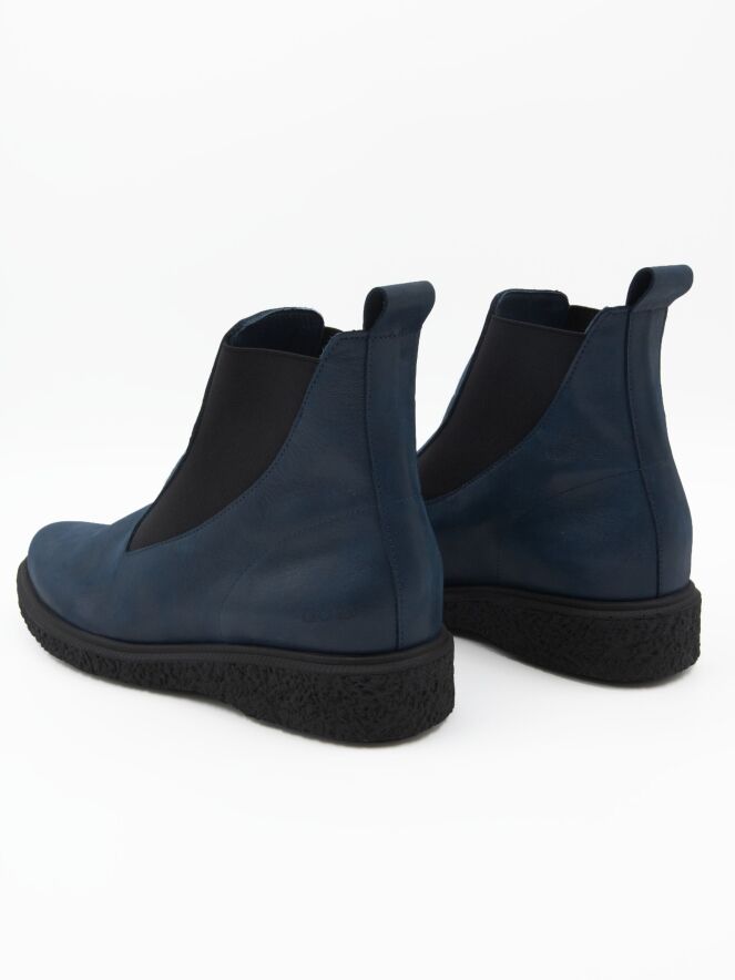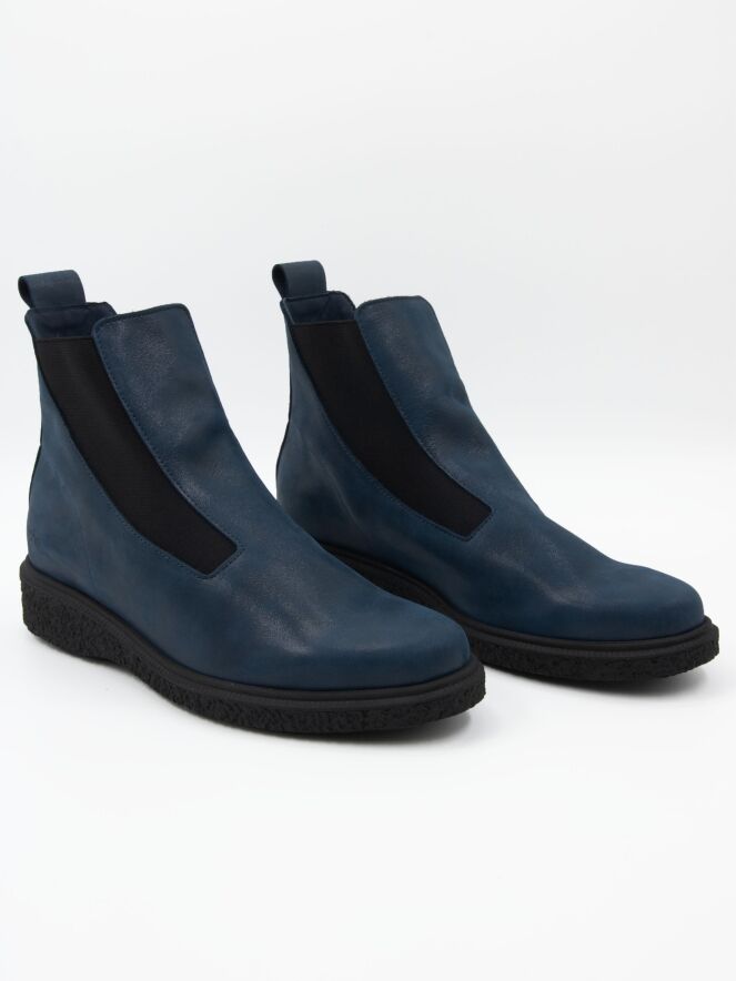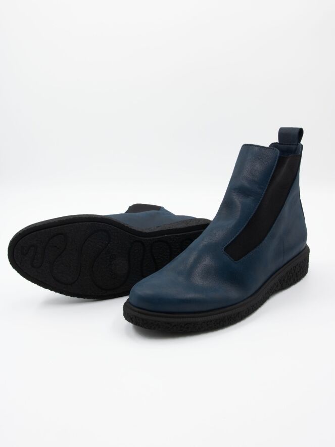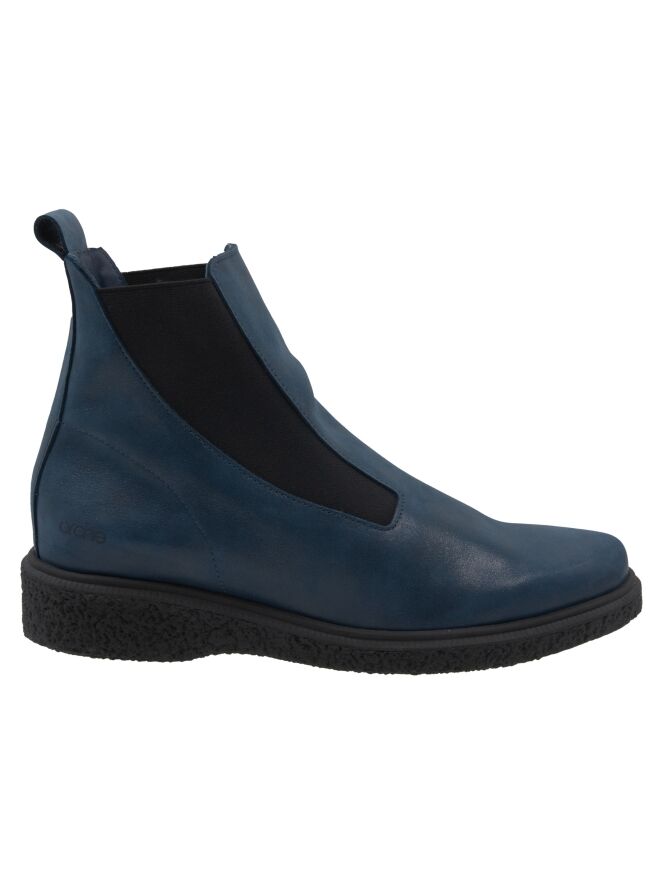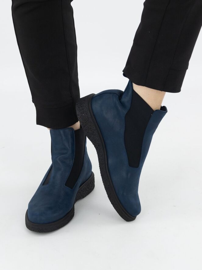 Ein Stiefelette von Arche in Blau. An beiden Seiten des Vorderfußes befindet sich ein elastischer Stoff, der sich der Form des Vorderfußes bis zum Schaft anpasst. Das Innere ist ungefüttert.