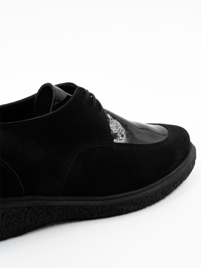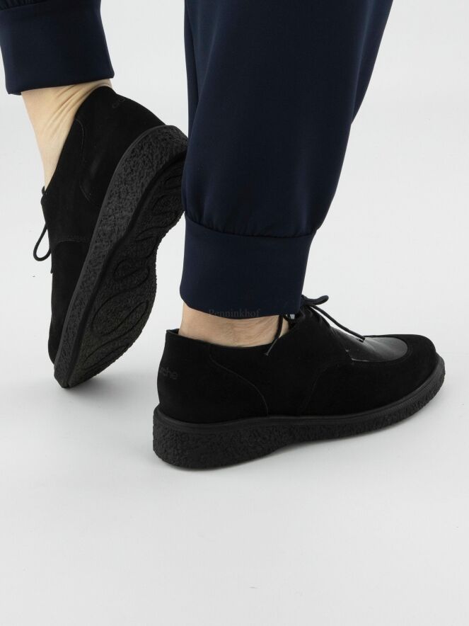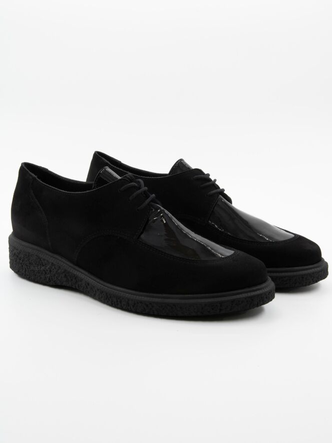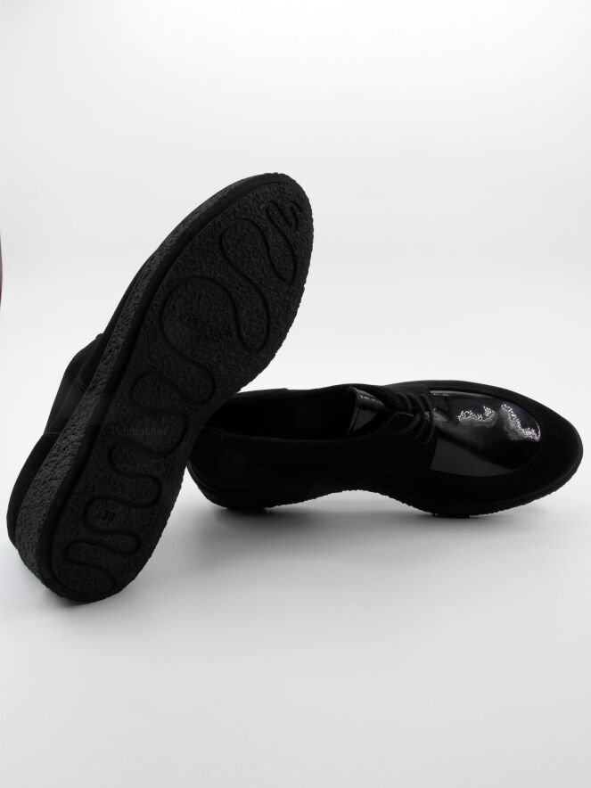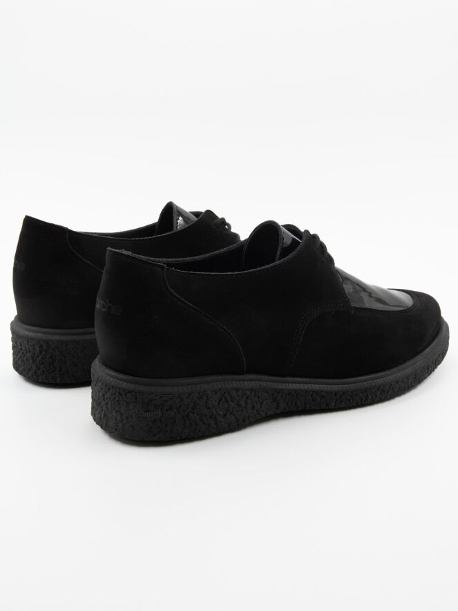 Ein Schnürschuh von Arche in schwarzDas Obermaterial des Vorfußes ist aus schwarzem Lackleder. Die Innenseite ist ungefüttert.