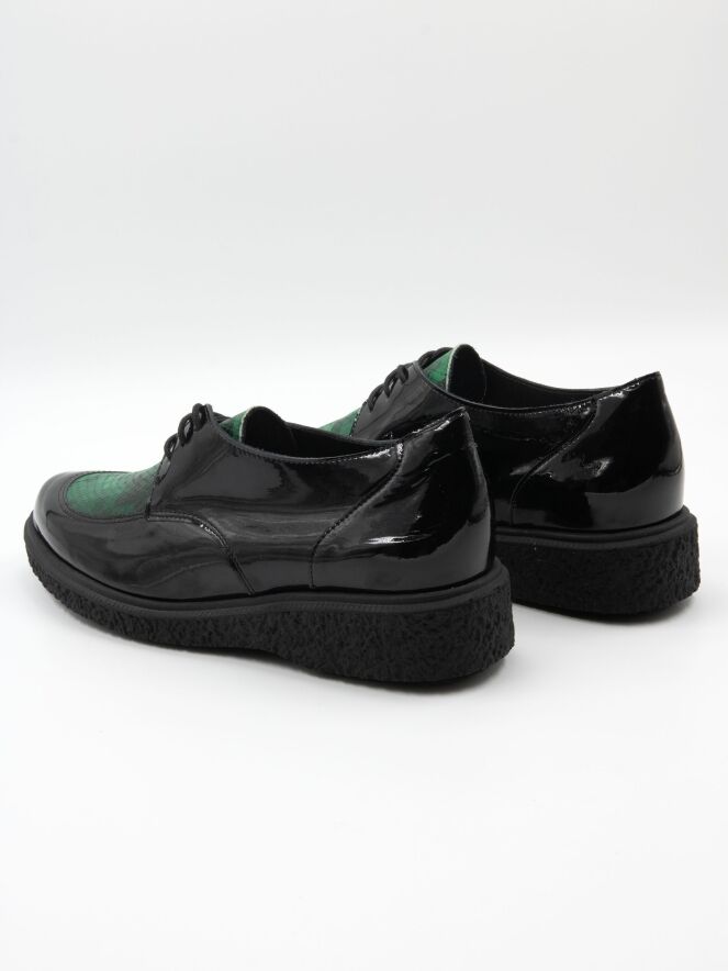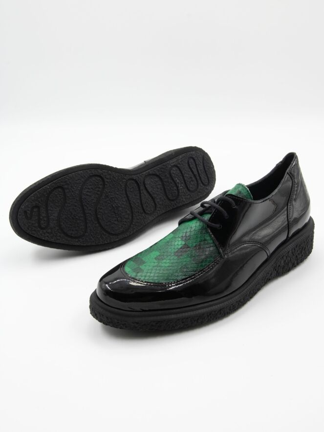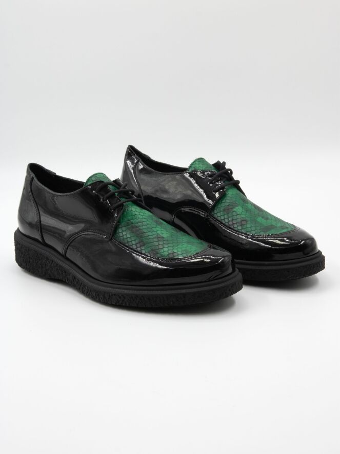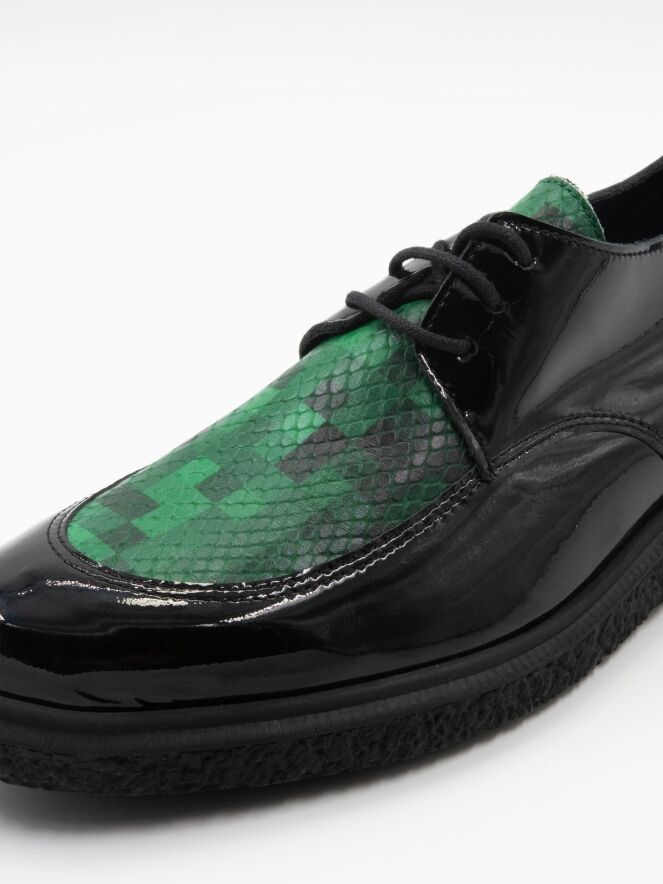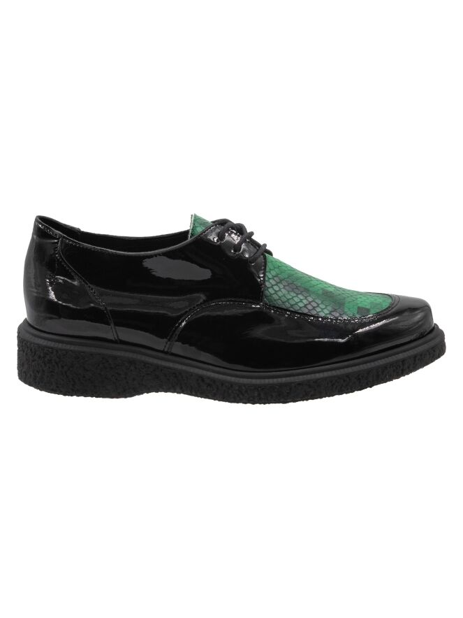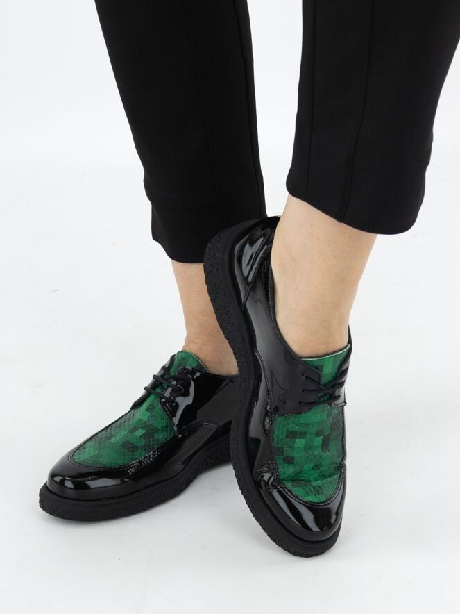 Ein Schnürschuh von Arche in dunkelgrünem Lackleder. Der Vorderfuß zeigt Leder in einem Blockdruck mit Reptilstruktur in verschiedenen Grüntönen. Das Innere ist ungefüttert.