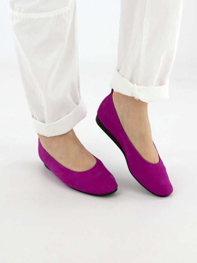 Das Modell Laius von Arche ist ein zeitloses Basismodell in einer frischen Fuchsianuance. Gefertigt aus hochwertigem Kalbsveloursleder und mit einer flexiblen Latexsohle ausgestattet, bietet diese Ballerina höchsten Tragekomfort. Die elegant rund geschnittene Spitze und das ungefütterte Innenleben sorgen für besondere Geschmeidigkeit und eine natürliche Passform. Der leicht erhöhte hintere Sohlenbereich unterstützt zusätzlichen Komfort bei jedem Schritt.