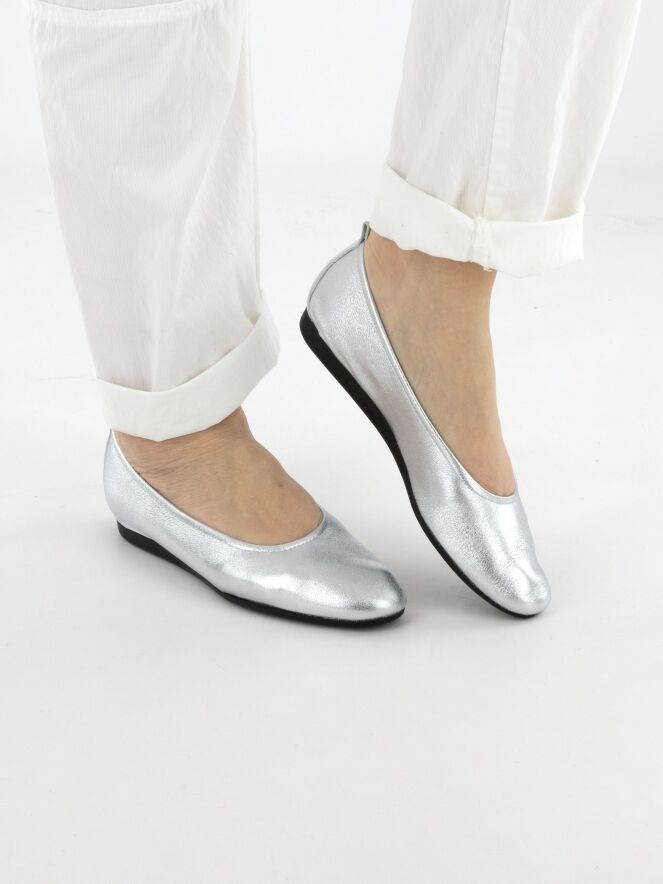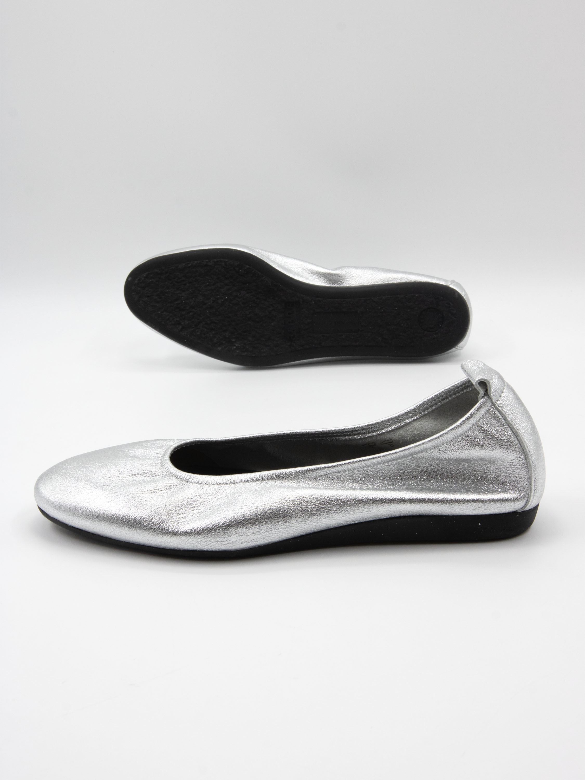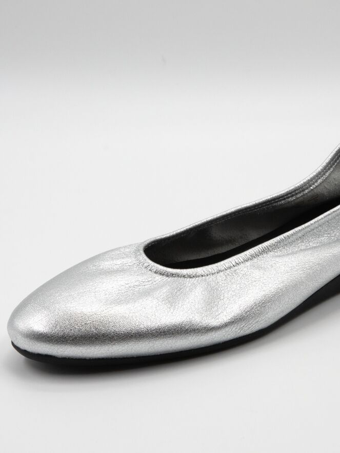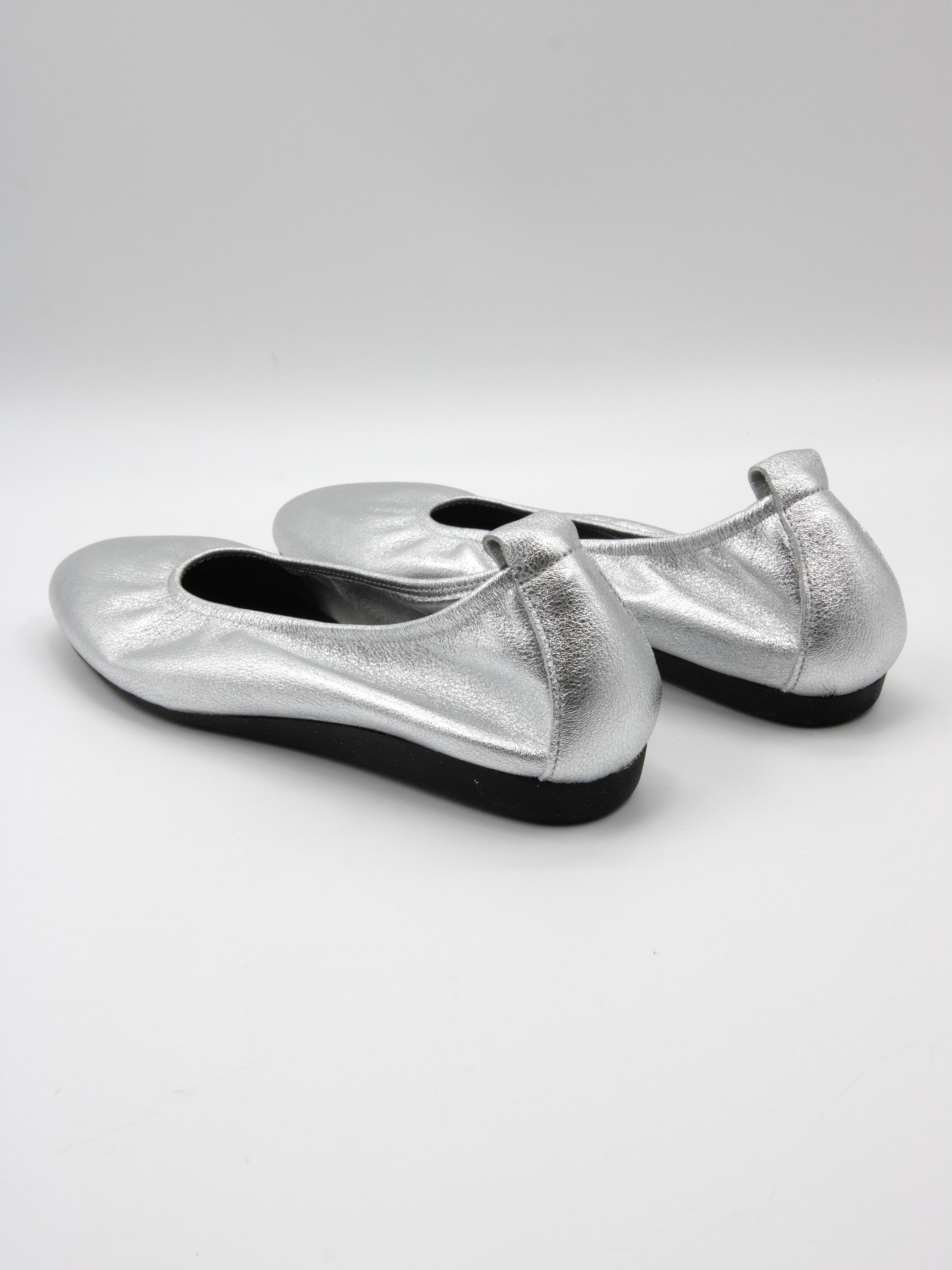 Das Modell Laius von Arche ist ein zeitloses Basismodell in elegantem Silber. Gefertigt aus hochwertigem Kalbsleder und in Uni gehalten, überzeugt diese Ballerina durch ihre vielseitige, edle Ausstrahlung. Die Spitze ist elegant rund geschnitten, und das ungefütterte Innere sorgt für besondere Geschmeidigkeit und ein natürliches Tragegefühl. Die flexible Latexsohle bietet optimale Dämpfung, während der leicht erhöhte hintere Sohlenbereich zusätzlichen Komfort gewährleistet.
