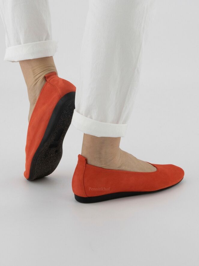 Das Modell Laius ist ein Basismodell der Schuhmarke Arche in Orange. Dieser Ballerina ist aus hochwertigem Kalbsveloursleder und kommt mit einer Latexsohle. Das Modell ist einfarbig gehalten. Vorne ist der Ballerina schön abgerundet. Der Ballerina hat kein Innenfutter. Der hintere Teil der Sohle ist leicht erhöht, was zu mehr Komfort beiträgt.