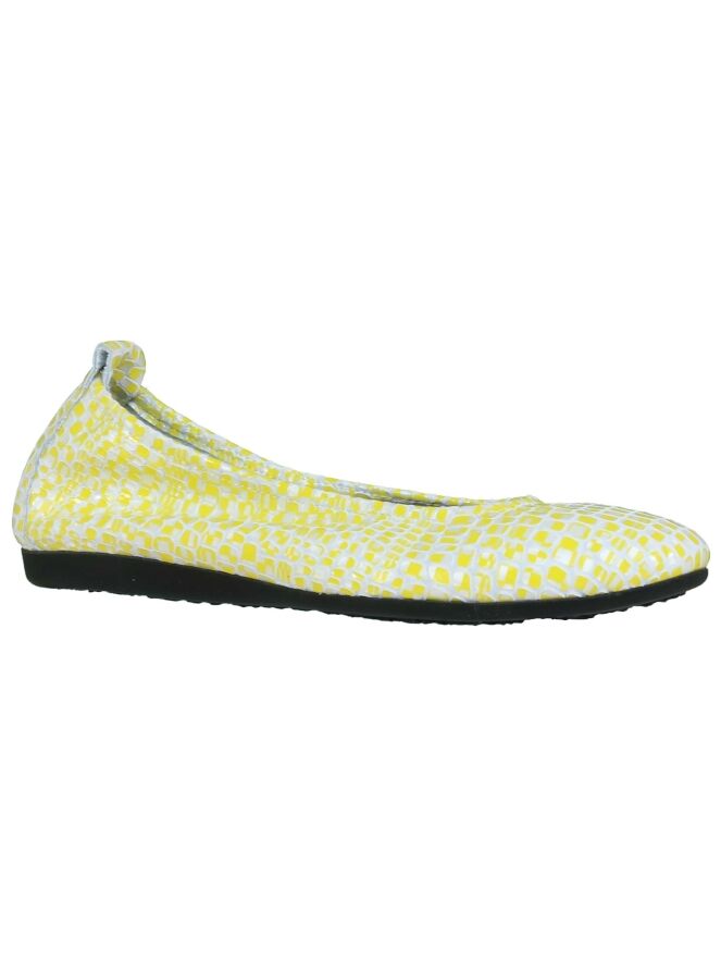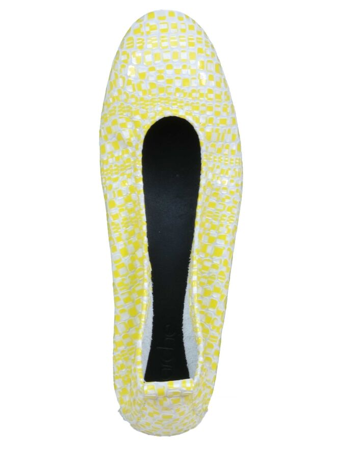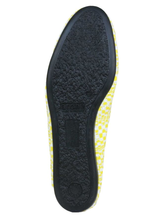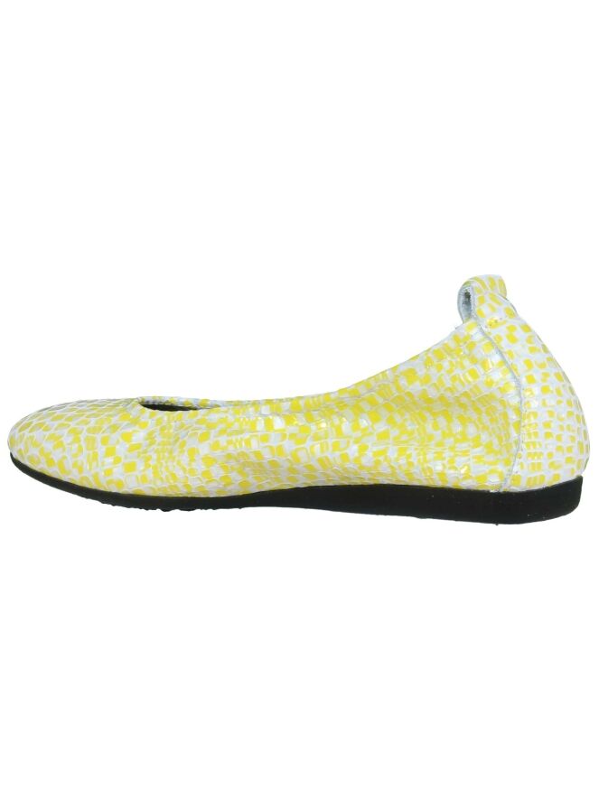 Ballerina der Damenschuhmarke Arche mit Aufdruck in Gelb und Offwhite. Dieser Ballerina wurde aus hochwertigem Lackleder hergestellt und mit einer Latex-Sohle ausgestattet. Der Ballerina ist vorn wunderschön abgerundet und hat kein Innenfutter. Der hintere Teil der Sohle ist leicht erhöht, was zu einem noch besseren Tragekomfort beiträgt.