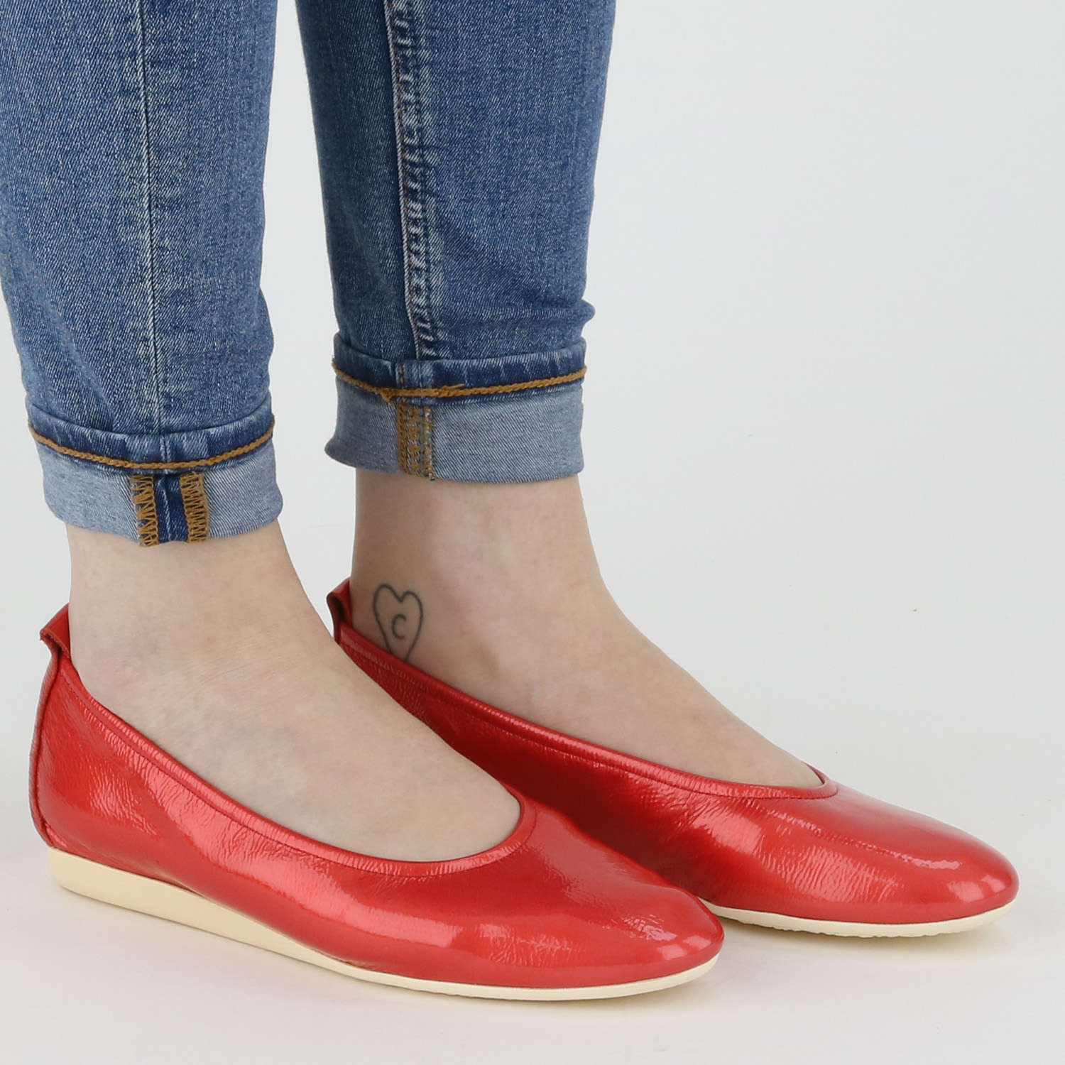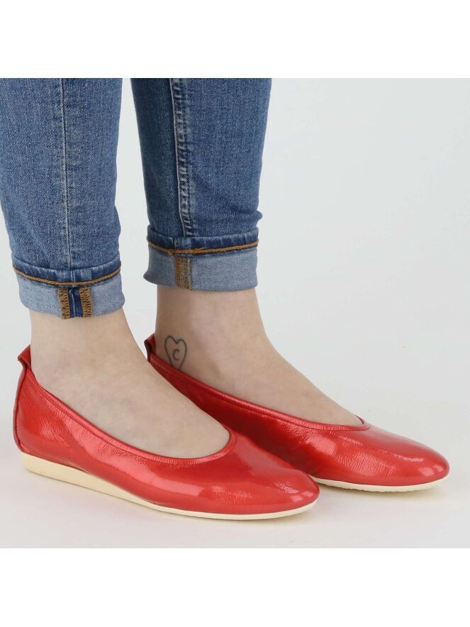 Das Modell Laius ist ein Basismodell der Schuhmarke Arche in der Farbe Rot. Dieser Ballerina ist aus hochwertigem Lackleder und kommt mit einer weißen Latexsohle. Das Modell ist einfarbig gehalten. Vorne ist der Ballerina schön abgerundet. Der Ballerina hat kein Innenfutter. Der hintere Teil der Sohle ist leicht erhöht, was zu mehr Komfort beiträgt.