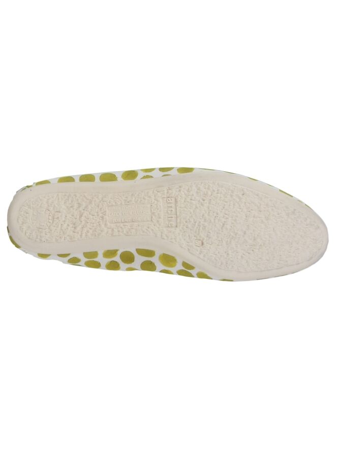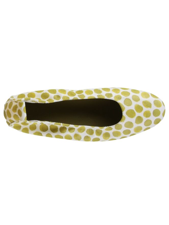Ballerina der Schuhmarke Arche mit sportlichem Punktmuster in Kiwi-Grün und Cremeweiß. Die Sohle ist ebenfalls cremeweiß. Dieser Ballerina hat kein Innenfutter.