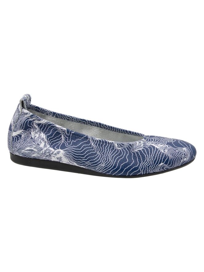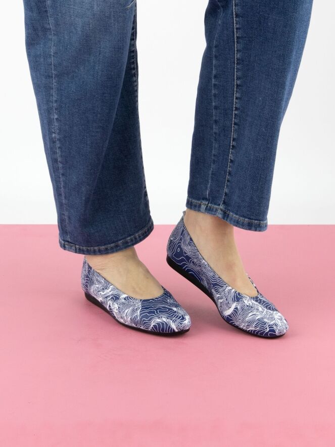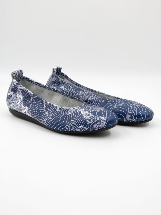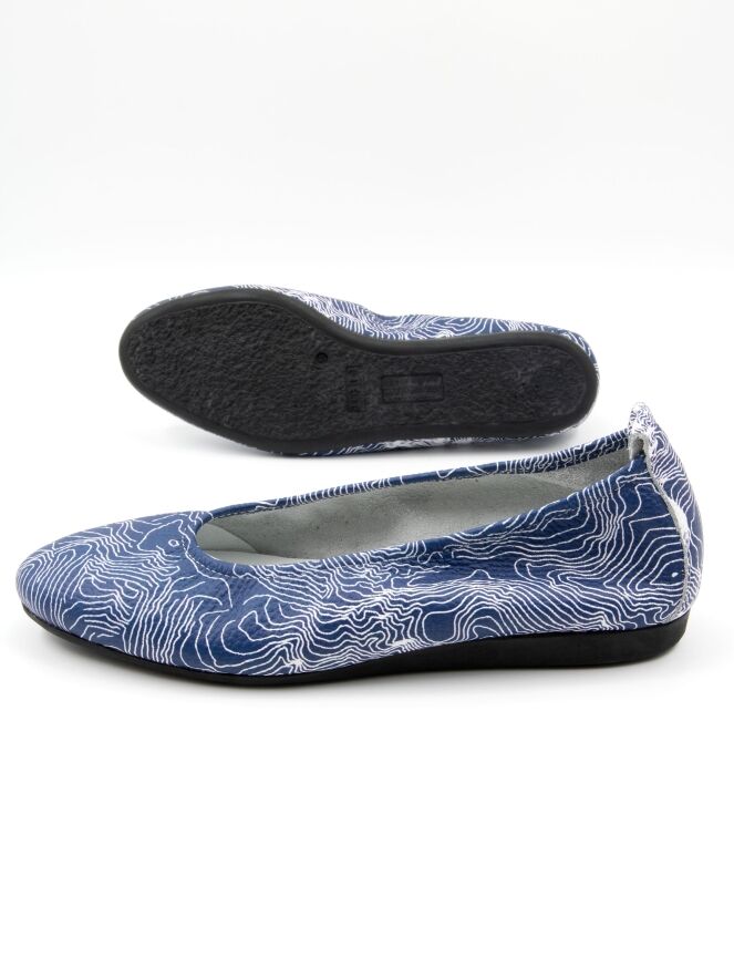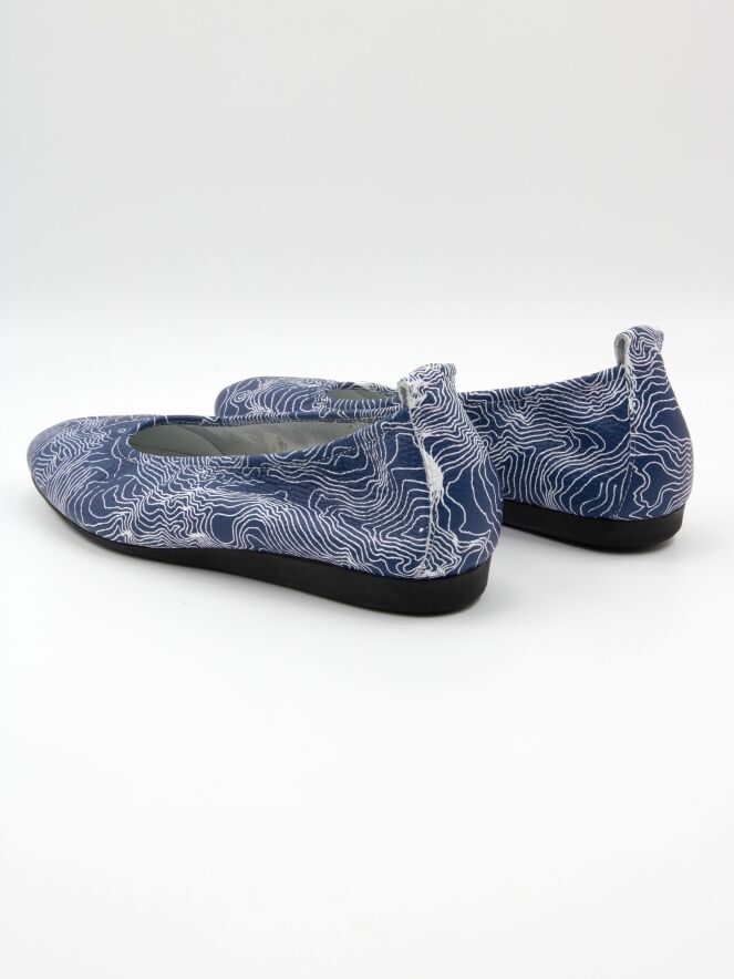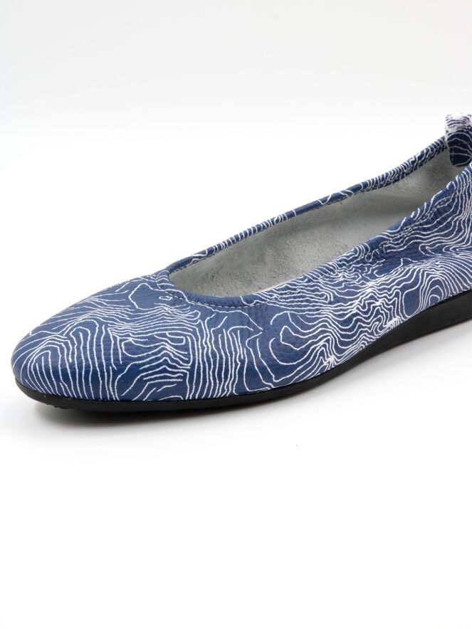Das Modell Laius ist ein klassisches Design der Marke Arche, mit einem grafischen Muster aus weißen Linien auf blauem Hintergrund. Diese Ballerina besteht aus hochwertigem Kalbsleder und verfügt über eine flexible Latexssohle. Die Zehenpartie ist elegant rund geschnitten. Das Innere ist ungefüttert für mehr Geschmeidigkeit. Der hintere Teil der Sohle ist leicht erhöht, was für zusätzlichen Komfort sorgt.