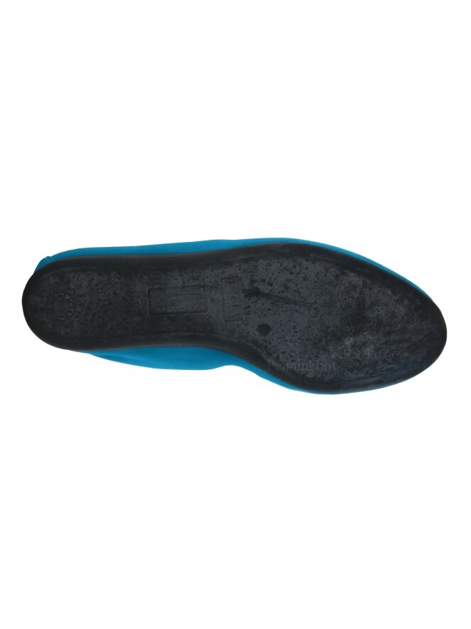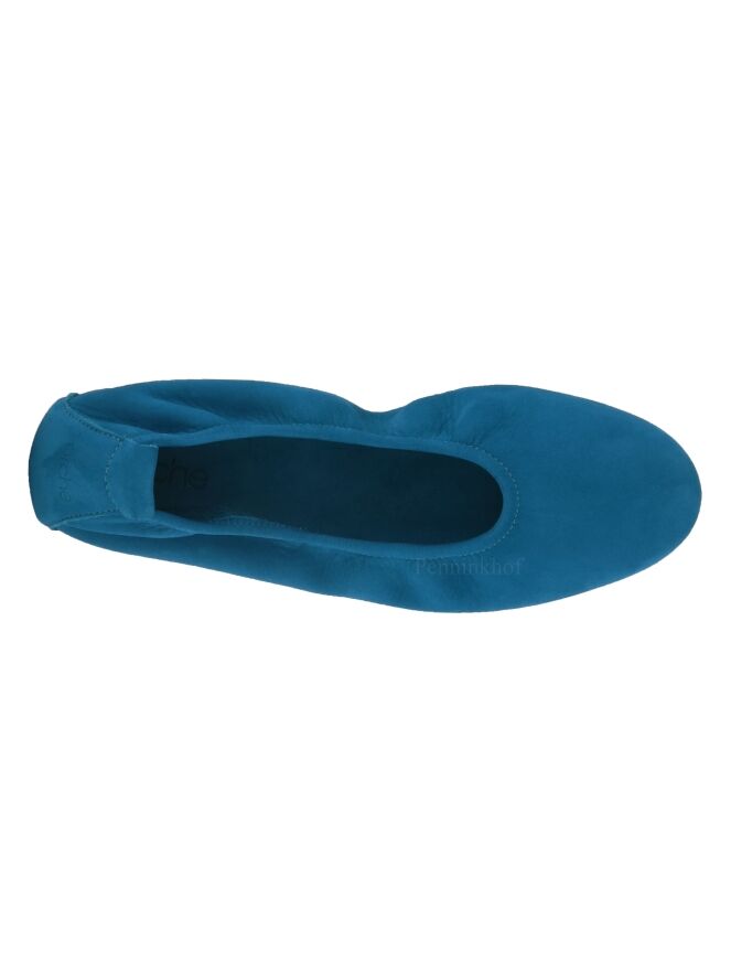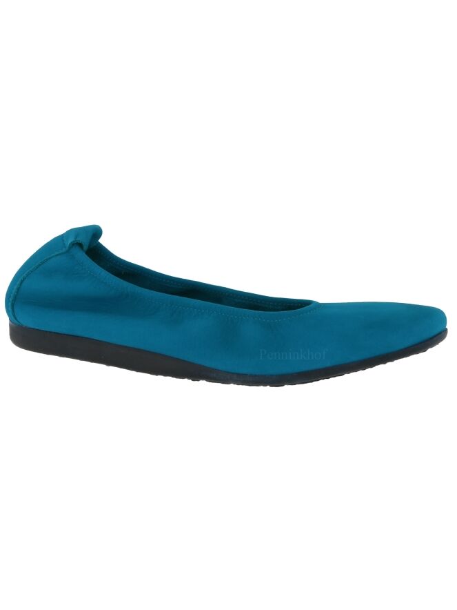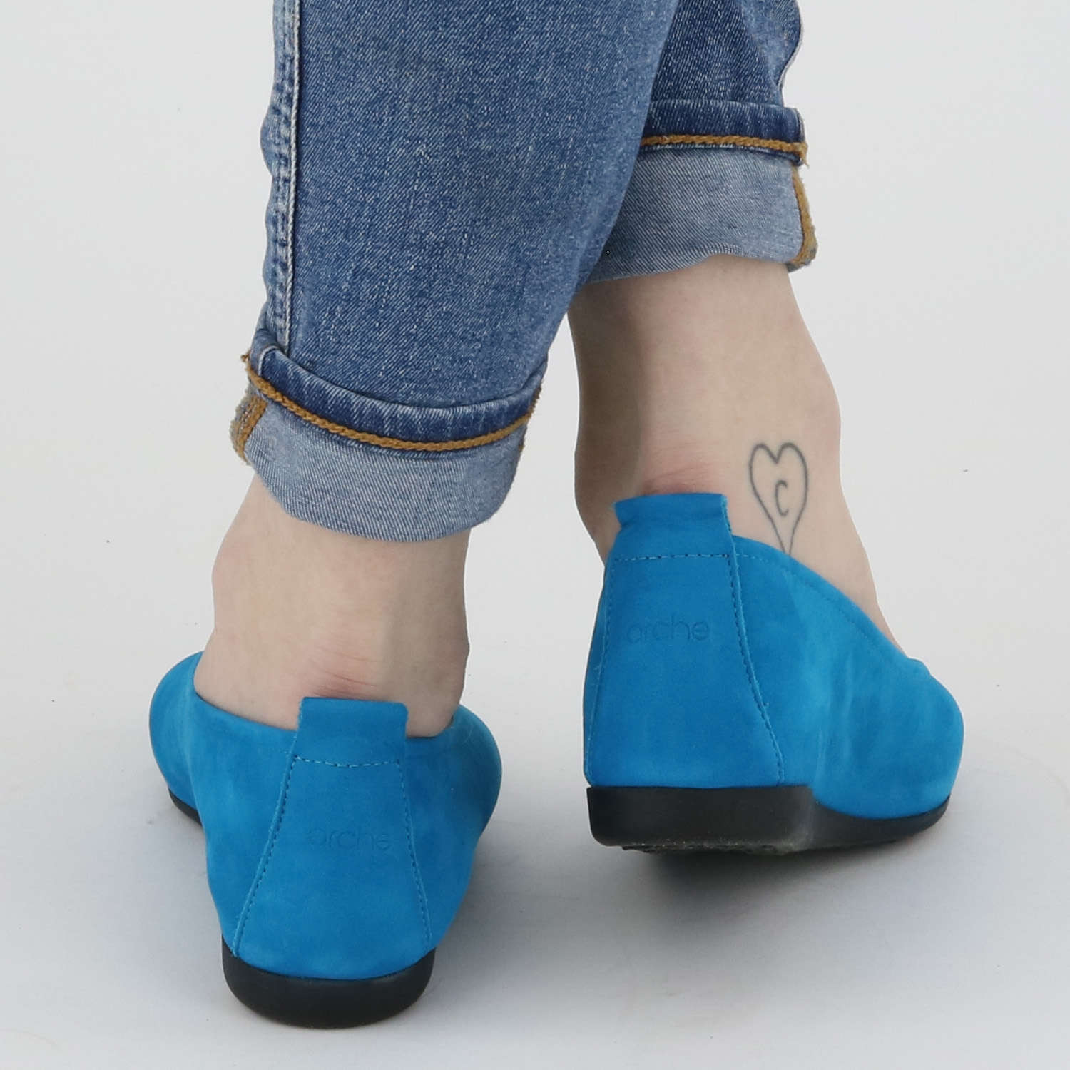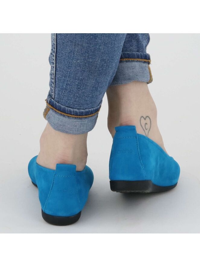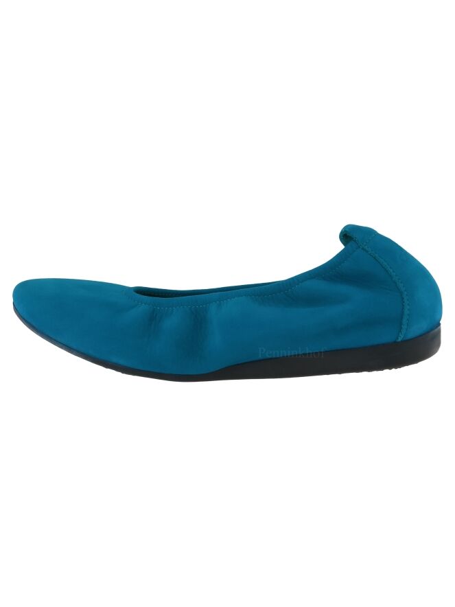 Das Modell Laius ist ein Basismodell der Schuhmarke Arche in der Farbe Türkis. Dieser Ballerina ist aus hochwertigem Nubuk-Veloursleder und kommt mit einer schwarzen Latexsohle. Das Modell ist einfarbig gehalten. Vorne ist der Ballerina schön abgerundet. Der Ballerina hat kein Innenfutter. Der hintere Teil der Sohle ist leicht erhöht, was zu mehr Komfort beiträgt.