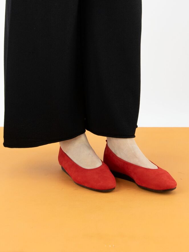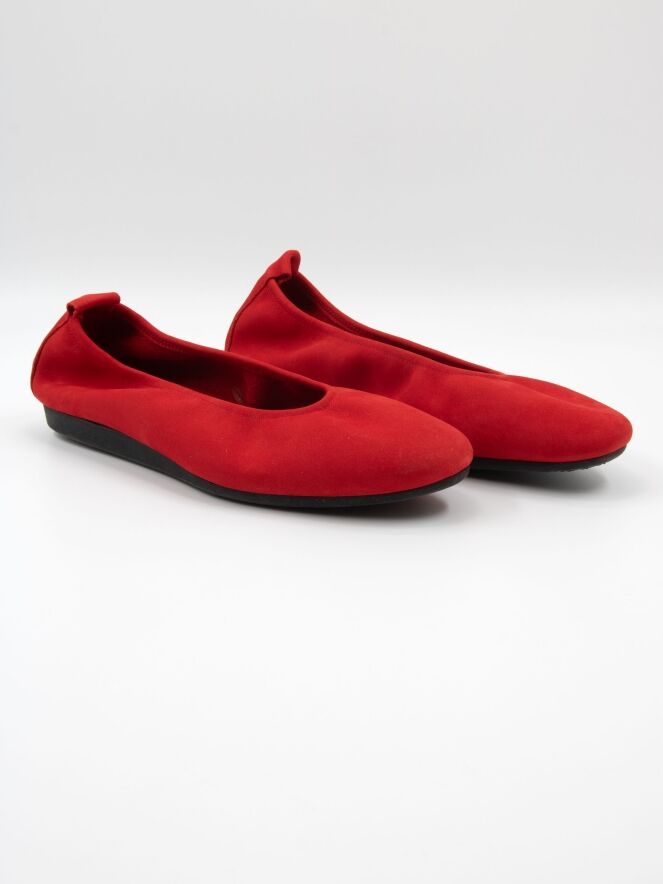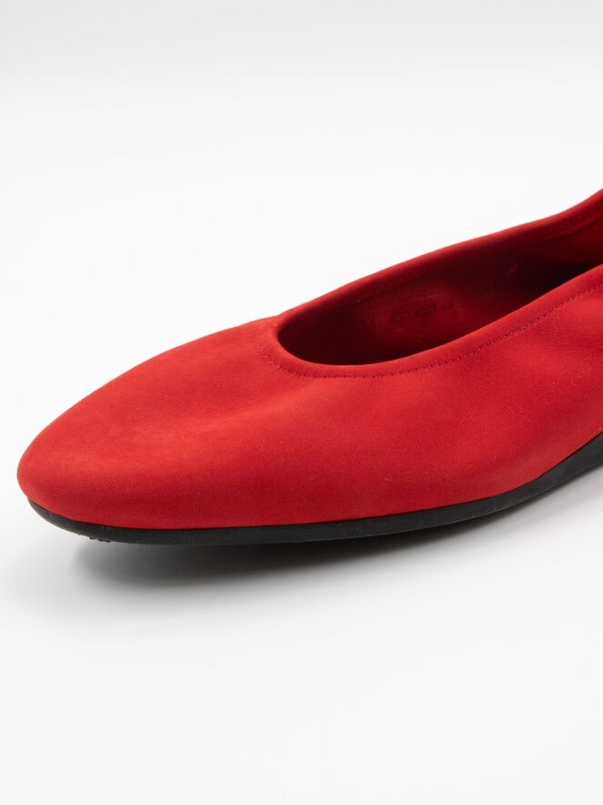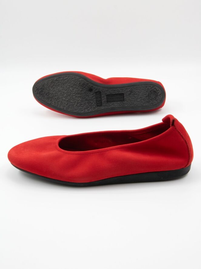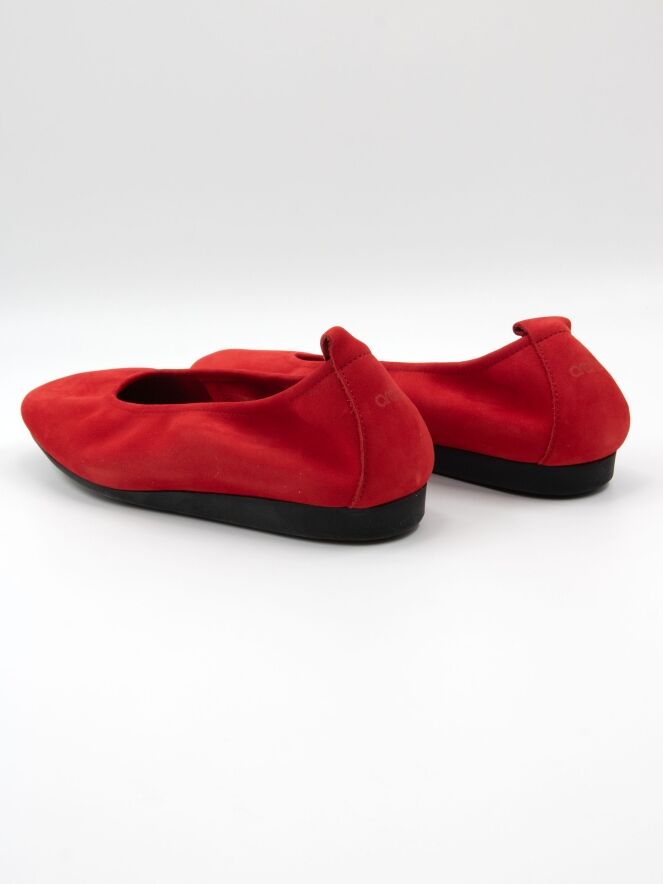 Das Modell Laius in Rot. Ein klassisches Design der Marke Arche. Diese Ballerina ist aus hochwertigem Kalbsleder gefertigt und verfügt über eine Latexsohle. Das Modell ist in einer Unifarbe gehalten. Die Schuhspitze der Ballerina ist schön rund geschnitten. Das Innenfutter fehlt, sodass der Schuh besonders weich und bequem ist. Die hintere Sohle ist leicht erhöht, um zusätzlichen Komfort zu bieten.