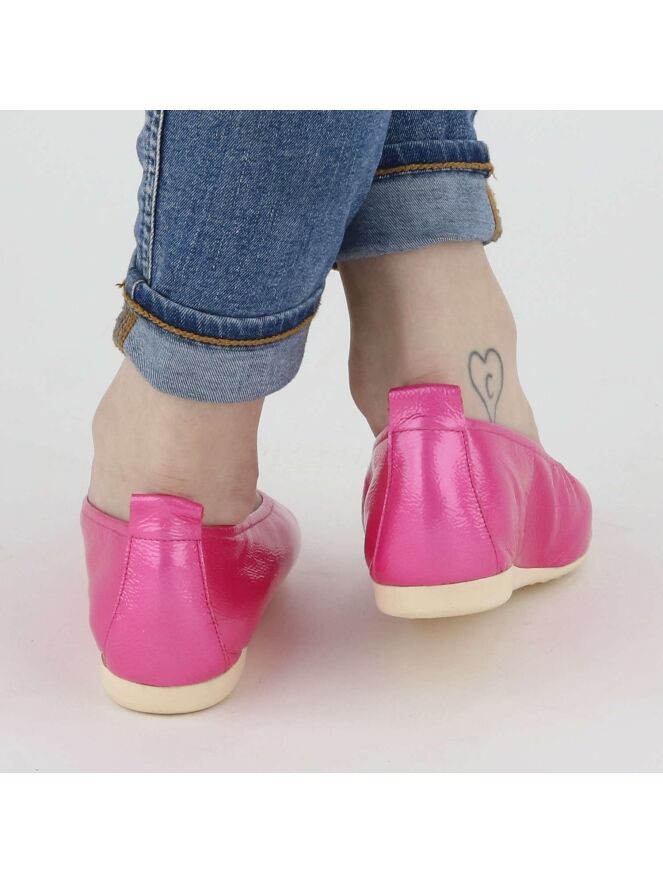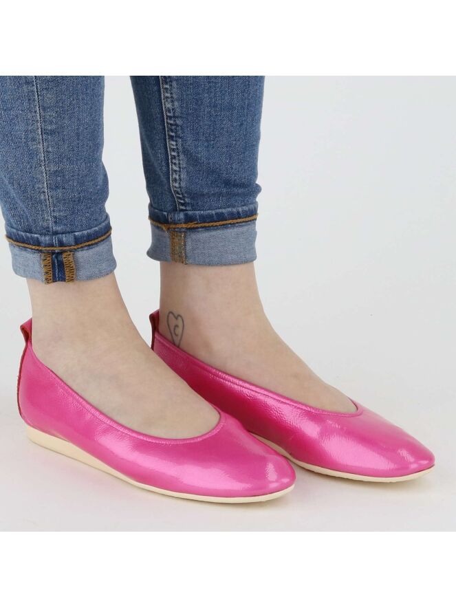 Das Modell Laius ist ein Basismodell der Schuhmarke Arche in der Farbe Pink. Dieser Ballerina ist aus hochwertigem Lackleder und kommt mit einer weißen Latexsohle. Das Modell ist einfarbig gehalten. Vorne ist der Ballerina schön abgerundet. Der Ballerina hat kein Innenfutter. Der hintere Teil der Sohle ist leicht erhöht, was zu mehr Komfort beiträgt.