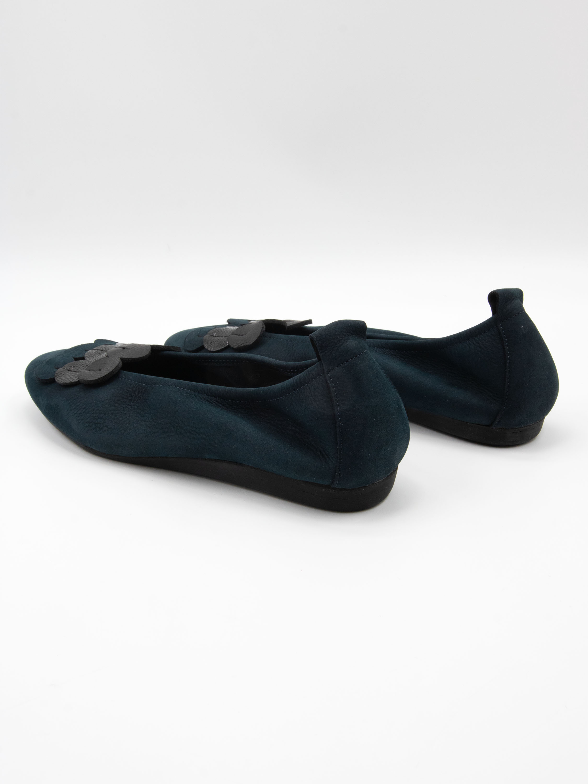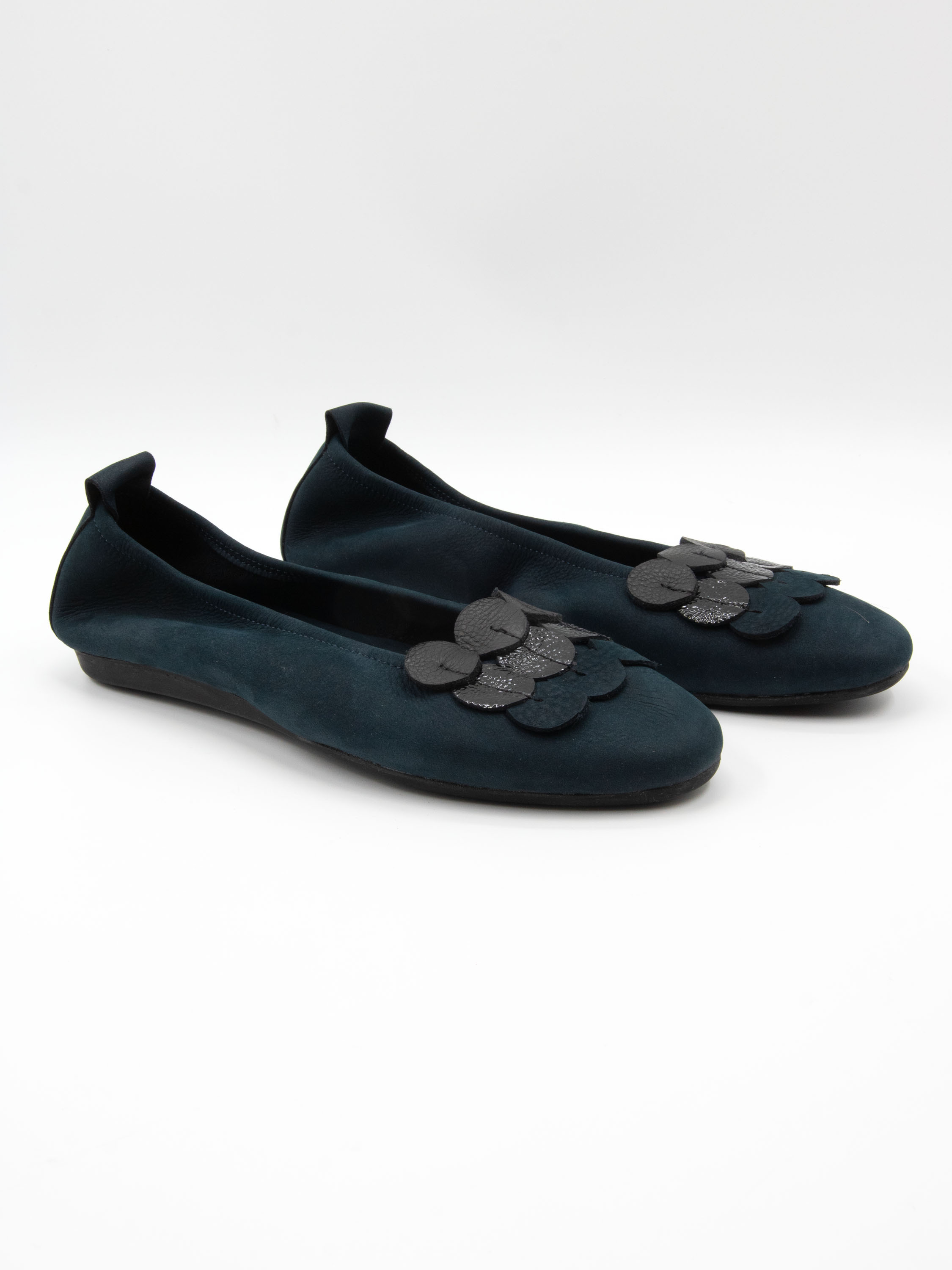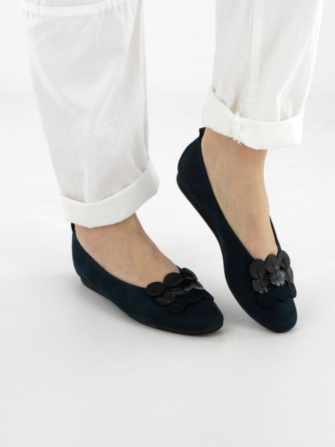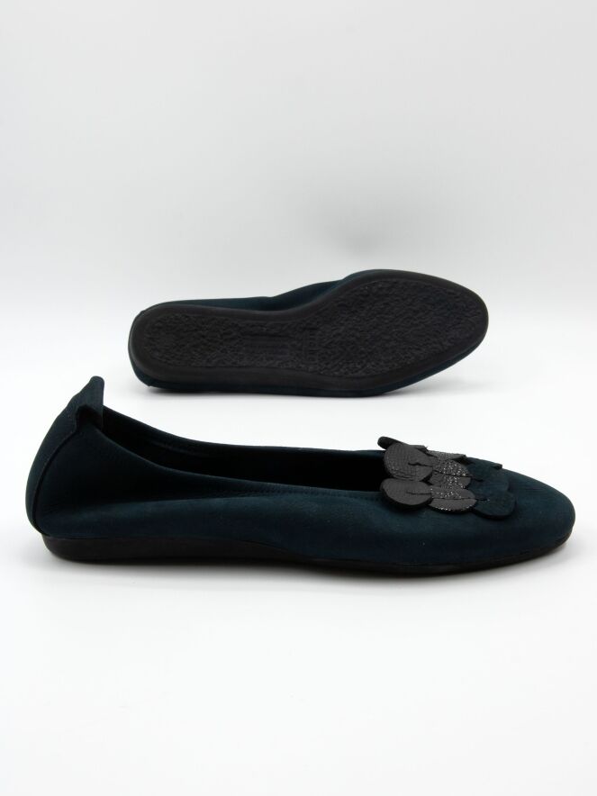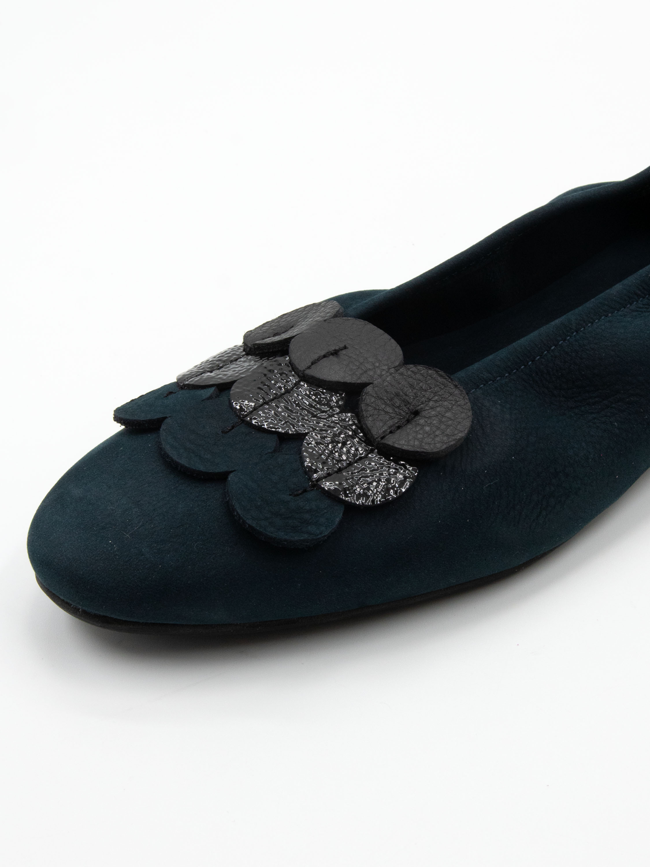 Ballerina von Arche, identisch mit dem Modell Laius, in einem eleganten Marineblau. Im Vorderfußbereich sind neun dekorative runde Elemente (3x3) aus drei verschiedenen Lederqualitäten angebracht, die eine raffinierte, lebendige Struktur erzeugen. Die rund geschnittene Spitze unterstreicht die zeitlose Eleganz des Designs. Das ungefütterte Innere sorgt für zusätzliche Geschmeidigkeit und eine natürliche Passform. Der leicht erhöhte hintere Sohlenbereich bietet zusätzlichen Komfort bei jedem Schritt.