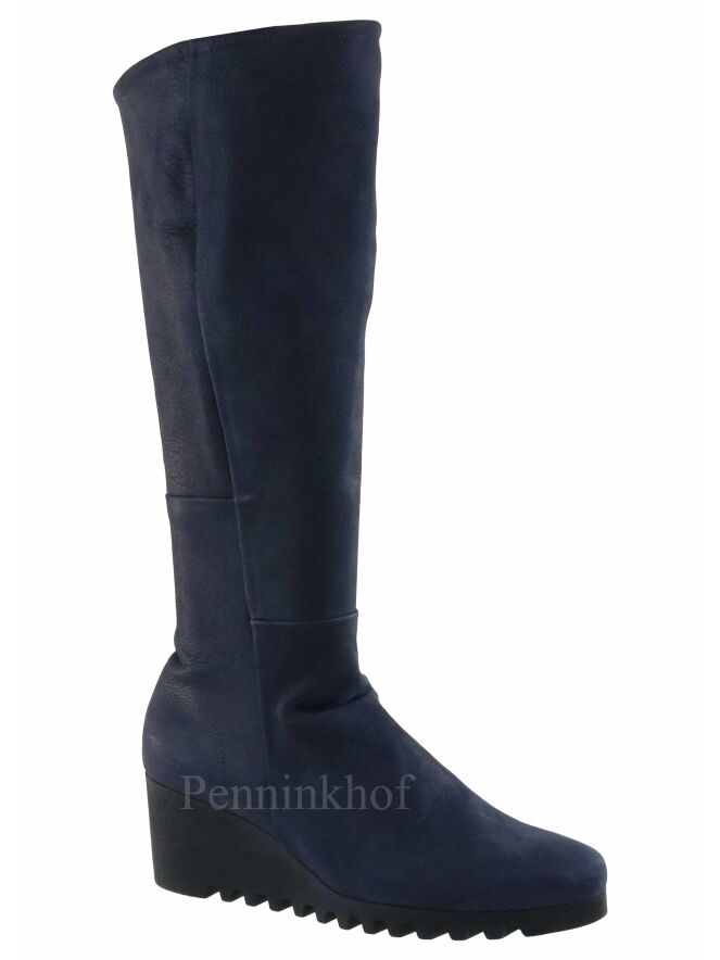 Ein anthrazitgrau melierter Stiefel der Schuhmarke Arche. Die schwarze Sohle ist gezackt. Auf der Innenseite befindet sich ein schwarzer Reißverschluss. Der Stiefel ist vorne abgerundet und nicht gefüttert.