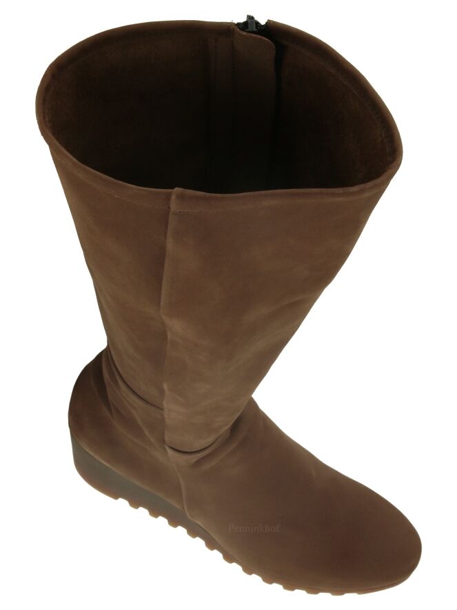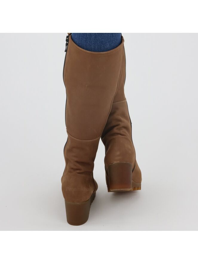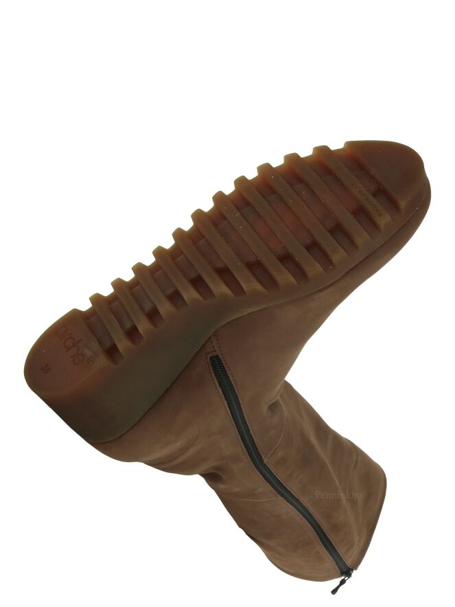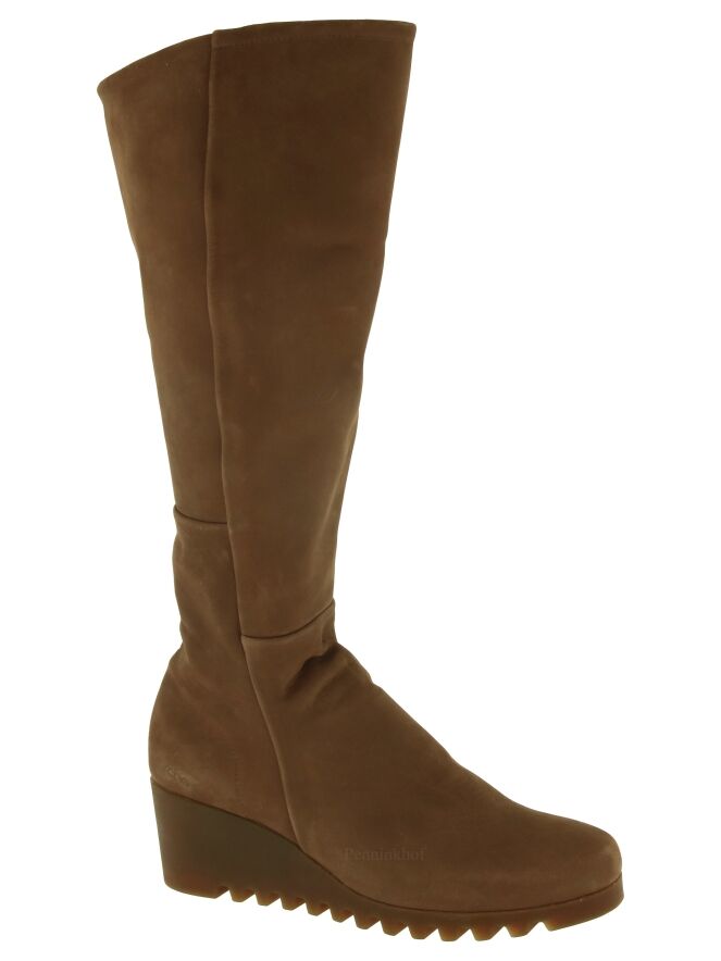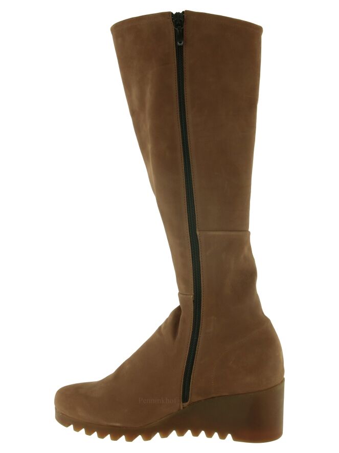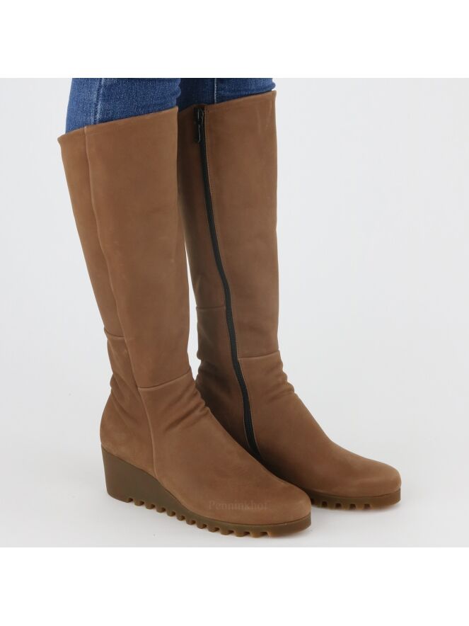 Hoher Stiefel der Schuhmarke Arche in der Farbe Cognac. Der Stiefel kommt mit einem Keilabsatz mit einer cognacfarbenen Latex-Sohle. An der Innenseite befindet sich ein schwarzer Reißverschluss. Der Stiefel ist nicht gefüttert.