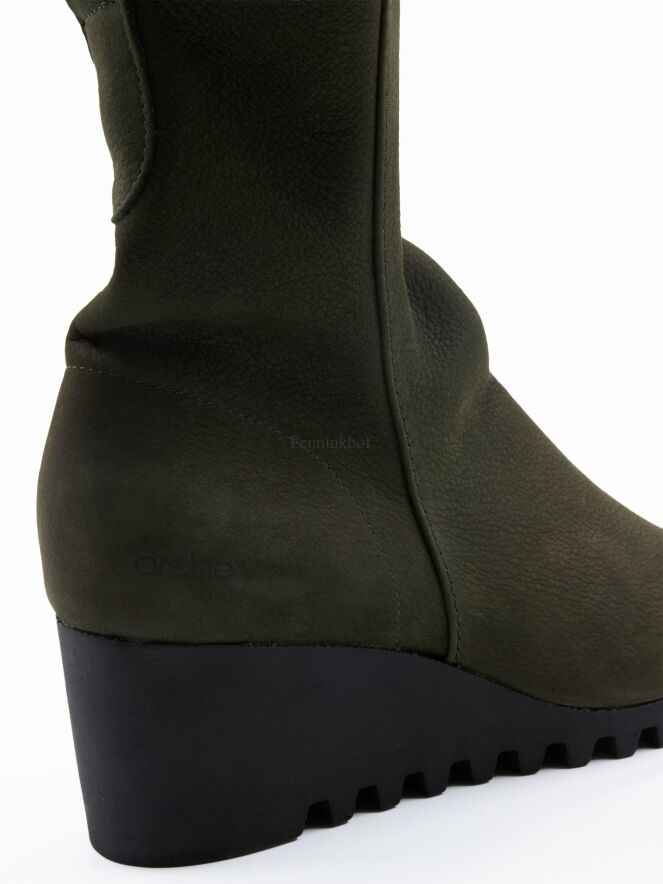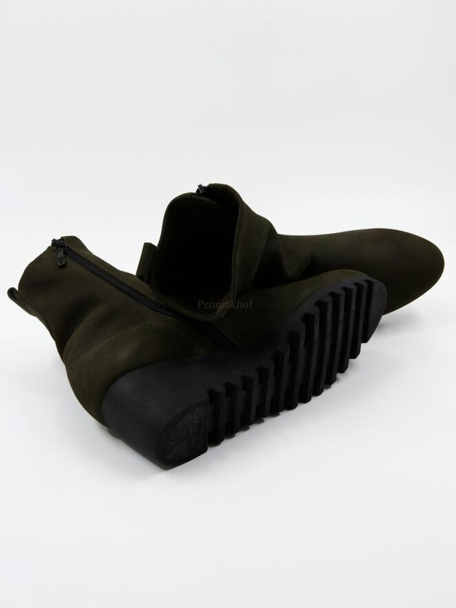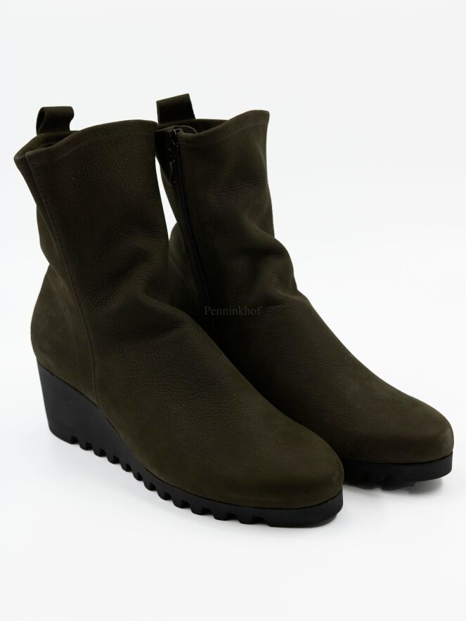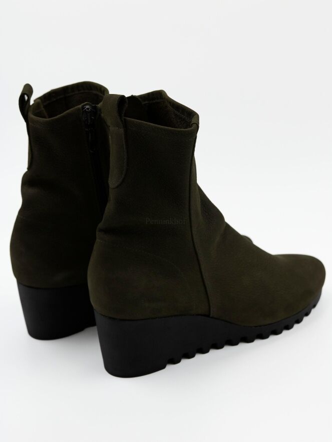 Stiefelette mit Keilabsatz der Marke Arche aus sehr weichem Wildleder in der Farbe Olivgrün. Der Stiefel ist ungefüttert. Die Sohle ist sportlich gerippt.