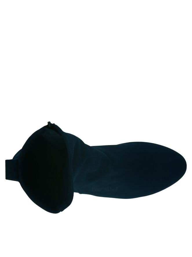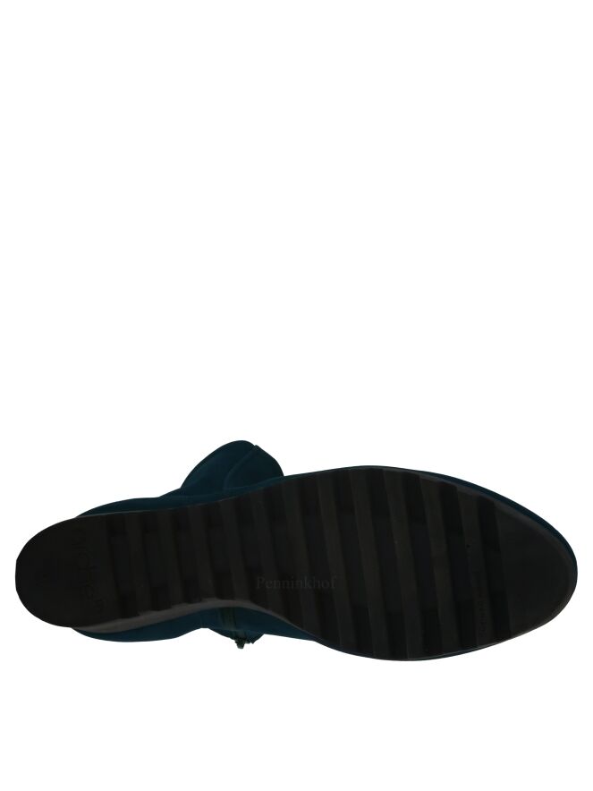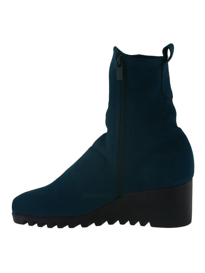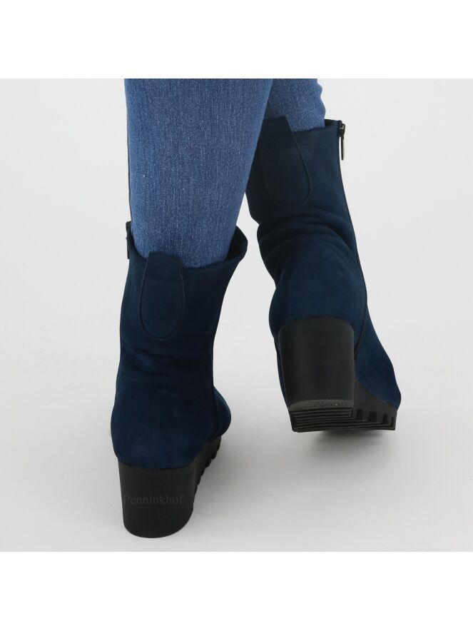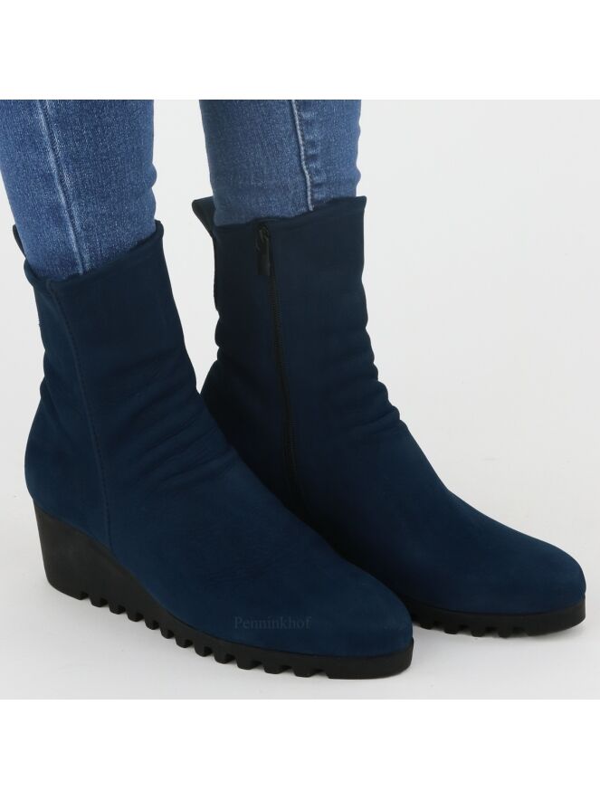 Eine nachtblaue Stiefelette mit Keilabsatz der Schuhmarke Arche aus einem sehr weichen Leder. Der Stiefel ist nicht gefüttert. Die Sohle ist sportlich gezackt.