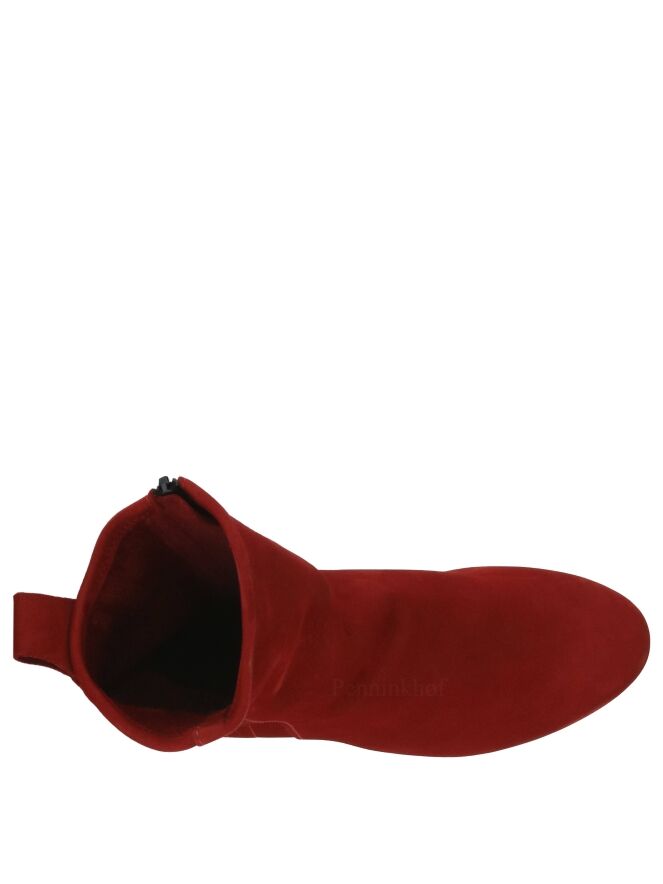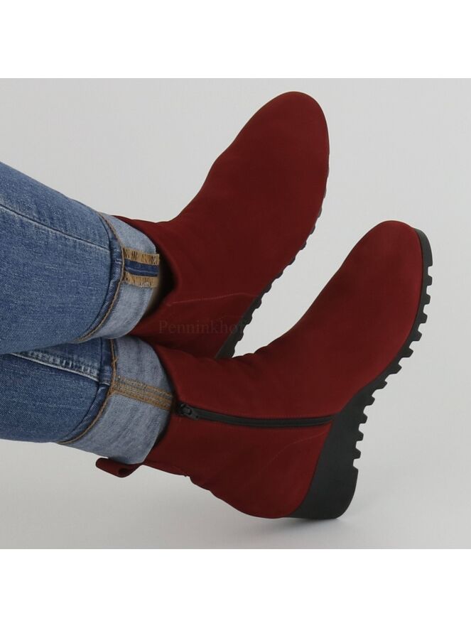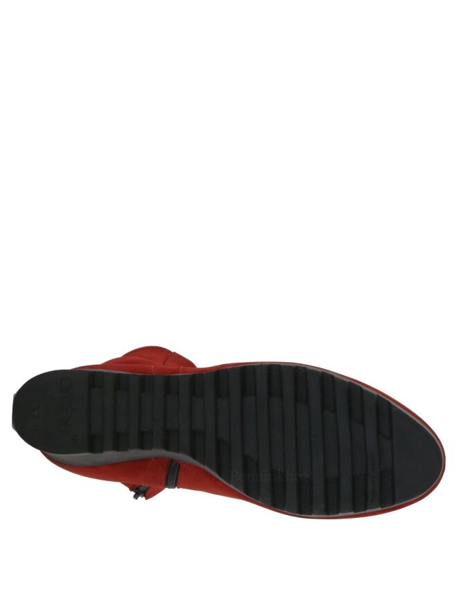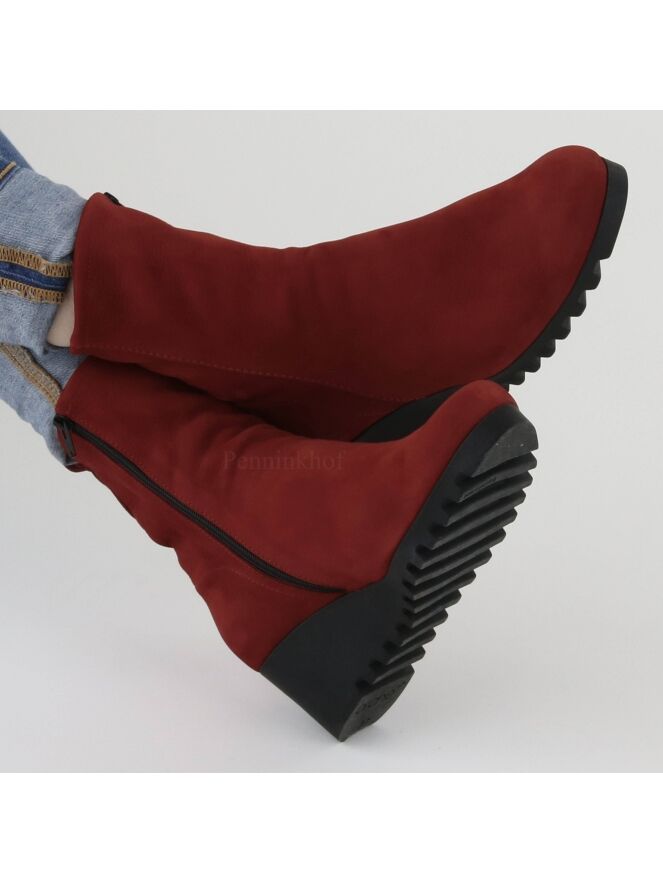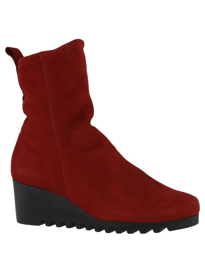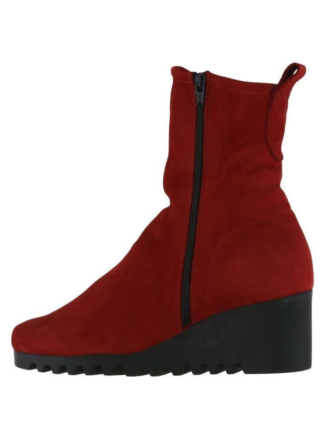 Rote Keilabsatz-Stiefelette aus sehr weichem Leder aus der Schuhkollektion von Arche. Diese Stiefelette ohne Innenfutter ist mit einer sportlich gekerbten Sohle versehen.