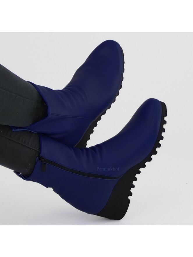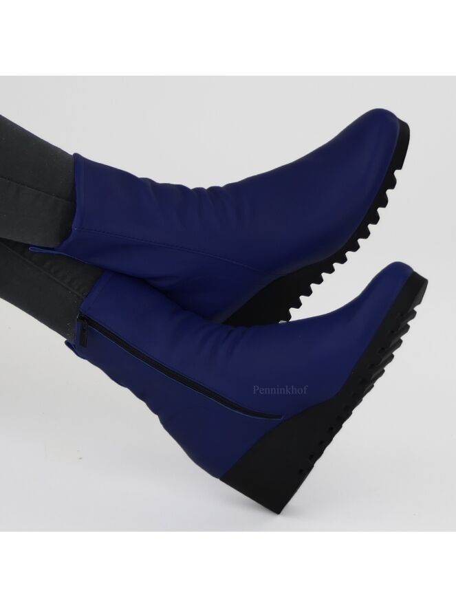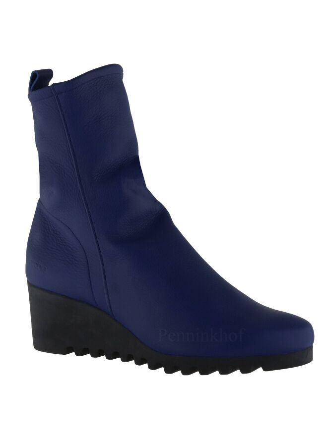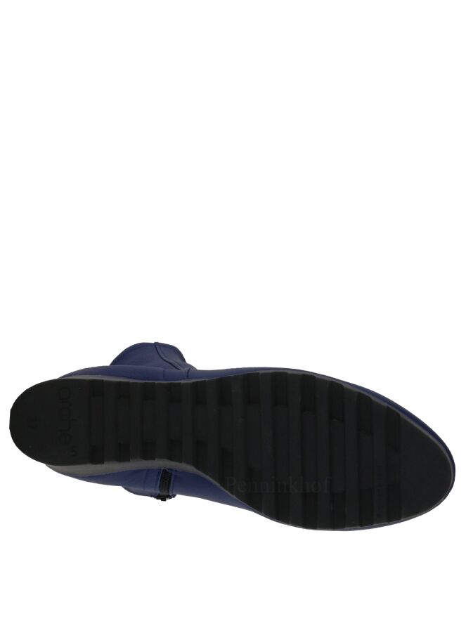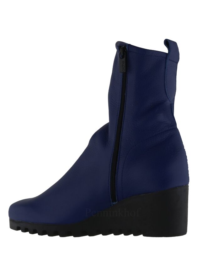 Eine Stiefelette mit Keilabsatz der Schuhmarke Arche aus einem sehr weichen Leder in Kobaltblau. Der Stiefel ist nicht gefüttert. Die Sohle ist sportlich gezackt.