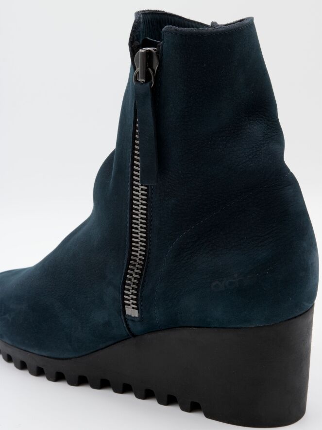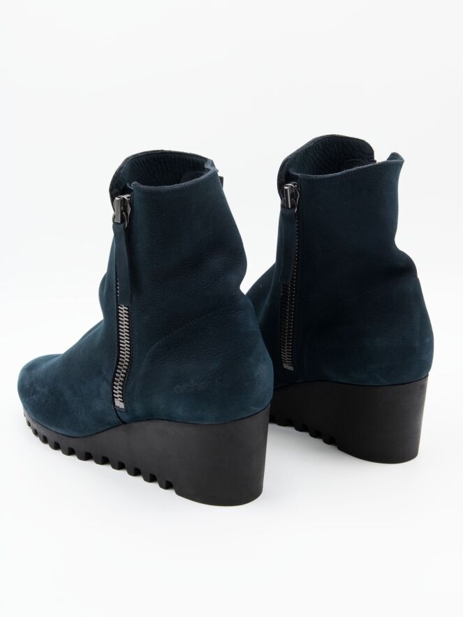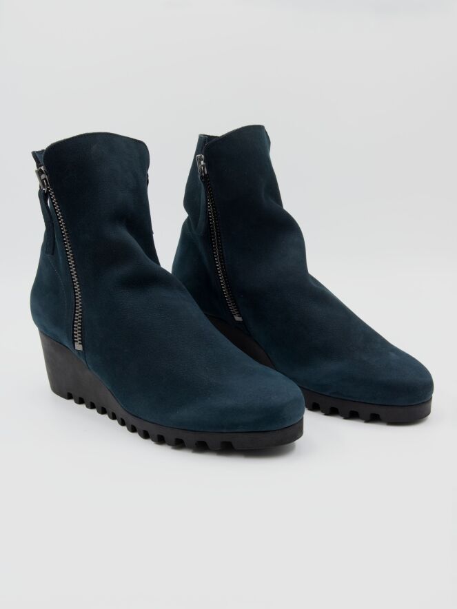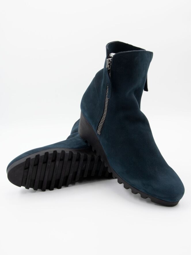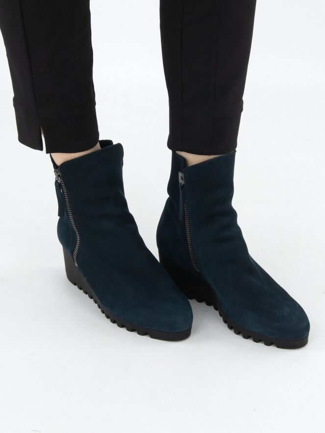 Ein Stiefelette auf einem Keilabsatz von der Marke Arche, aus sehr weichem Wildleder in Marineblau. Der Stiefel ist ungefüttert. An beiden Seiten des kurzen Schafts befindet sich ein Reißverschluss. Die Sohle ist sportlich gezackt.