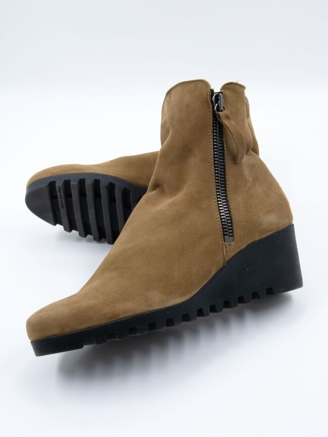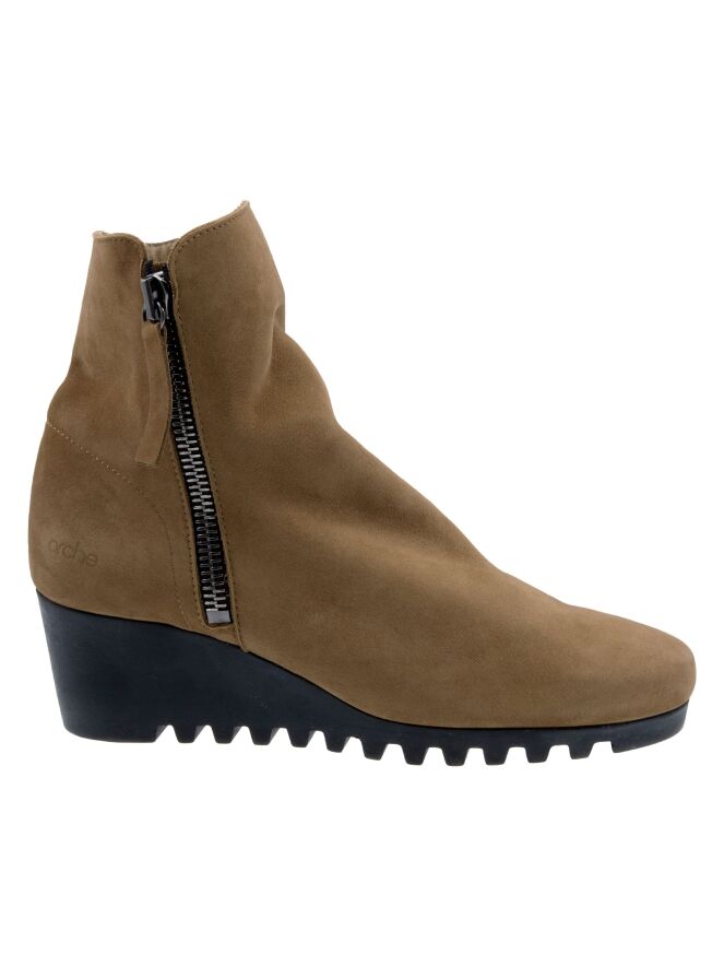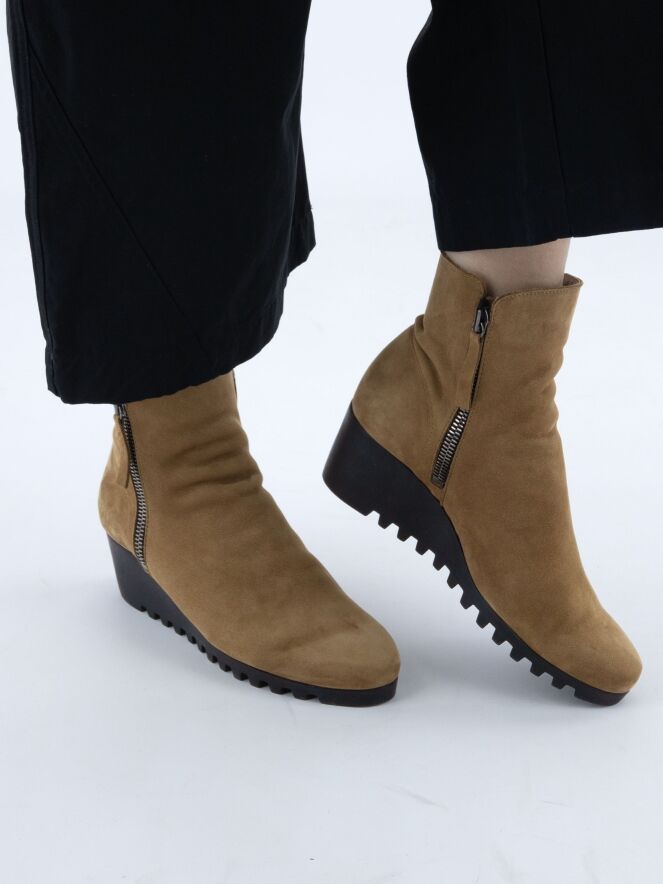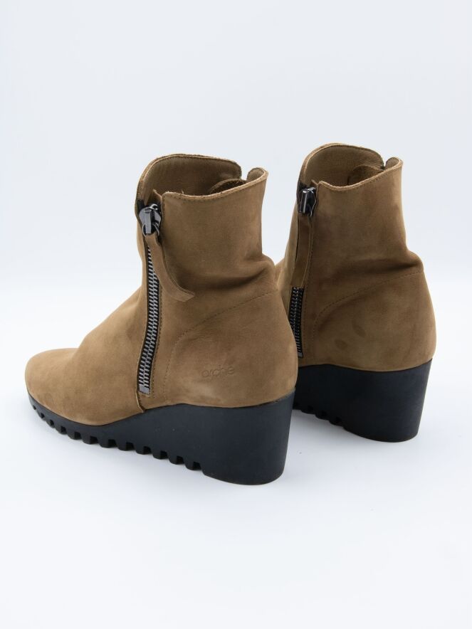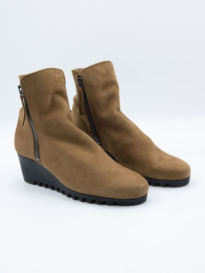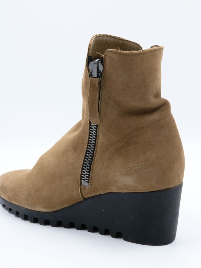 Ein Ankle Boot von Arche in der Farbe Camel. An beiden Seiten des Schafts befindet sich ein Reißverschluss. Die Latexsohle hat ein feines Blockprofil. Das Innere des Boots ist ungefüttert.