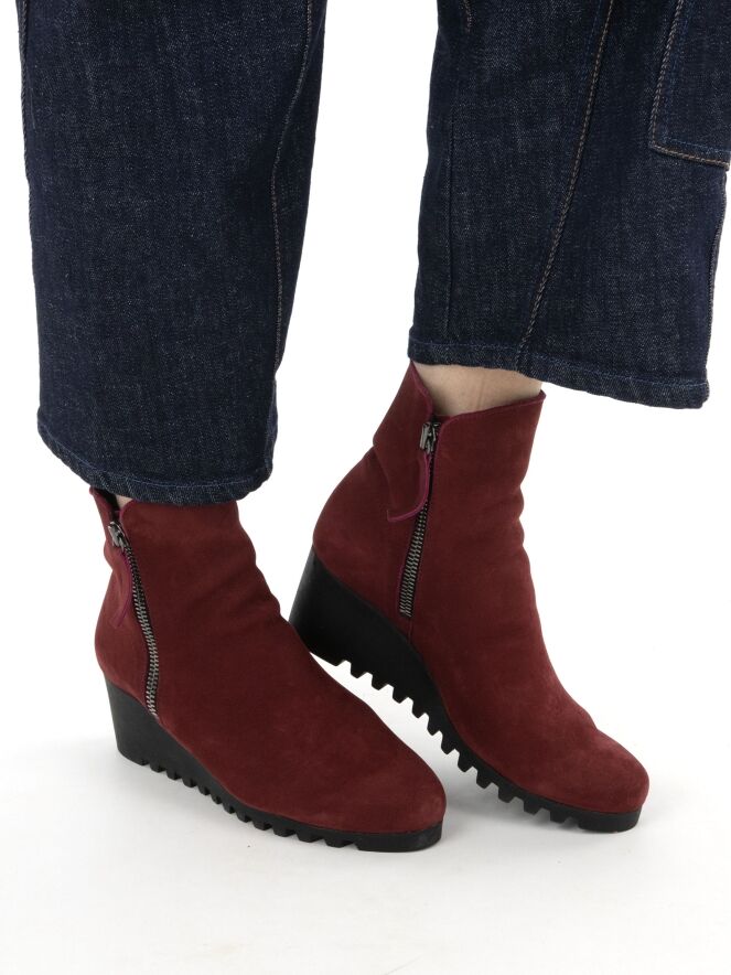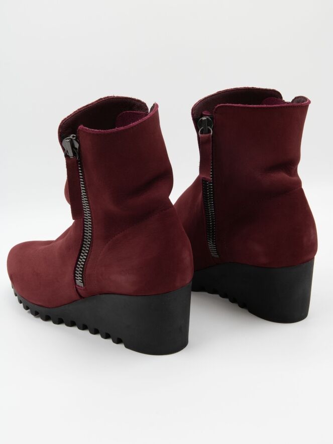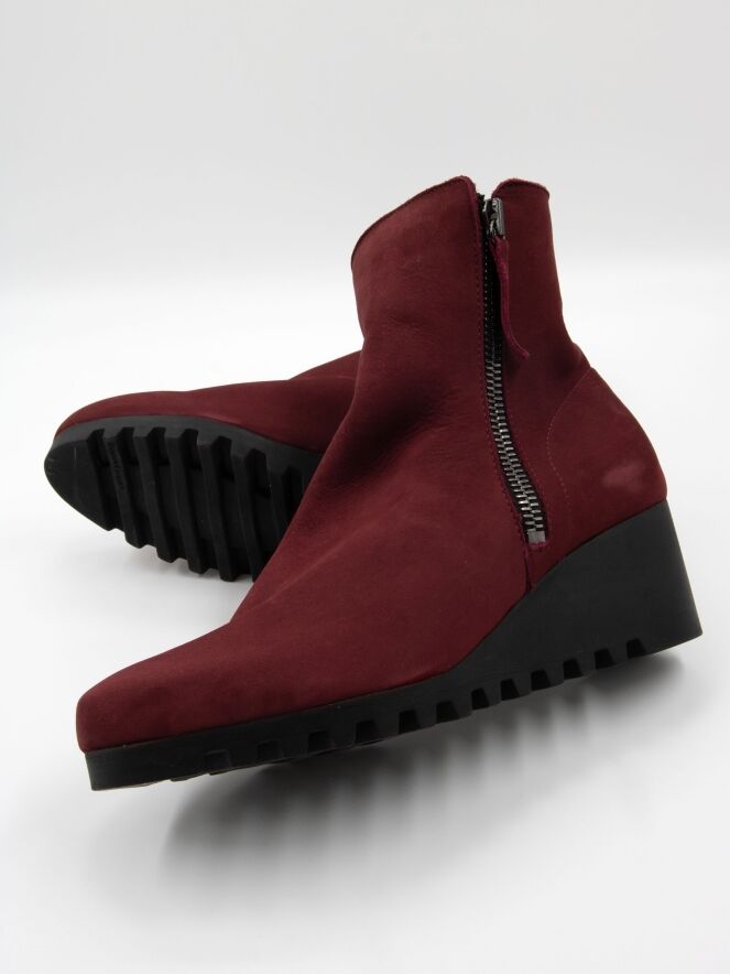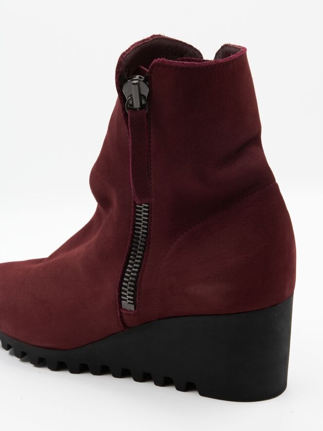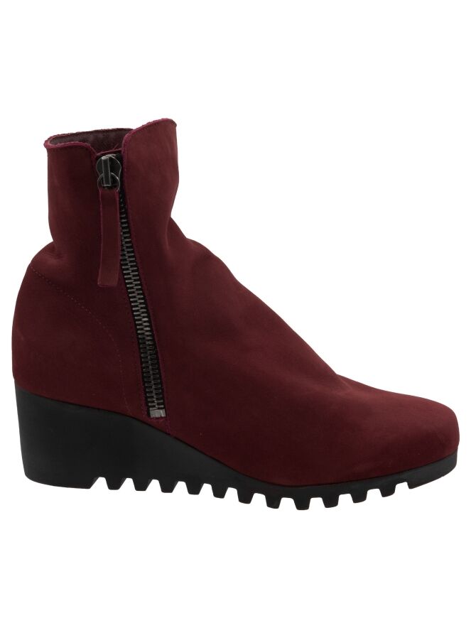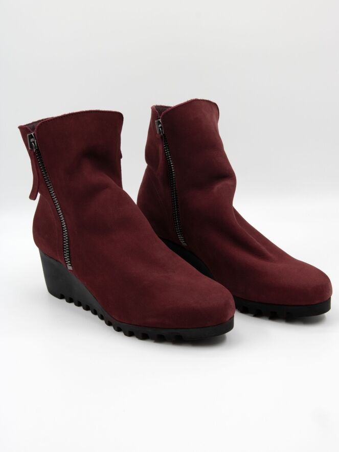 Ein knöchelhoher Stiefel von Arche in Bordeauxrot. An beiden Seiten des Schafts befindet sich ein Reißverschluss. Die Latexsohle hat ein feines, kariertes Profil. Das Innere des Stiefels ist ungefüttert.