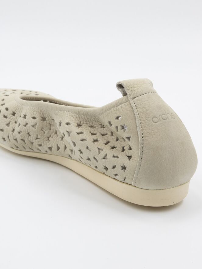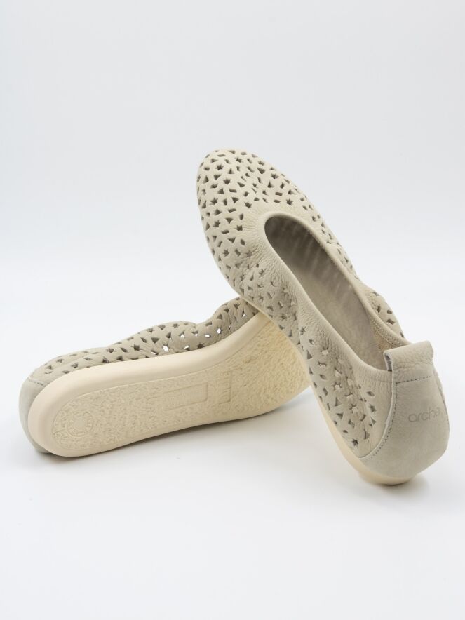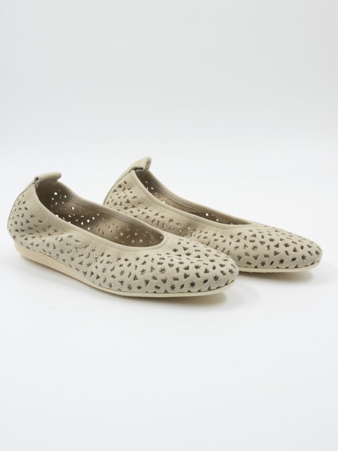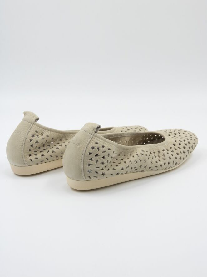 Ein Ballerina von Arche in Cremeweiß. Das Leder ist in mehreren Figuren perforiert, darunter Sterne und Dreiecke. Die Ballerina hat eine runde Spitze und ist ungefüttert.