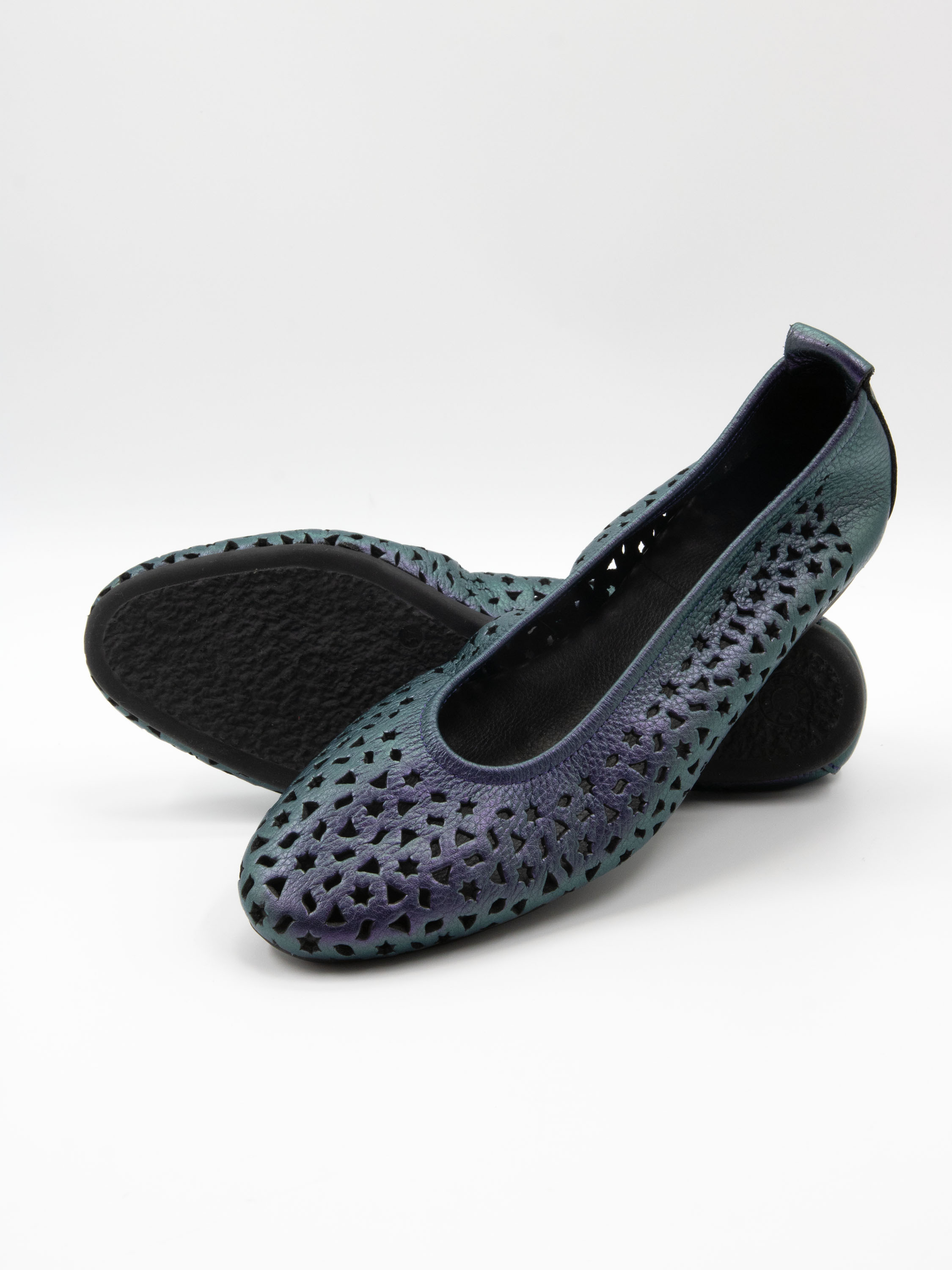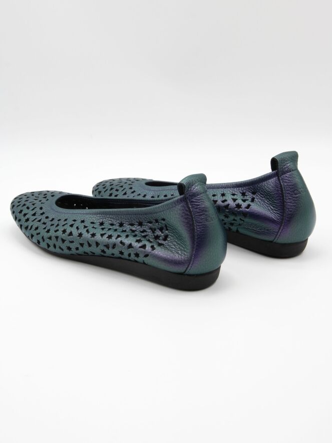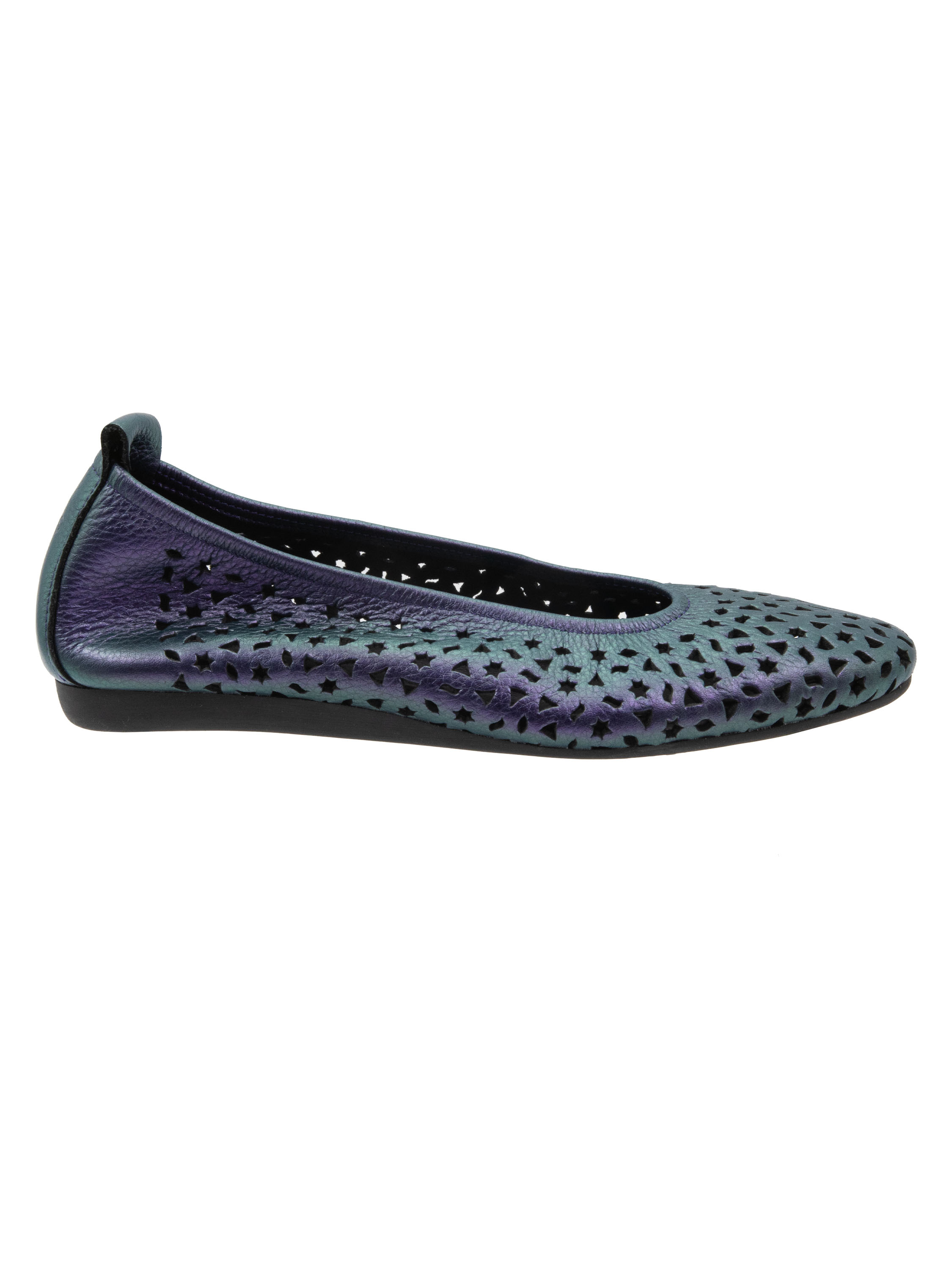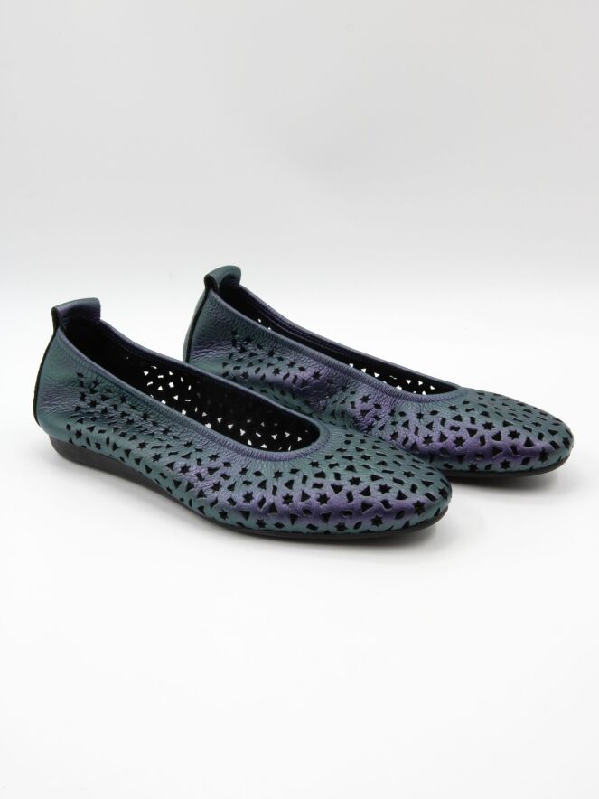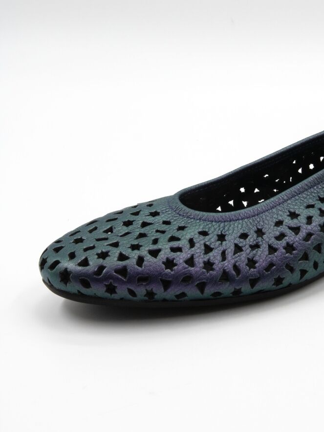 Ballerina von Arche in einem auffälligen Metallic-Lila. Das Leder ist fein perforiert mit verspielten Motiven wie Sternen und Dreiecken, was dem Modell eine luftige, moderne Ausstrahlung verleiht. Mit elegant rund geschnittener Spitze und ungefüttertem Inneren bietet sie besondere Geschmeidigkeit. Die flexible Latexsohle sorgt für optimale Dämpfung, während der leicht erhöhte hintere Sohlenbereich zusätzlichen Komfort bietet.