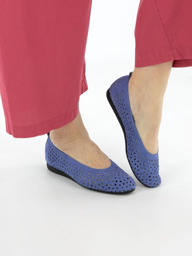 Ballerina von Arche in einem zarten Lavendelton. Das Nubukleder ist mit verschiedenen Motiven, darunter kleine Sterne und Dreiecke, perforiert und verleiht dem Modell eine verspielte, zugleich elegante Note. Mit rund geschnittener Spitze und ungefüttertem Inneren bietet sie besondere Geschmeidigkeit und ein natürliches Tragegefühl. Die flexible Latexsohle sorgt für optimale Dämpfung, während der leicht erhöhte hintere Sohlenbereich zusätzlichen Komfort bietet.