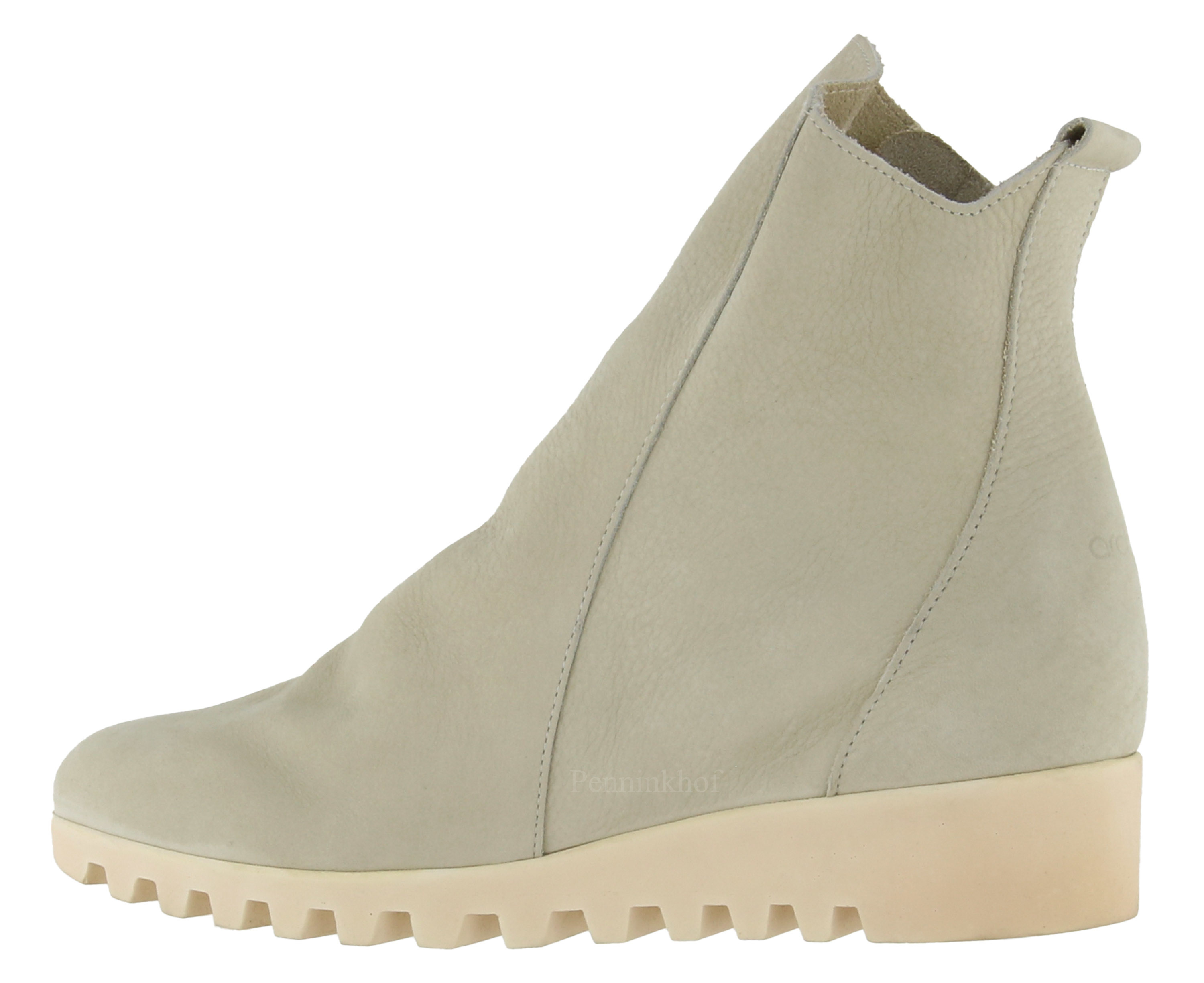 Eine kurze Stiefelette der Schuhmarke Arche in Cremeweiß. Auf der Außenseite befindet sich ein silberfarbener Reißverschluss. Die Sohle ist gezackt. Die Stiefelette ist vorne abgerundet und nicht gefüttert.