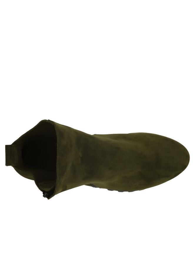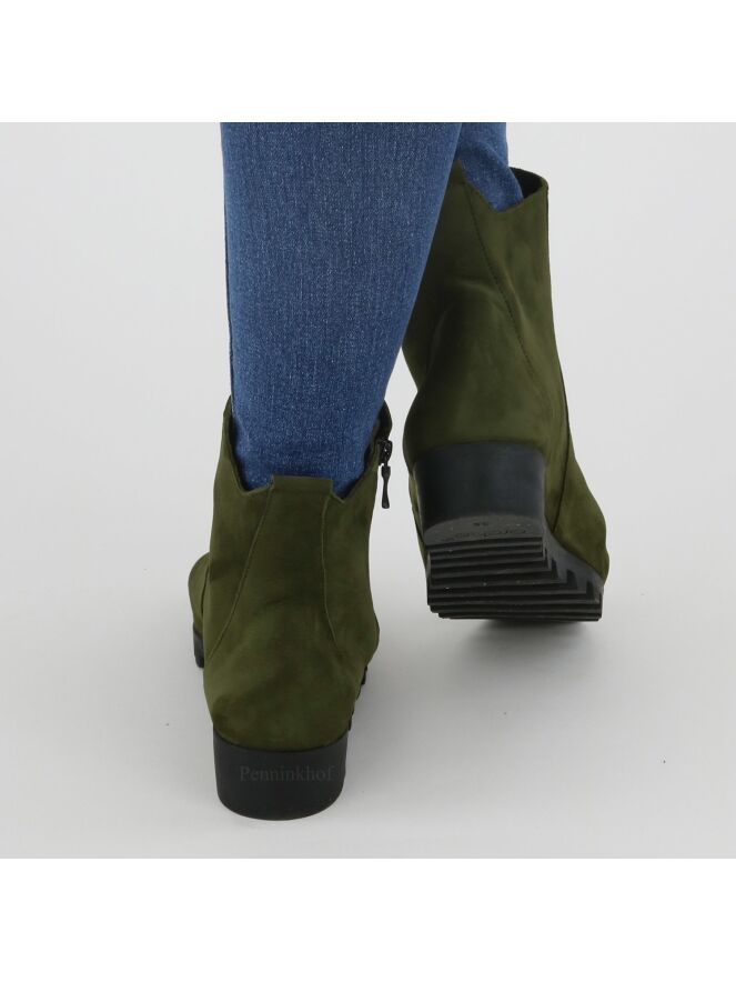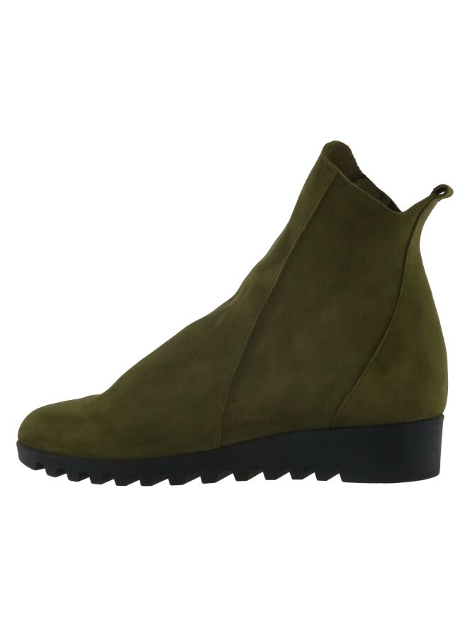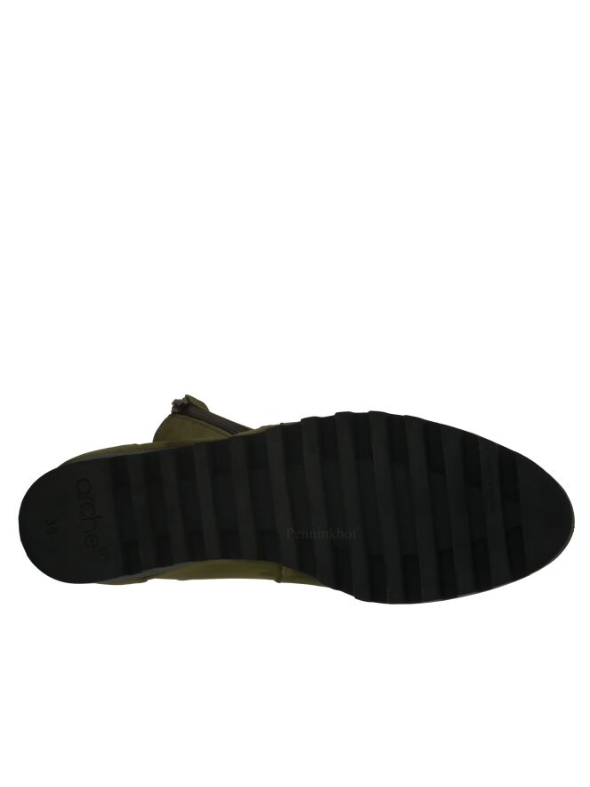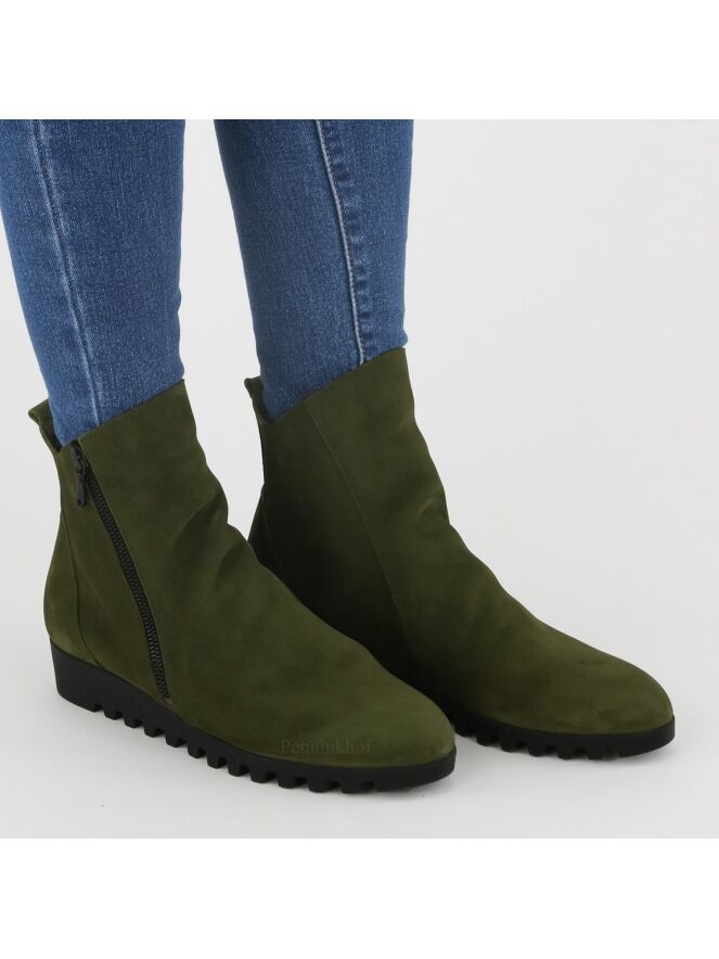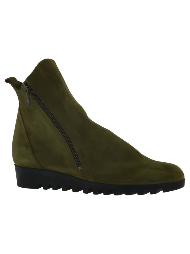 Eine kurze Stiefelette der Schuhmarke Arche in Grün. An der Außenseite befindet sich ein schwarzer Reißverschluss. Die Sohle ist gezackt. Die Stiefelette ist vorne abgerundet und nicht gefüttert.