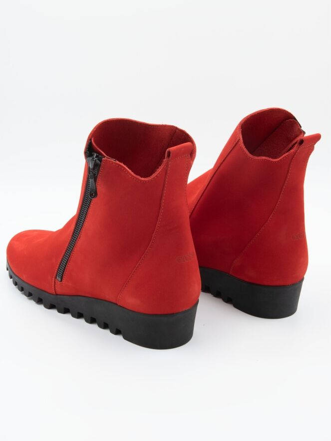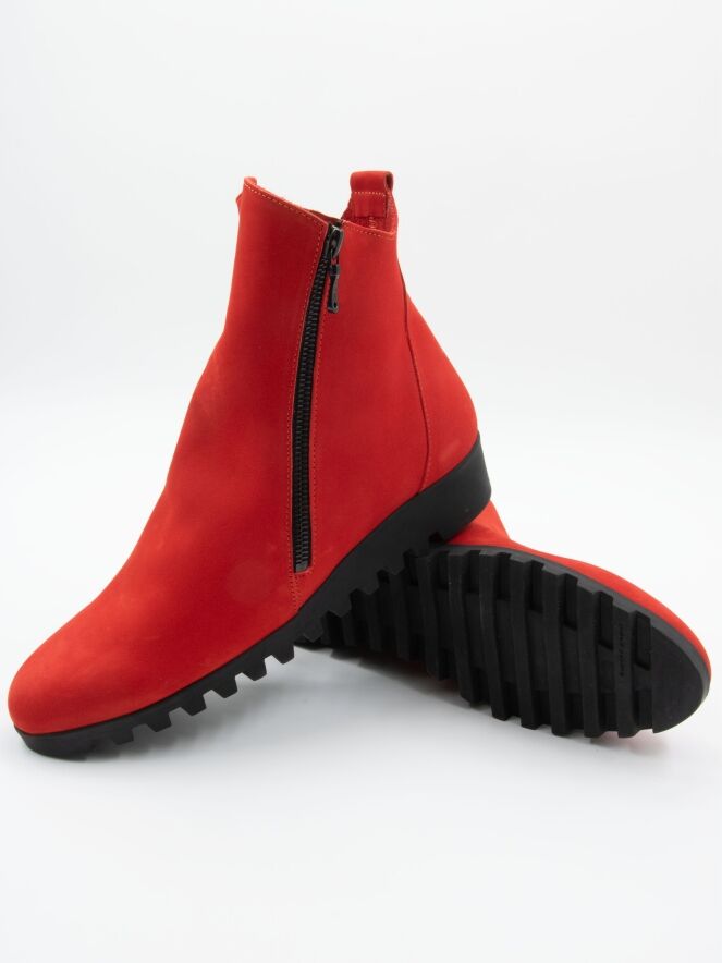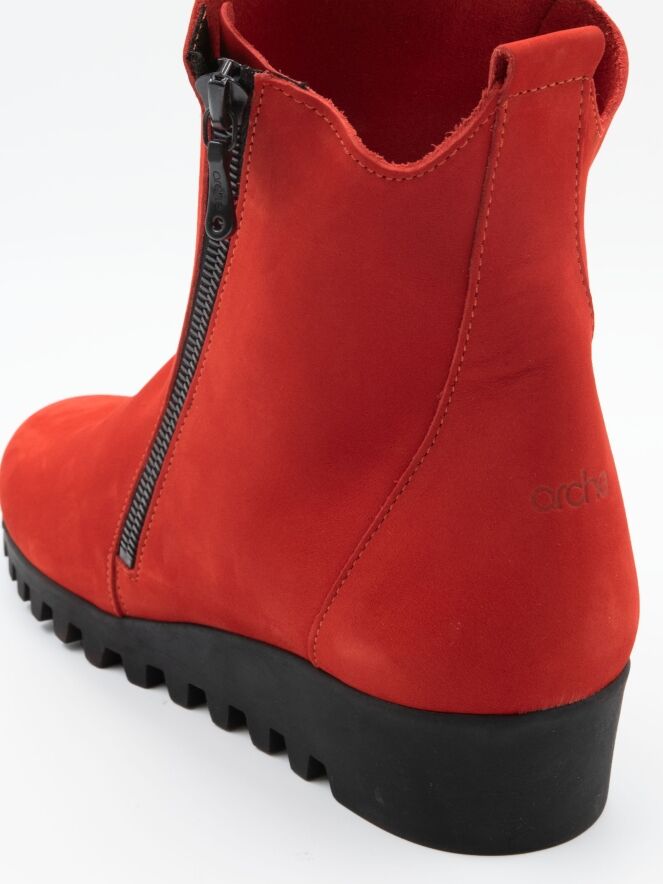 Eine Stiefelette von Arche in leuchtendem Rot. An der Außenseite ist ein schwarzer Reißverschluss. Die Sohle ist geriffelt. Der Stiefel hat eine runde Nase und die Innenseite ist ungefüttert.