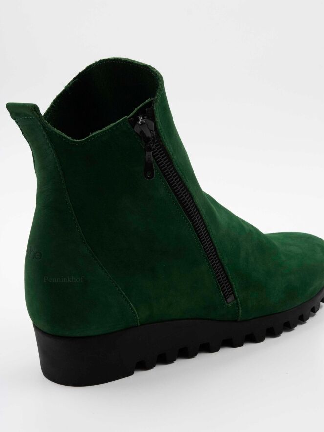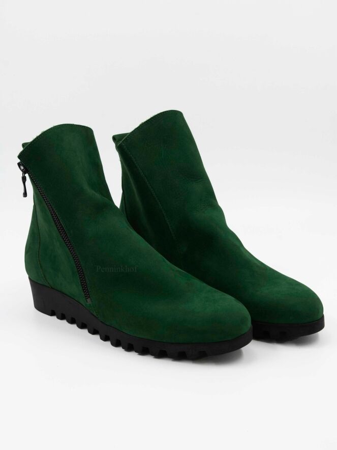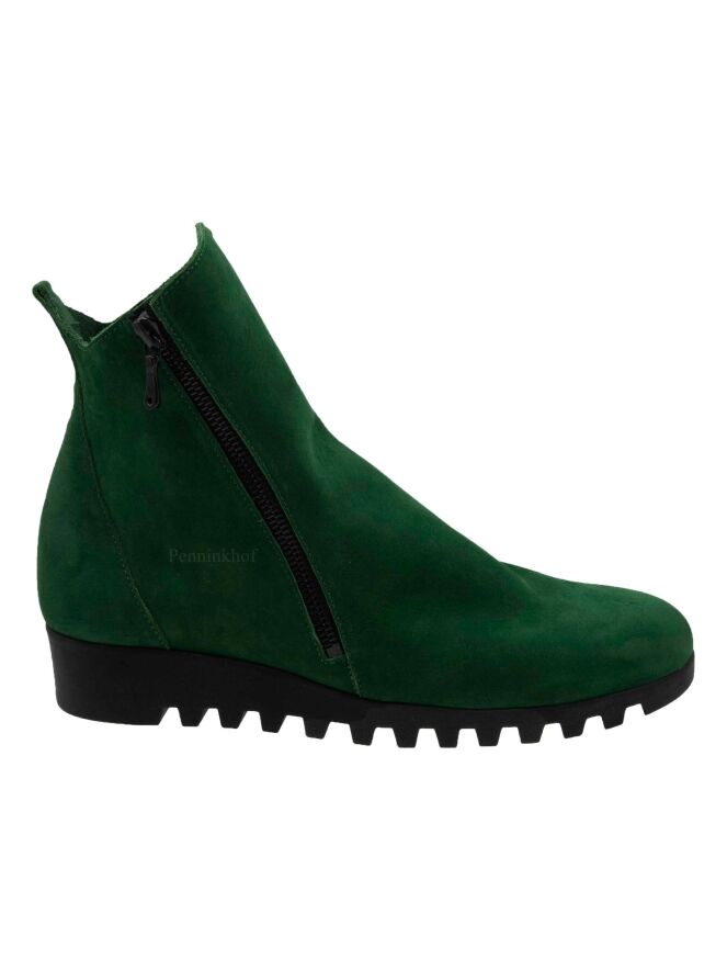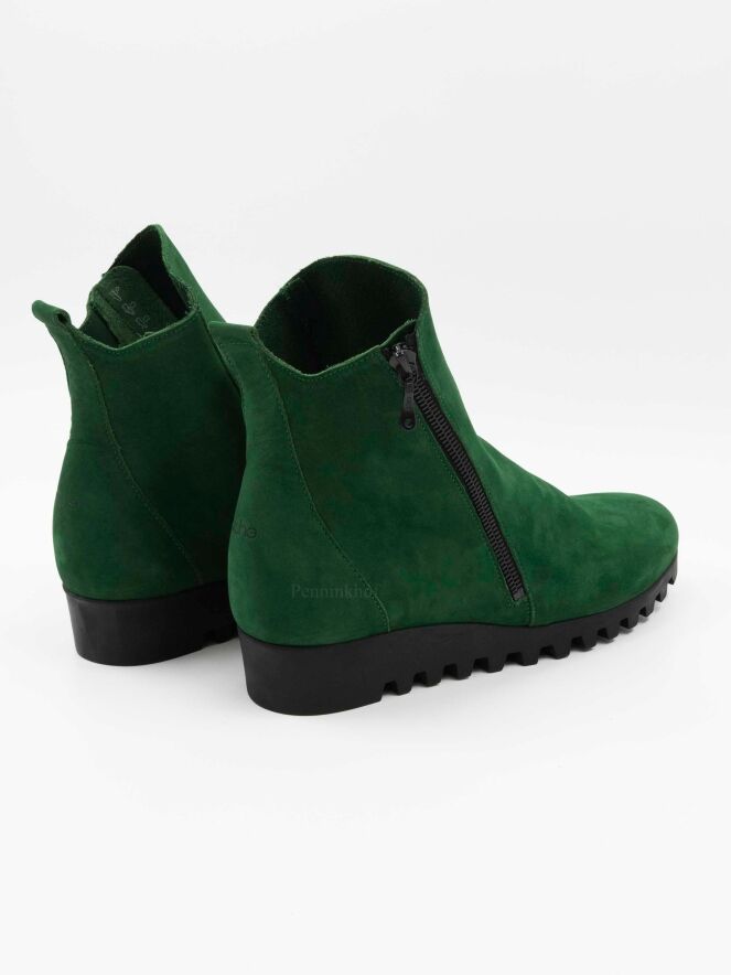 Eine kurze Stiefelette von Arche in der Farbe grün. An der Außenseite befindet sich ein Reißverschluss. Die Sohle ist gerippt. Der Stiefel hat eine runde Nase und die Innenseite ist ungefüttert.