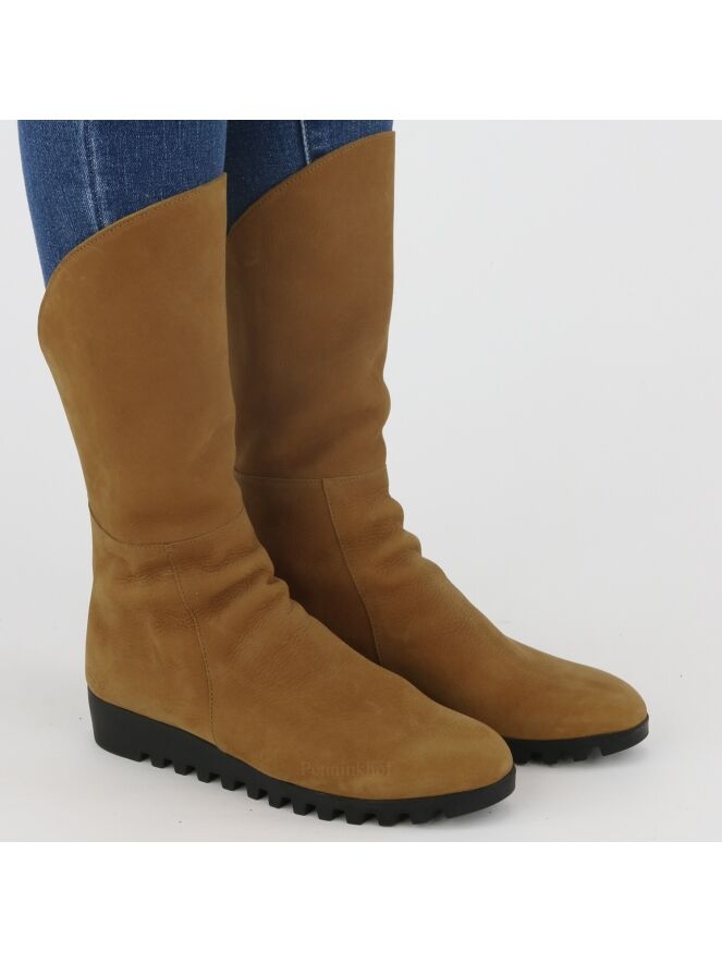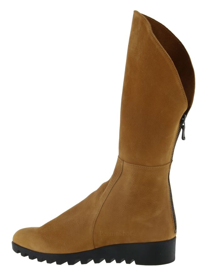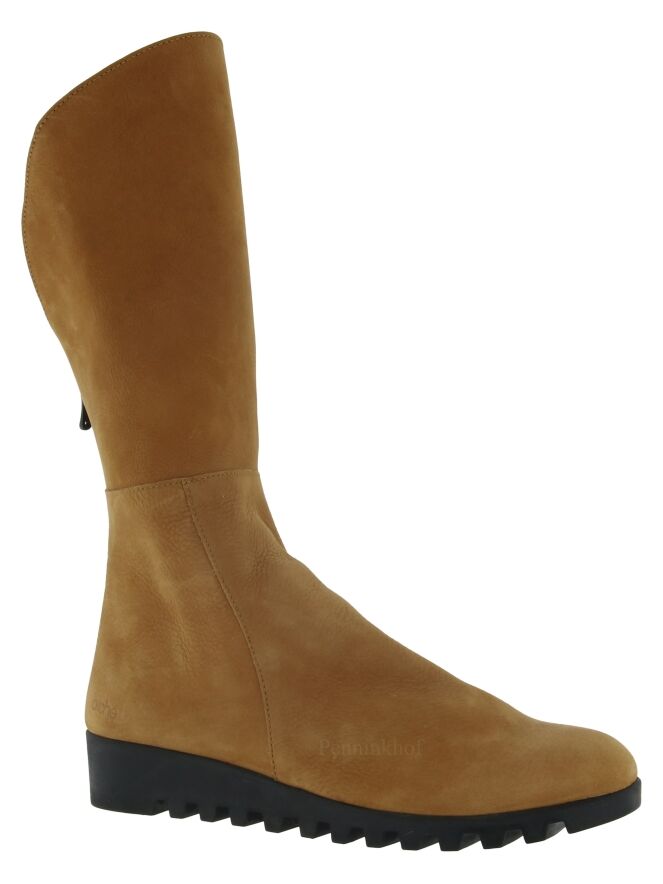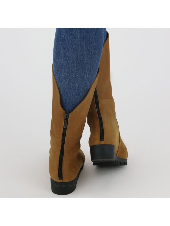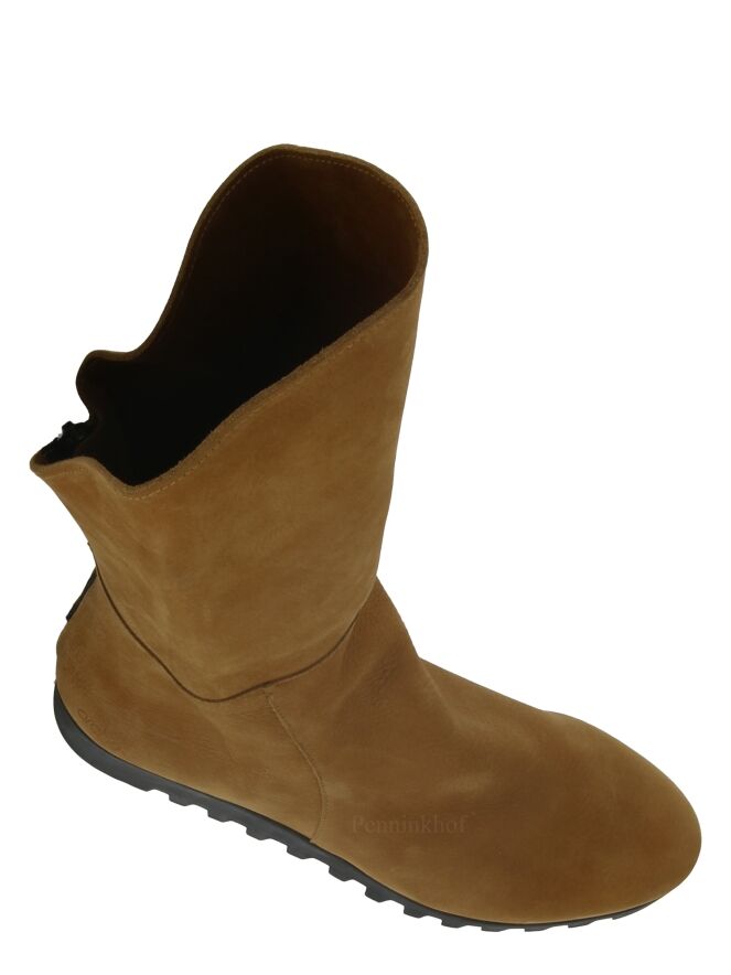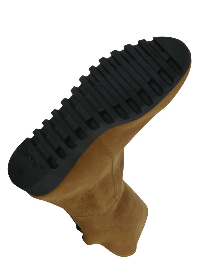 Ein halbhoher Stiefel der Schuhmarke Arche in Cognac. Der Stiefel hat eine gezackte schwarze Sohle. Auf der Rückseite befindet sich ein schwarzer Reißverschluss. Die Vorderseite des Schaftes ist 14 cm höher als die Rückseite. Die Innenseite des Schaftes ist ungefüttert.