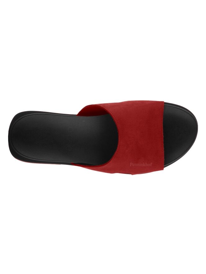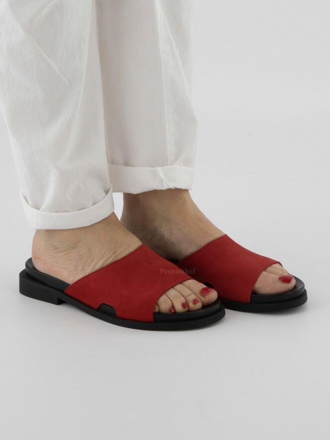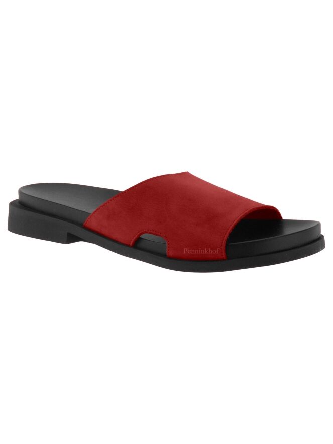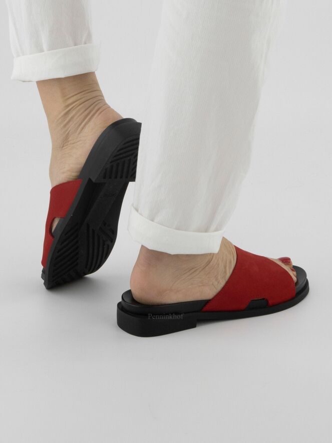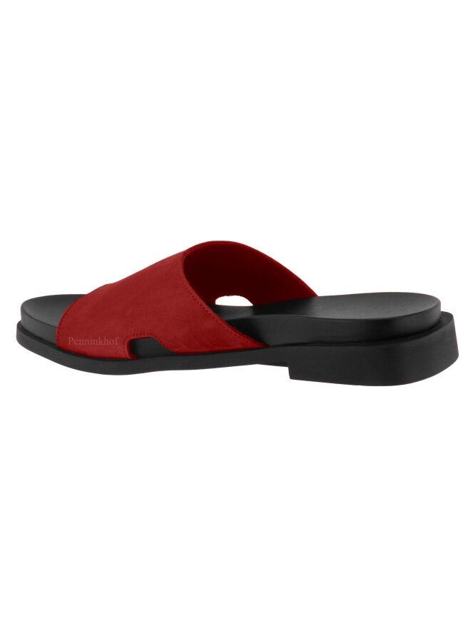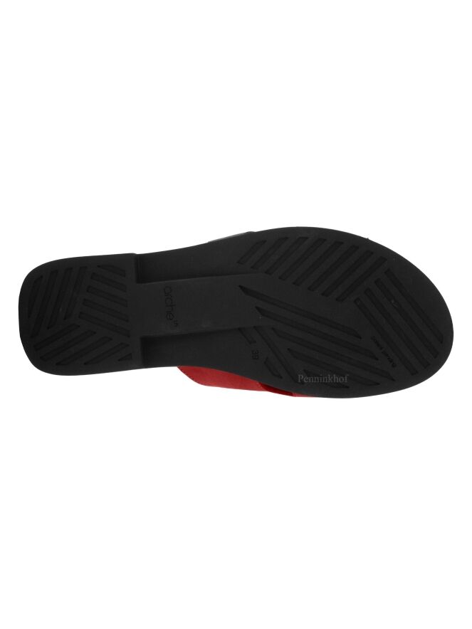 Ein roter Slipper der Schuhmarke Arche. Auf der Latexsohle befindet sich ein weiches Fußbett. Auf beiden Seiten des Slippers befindet sich eine kleine Öffnung.