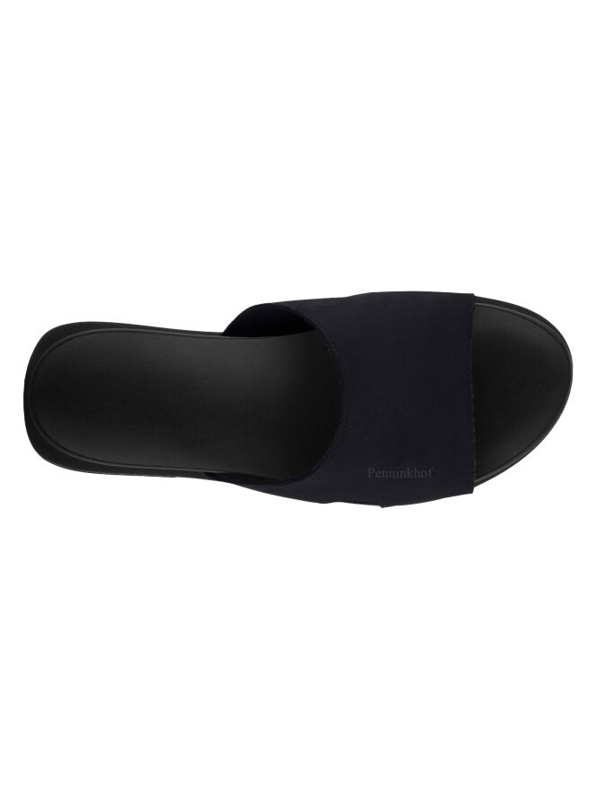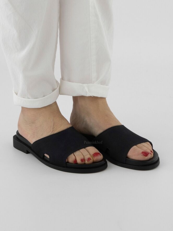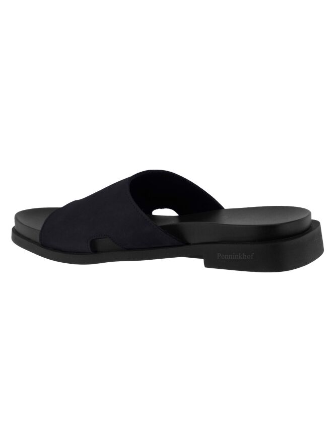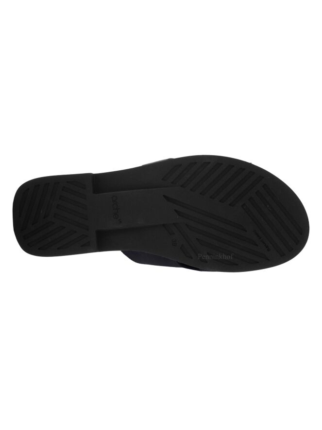 Ein marineblauer Slipper der Schuhmarke Arche. Auf der Latexsohle befindet sich ein weiches Fußbett. Auf beiden Seiten des Slippers befindet sich eine kleine Öffnung.