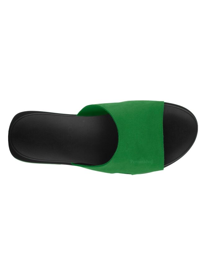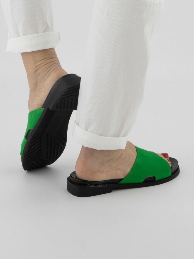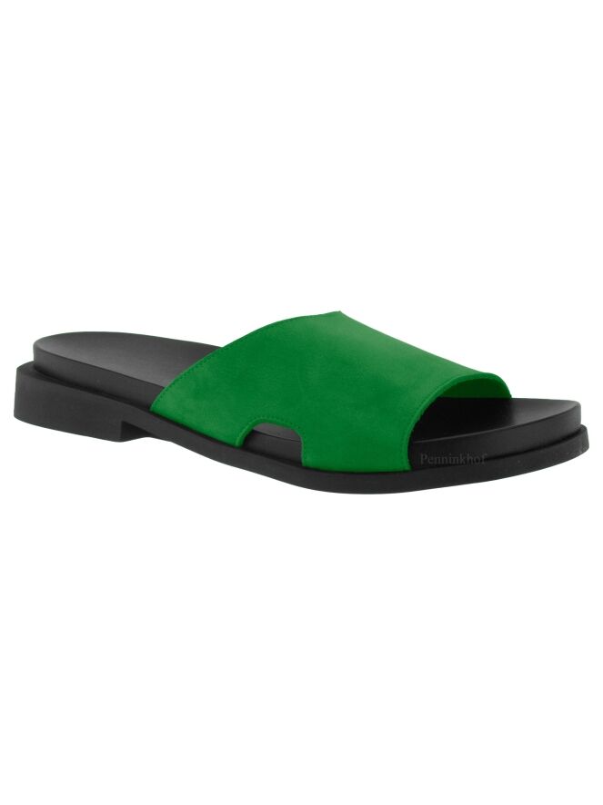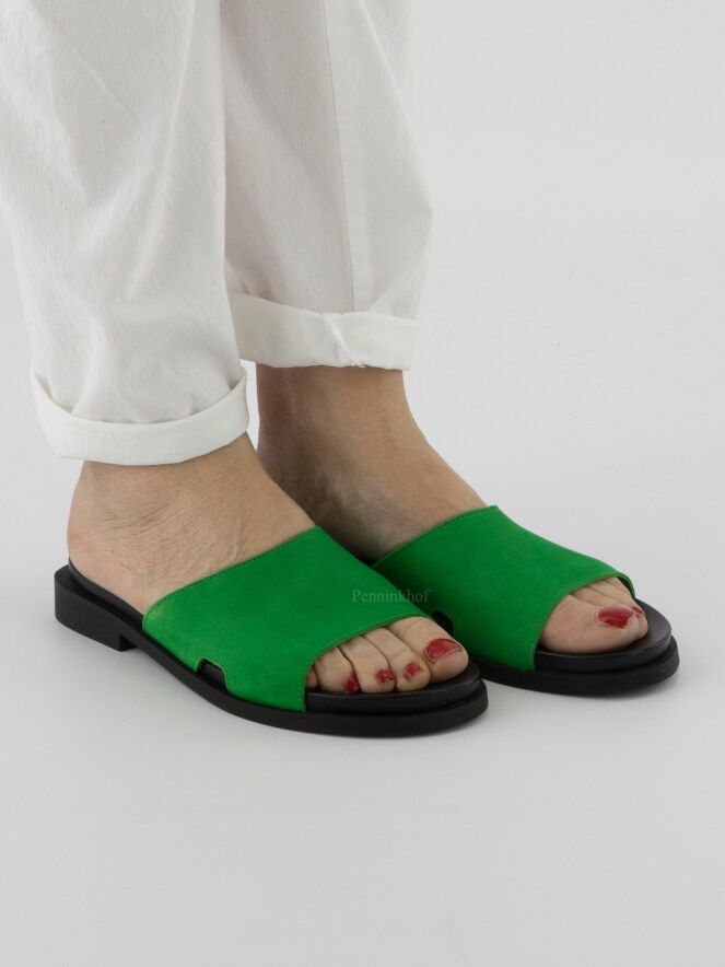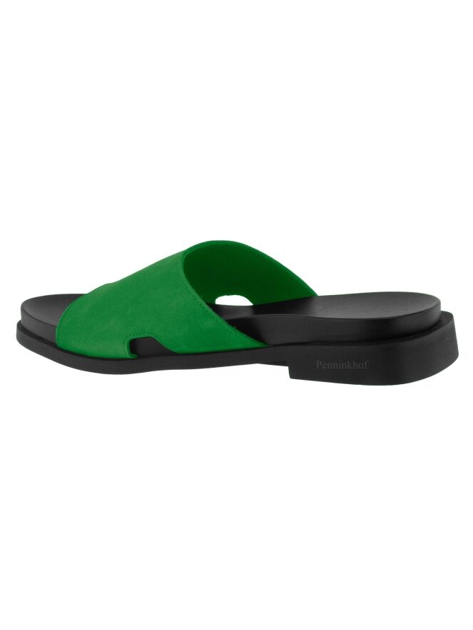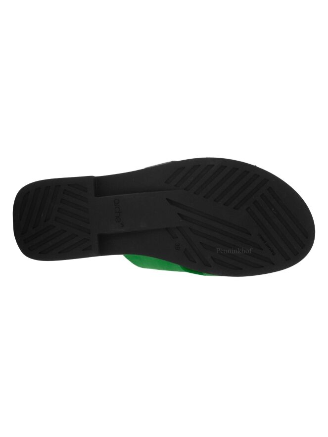 Ein grüner Slipper der Schuhmarke Arche. Auf der Latexsohle befindet sich ein weiches Fußbett. Auf beiden Seiten des Slippers befindet sich eine kleine Öffnung.