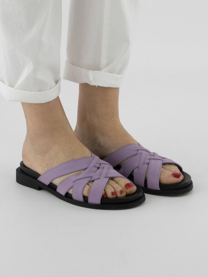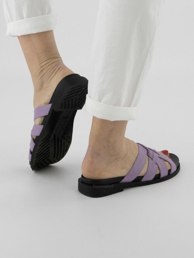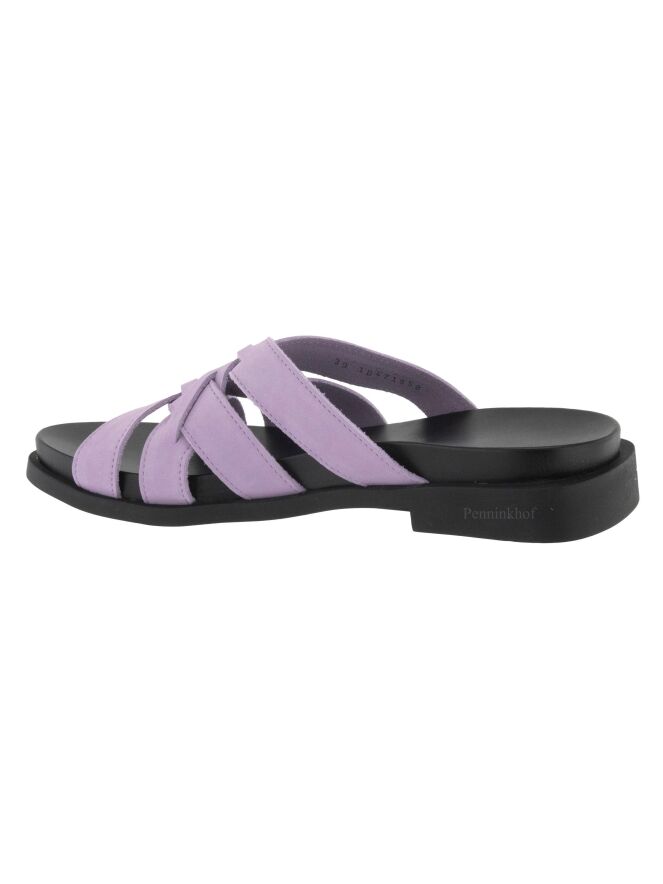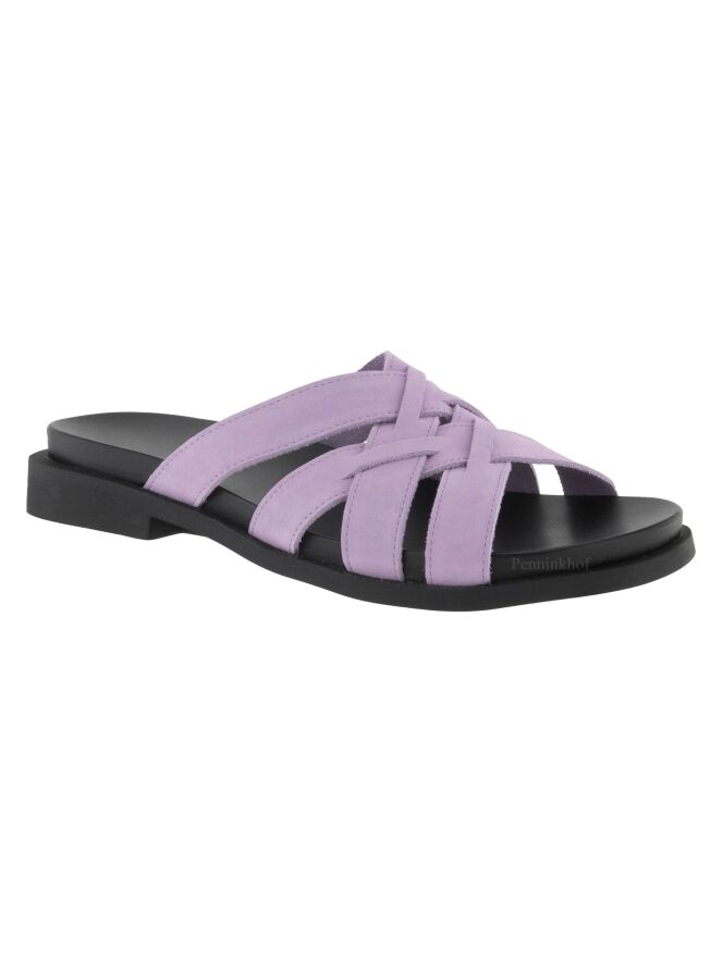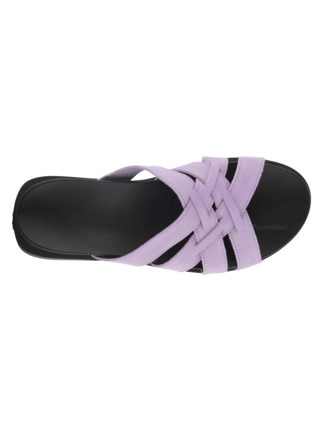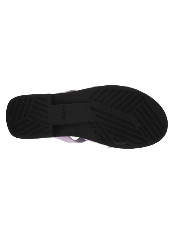 Ein lila Slipper der Schuhmarke Arche. Auf der Latexsohle befindet sich ein weiches Fußbett. Auf dem vorderen Fußteil sind vier gekreuzte Riemen aus Nubukleder.