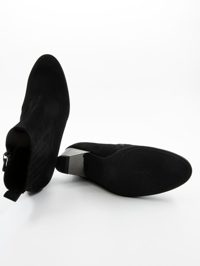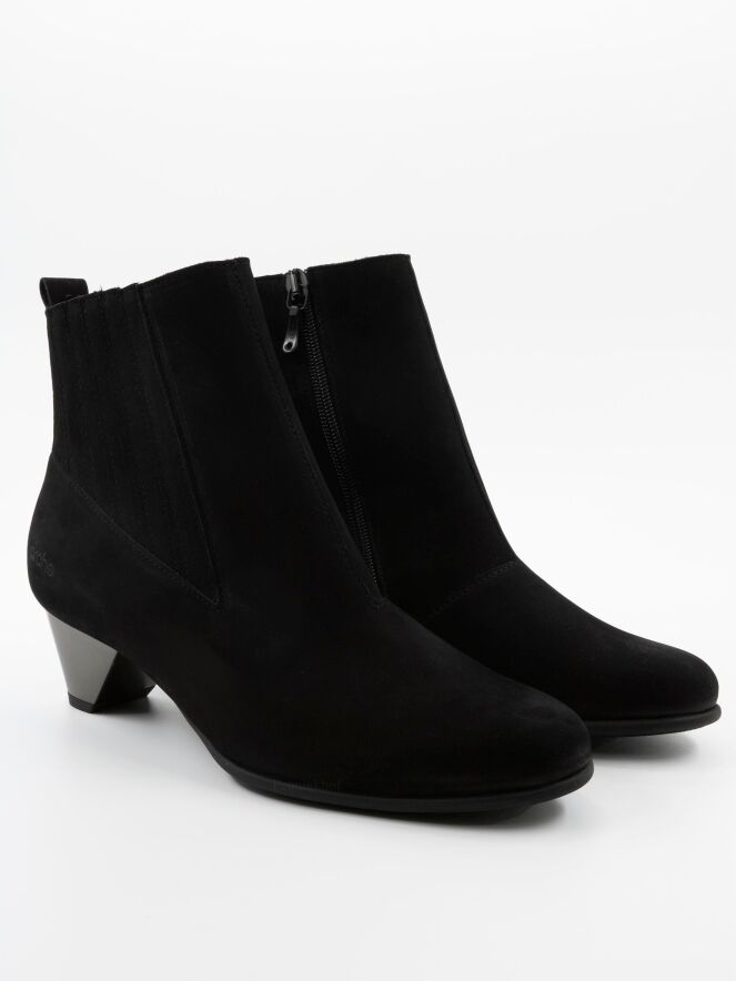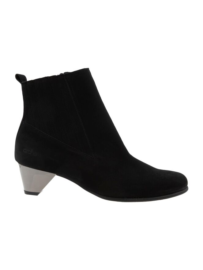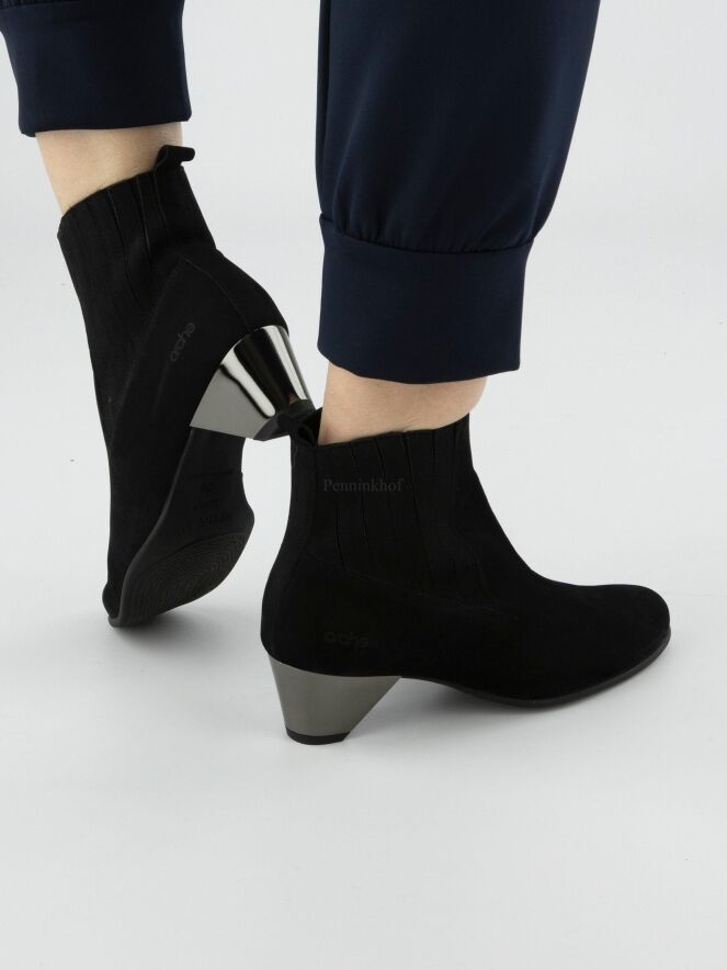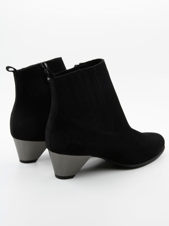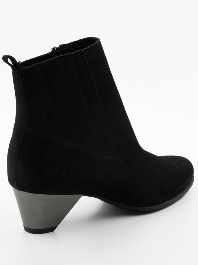 Eine kurze Stiefelette von Arche in der Farbe Schwarz. Die Außenseite des Schafts hat vertikale Einschnitte, hinter denen ein elastischer Stoff eingearbeitet ist. An der Innenseite des Schafts befindet sich ein Reißverschluss. Der kurze Metallabsatz ist in einer Nickelfarbe. Die Innenseite ist ungefüttert.