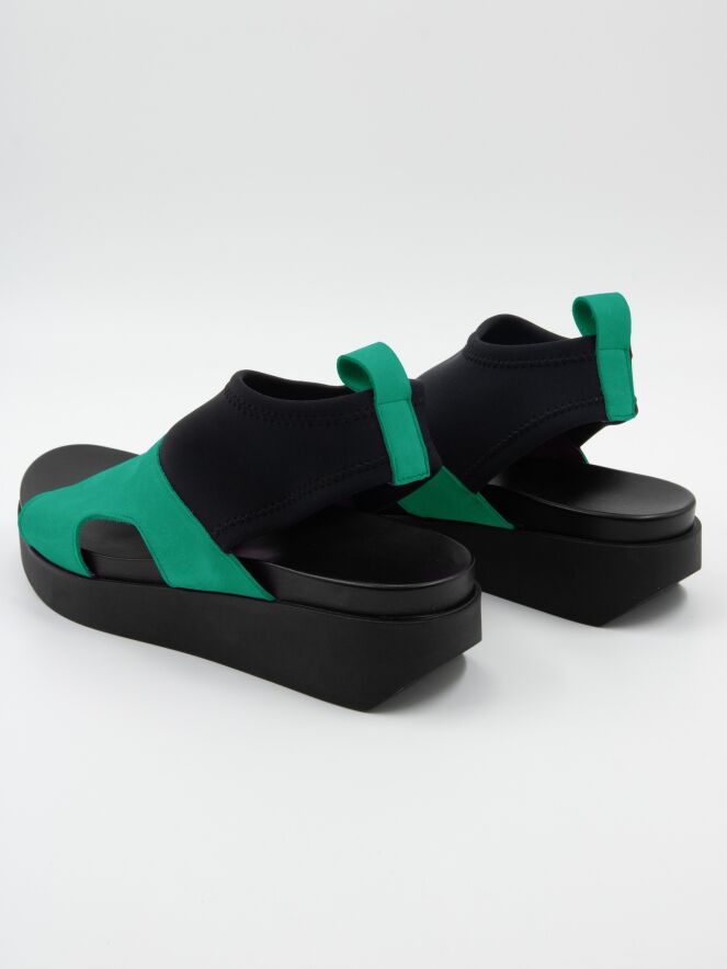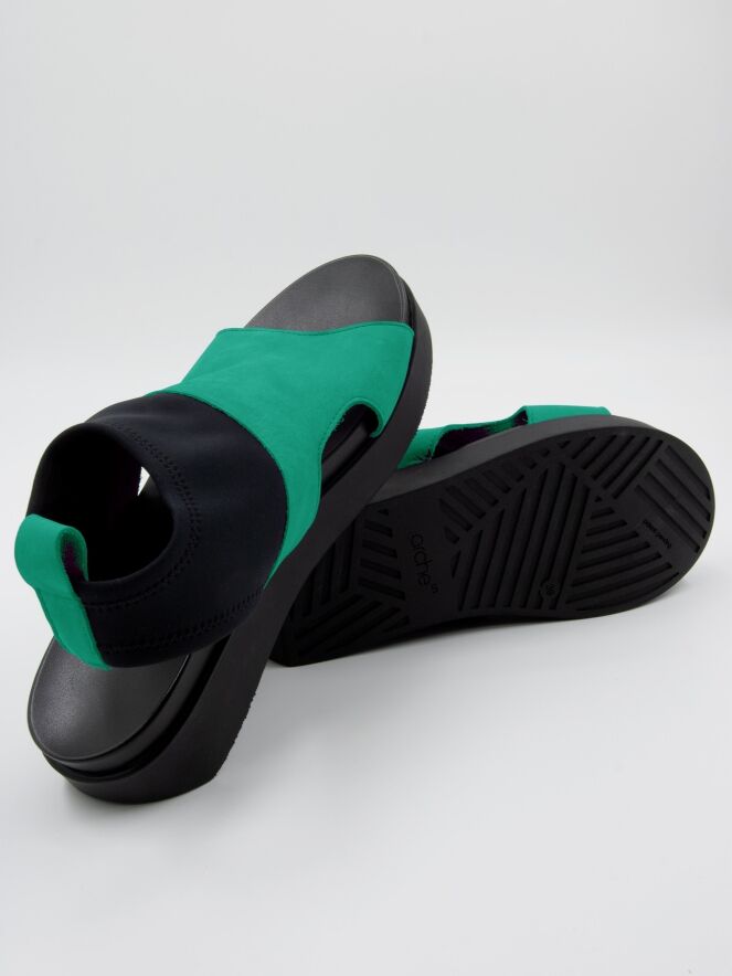 Eine Sandale von Arche mit einer Plateausohle in Türkis. Vom oberen Teil des Vorderfußes bis zum Knöchel befindet sich ein schwarzer elastischer Stoff.